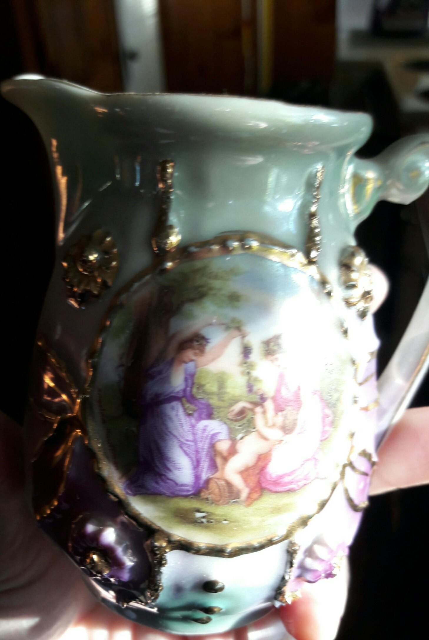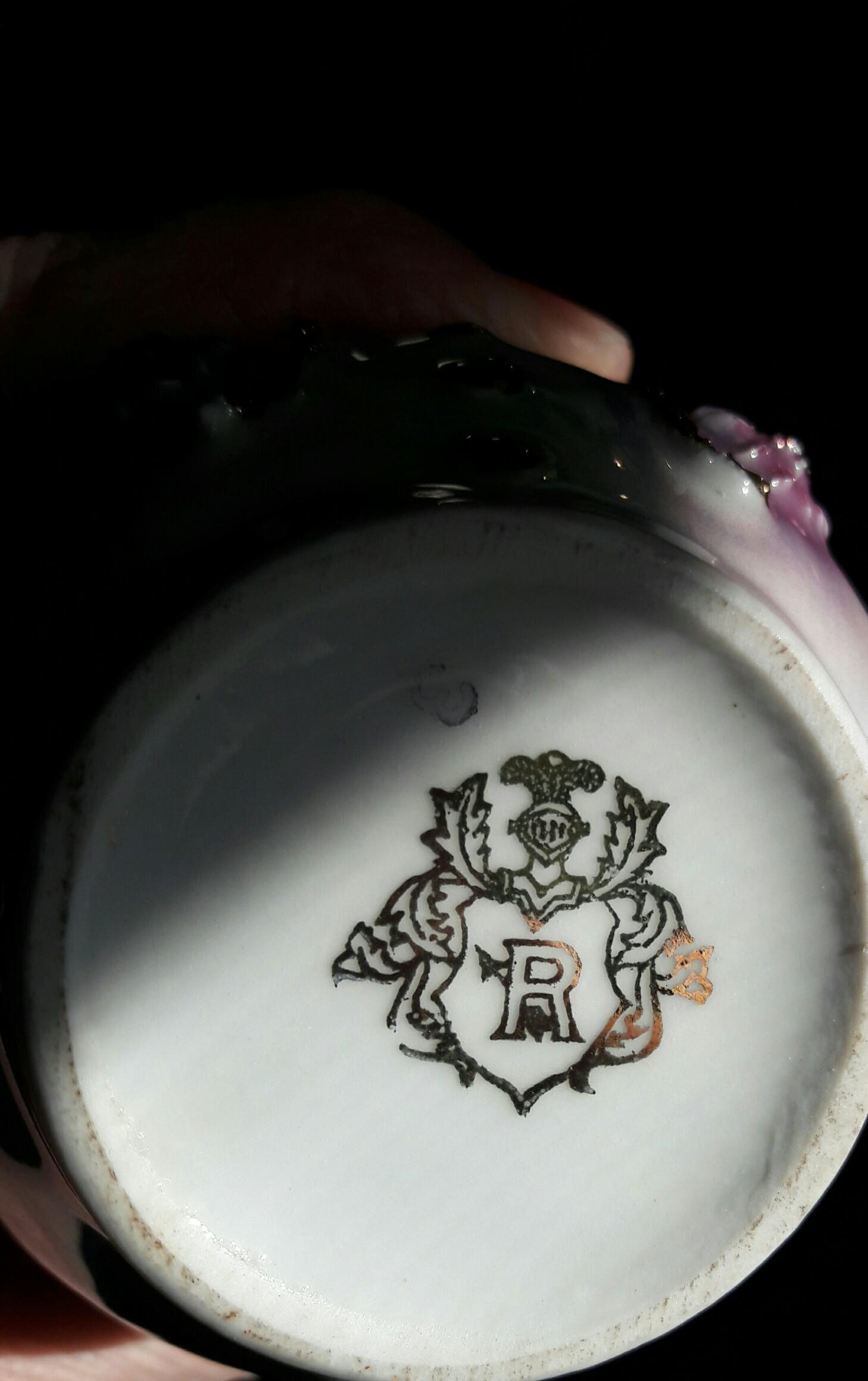 I inherited this tea set from a great-great aunt. 8 pieces tea pot, creamer, sugar 5 cups/saucers. It looks to be porcelain, the photo is a lemoges of"Goddesses in the Garden" by Angelica Kauffman. I need help identifying the makers mark, Can anyone help me?