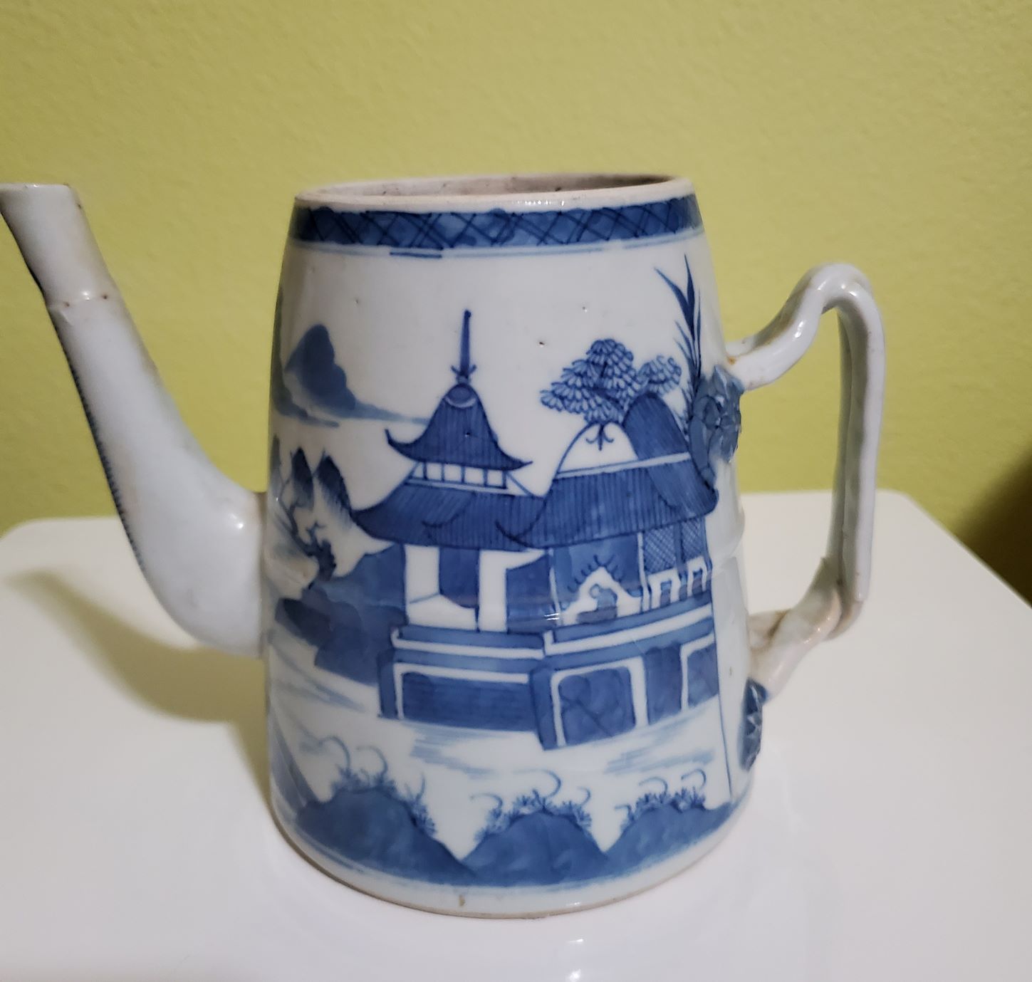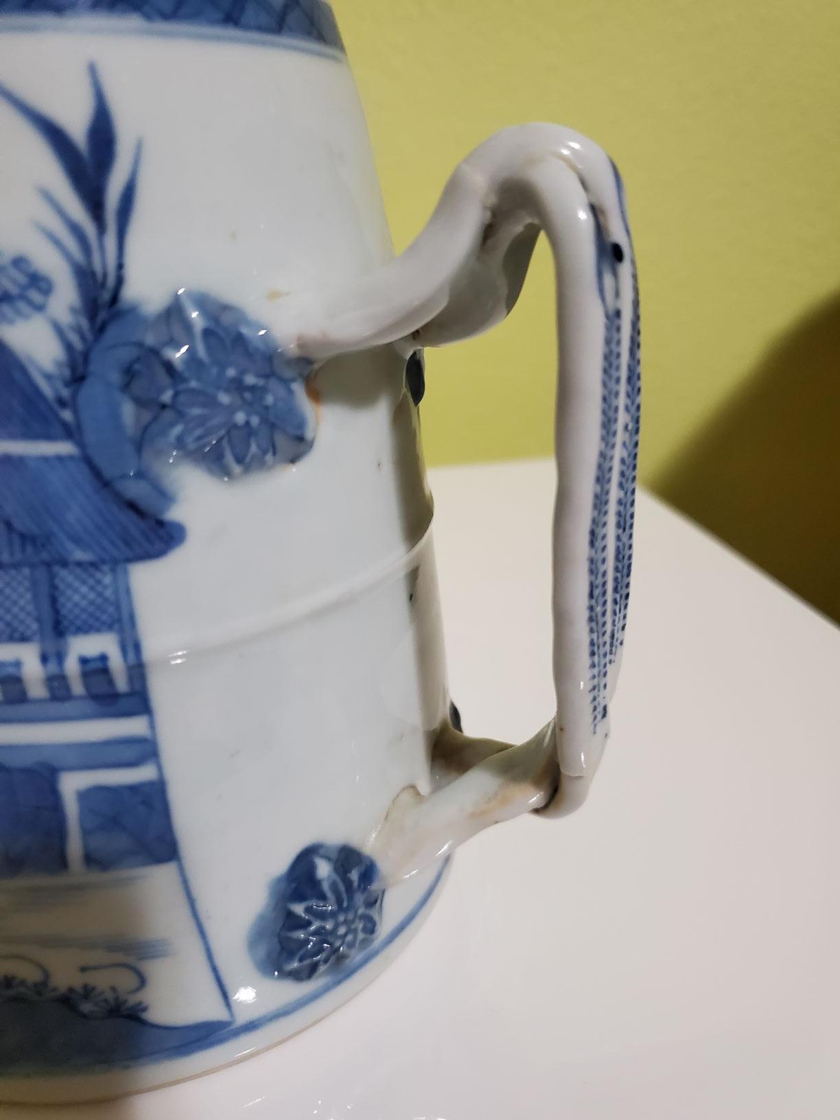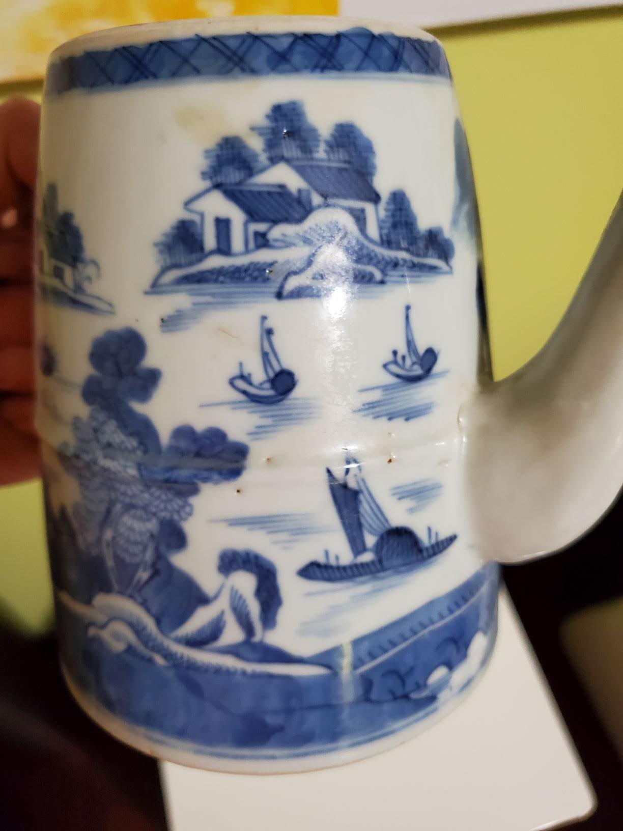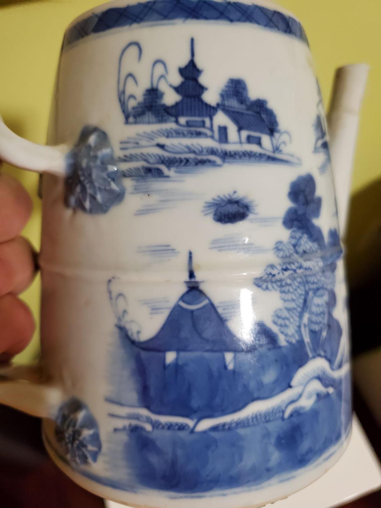 Hello, I need help identifying who made this teapot and what period and if it has any value. The teapot is missing the lid and its handle was cracked and fixed. It does not have markings. Thank you!