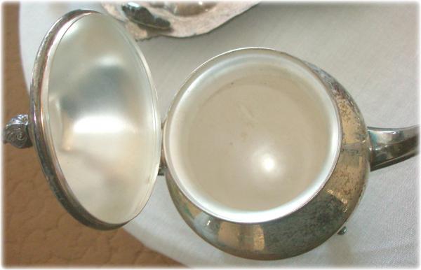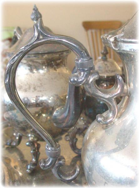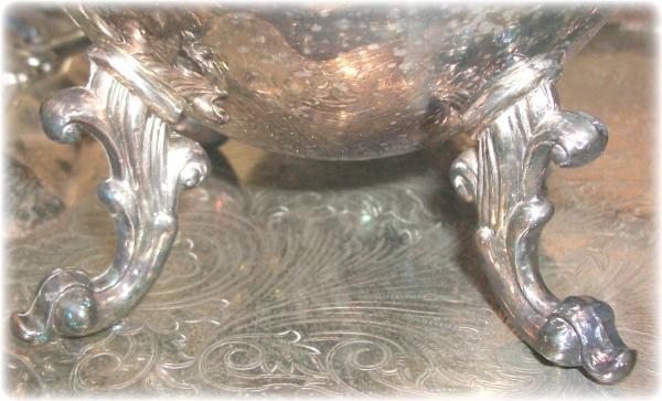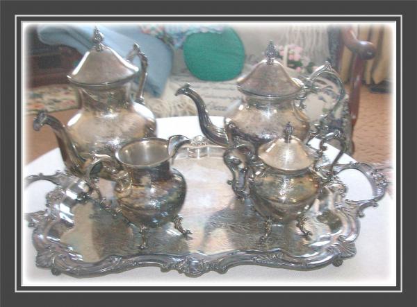 Needs polished but no flaws. The pattern is not the grape finials. Set is original Coffee pot, Tea pot, covered sugar, creamer, tray all footed. Displayed only, never used to serve. I need to know pattern, when it was manufactured? silver over copper was stopped in the 1940's. What would be the aprox. sale price?