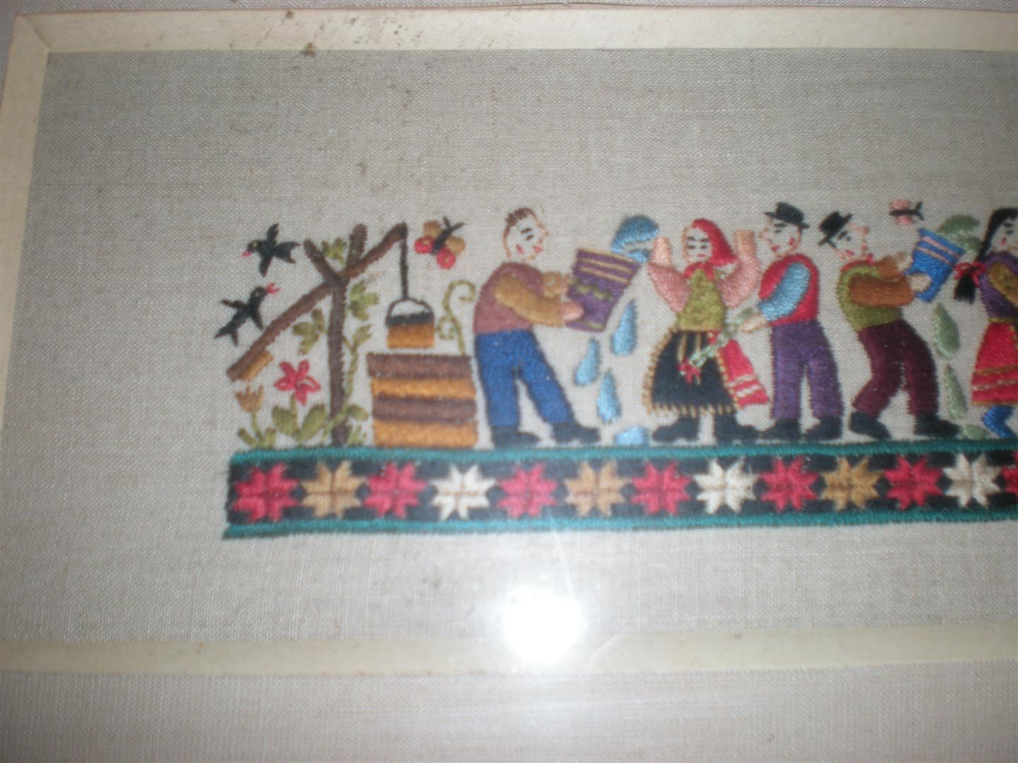 This needlepoint depicts a water well, crows, peasant men and women, eggs, pitchers with a star border along the bottom. Colors are vivid - reds, blues, blacks, golds, purples, etc. I do not know anything about the history of it, but would love to know more. I bought it at an estate sale in Granbury, TX, but the woman to whom it belonged had traveled extensively. The family did not know anything about it.