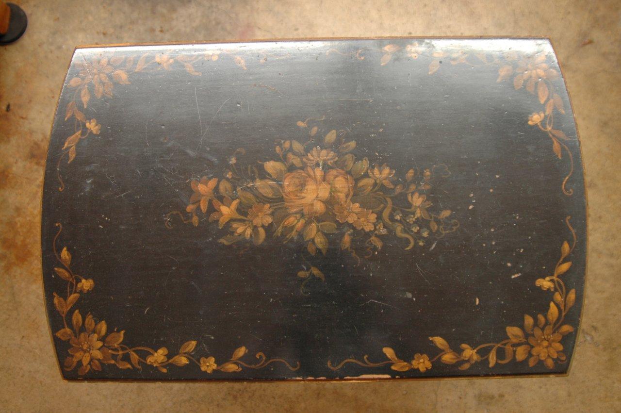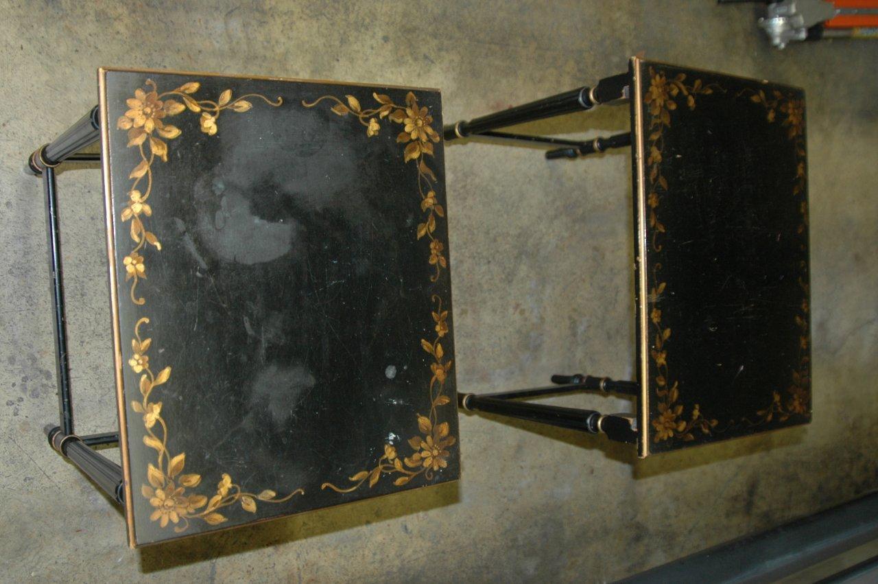 They appear to be painted a glossy black, with gold and green coloring in the flowers. There are also gold edges as well as gold accents on the table legs.