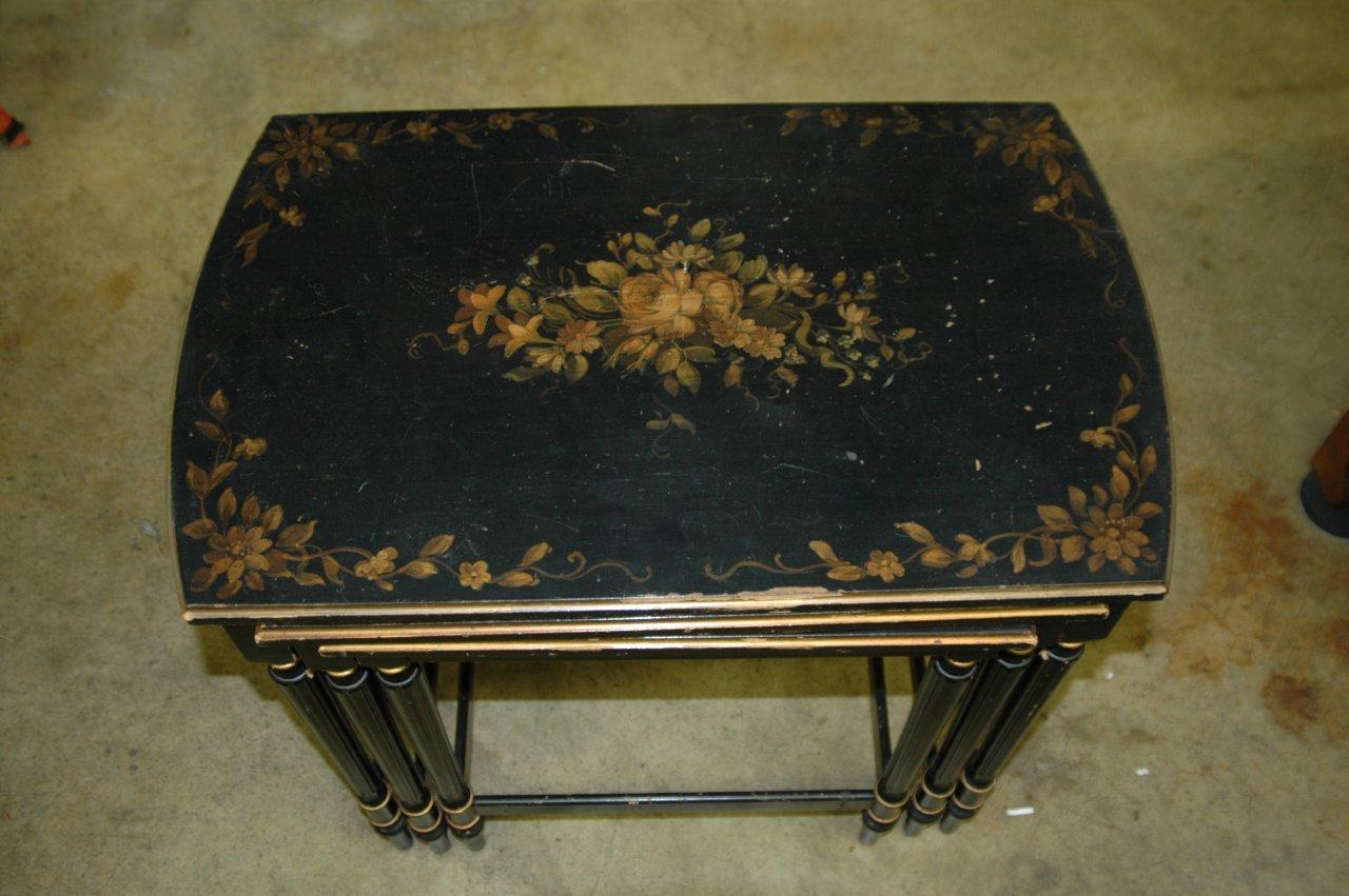 These do show wear and usage - scratches, a couple chips on the edge, water rings, etc. The top has curved sides, while the middle and bottom tables are rectangular. The top has the floral design around the edge as well as in the center, while the middle and bottom table has the design around the edge only.