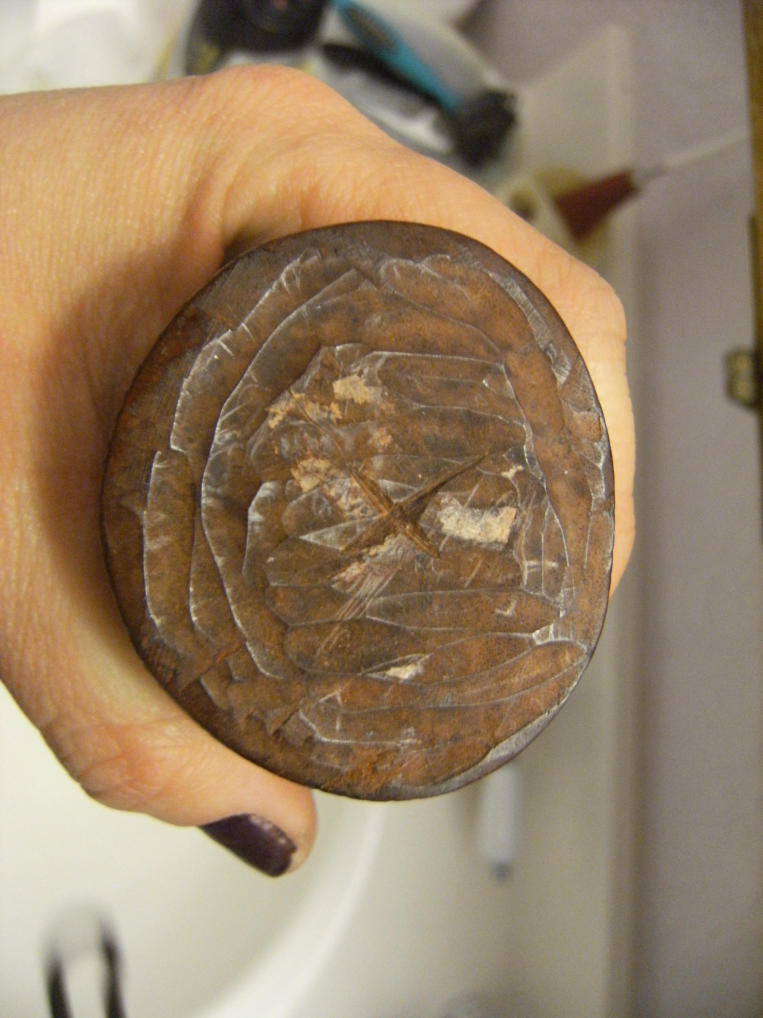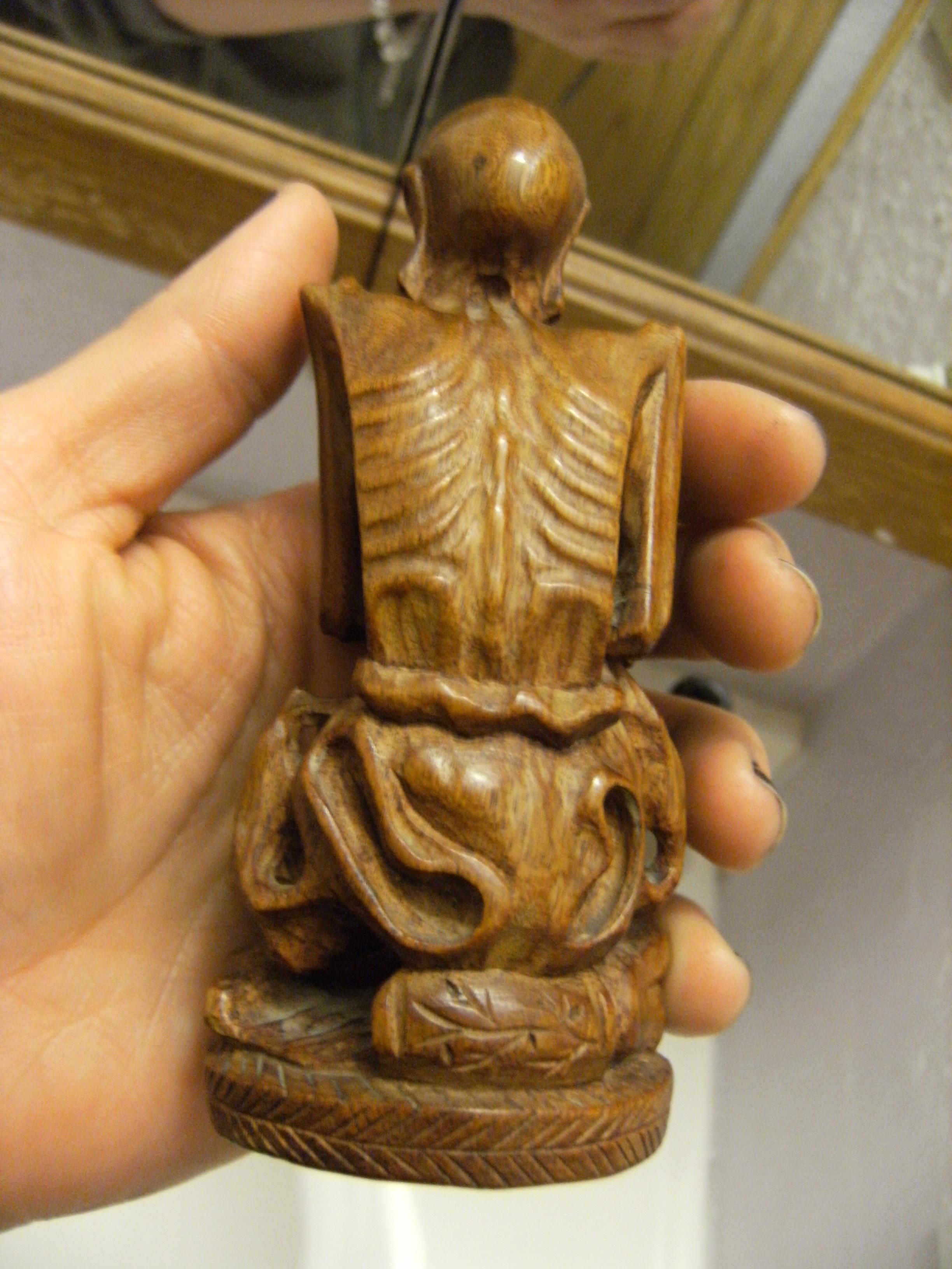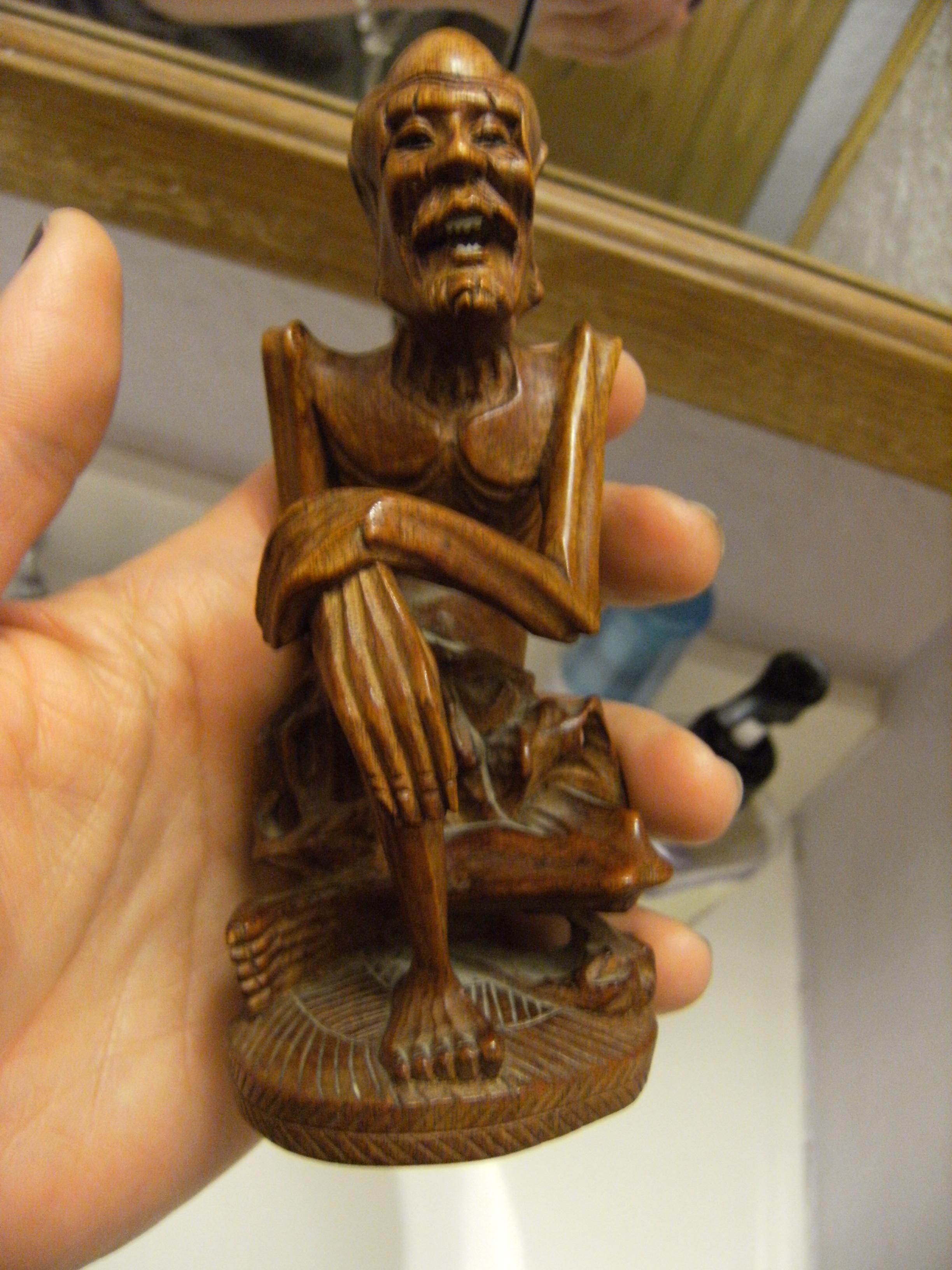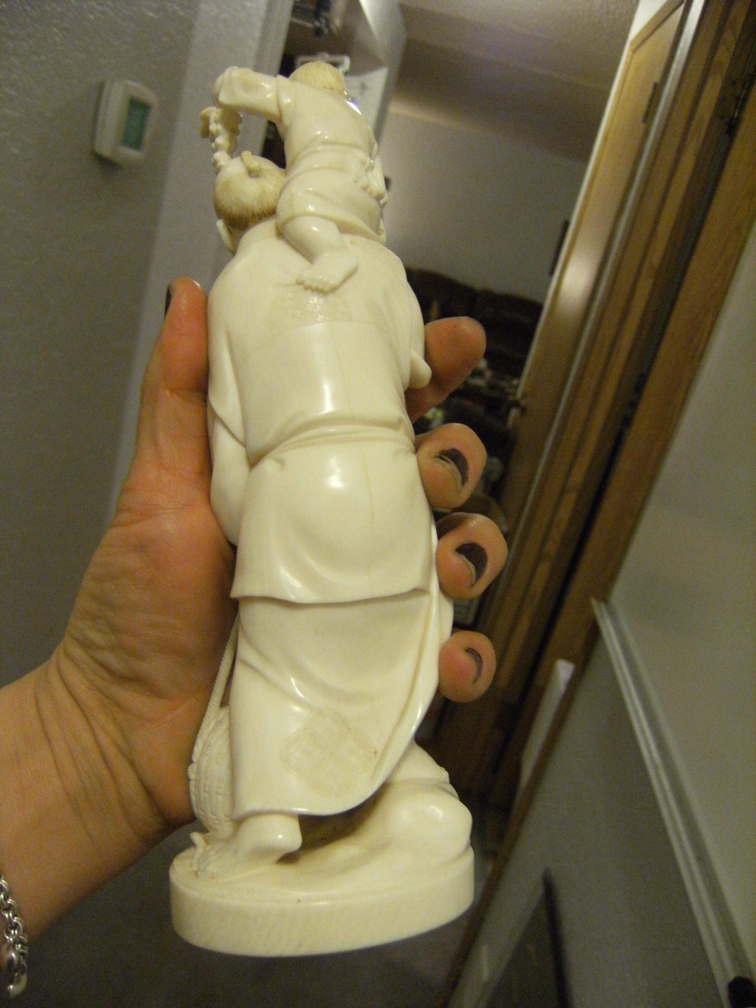These two netsukes were brought back from Japan during the period of WW2 around 1945. The first one is signed and is approximately 7.5 " tall. The second one is made of wood and has ivory teeth and stands about 5" tall. This is all I know.