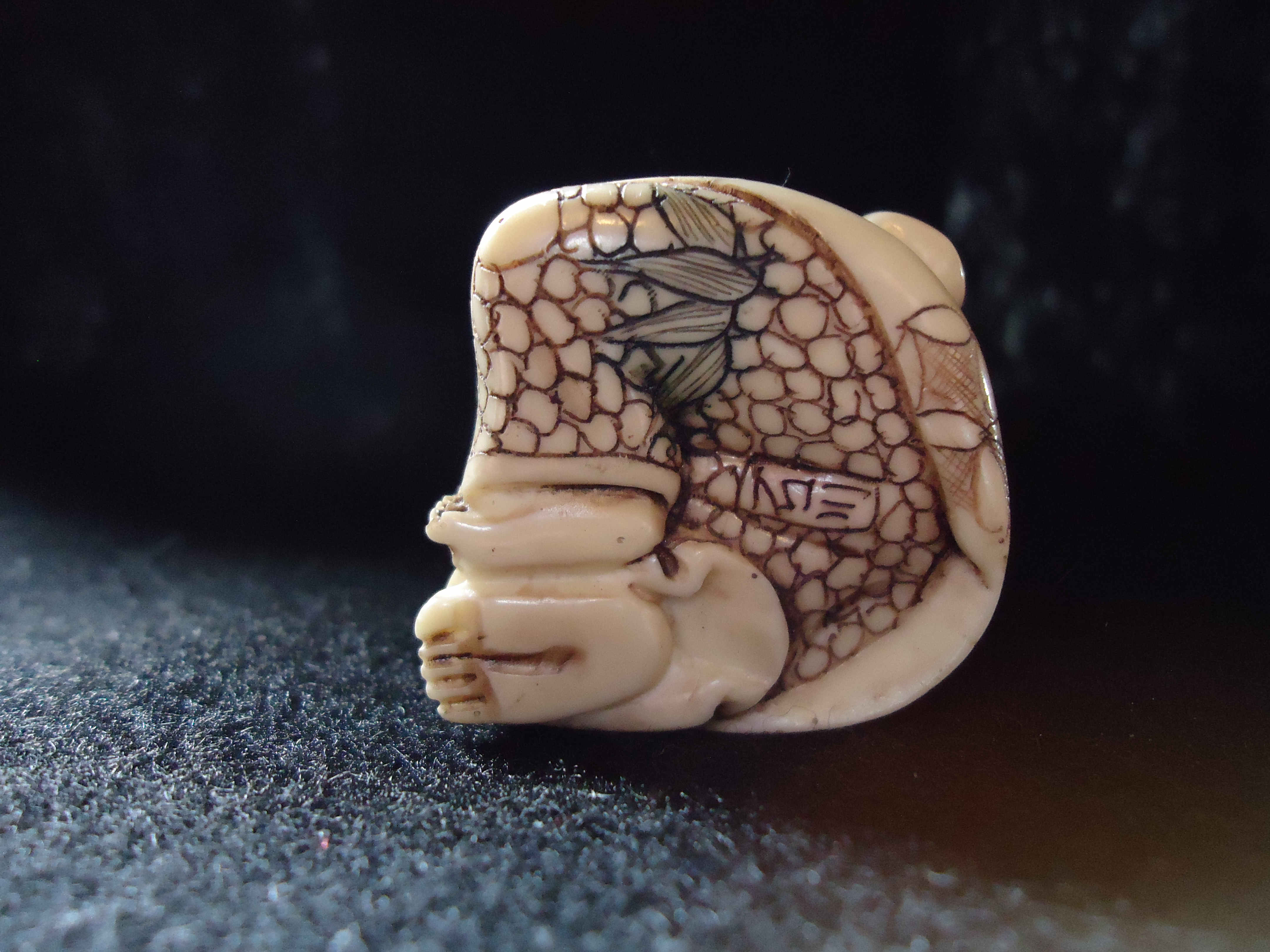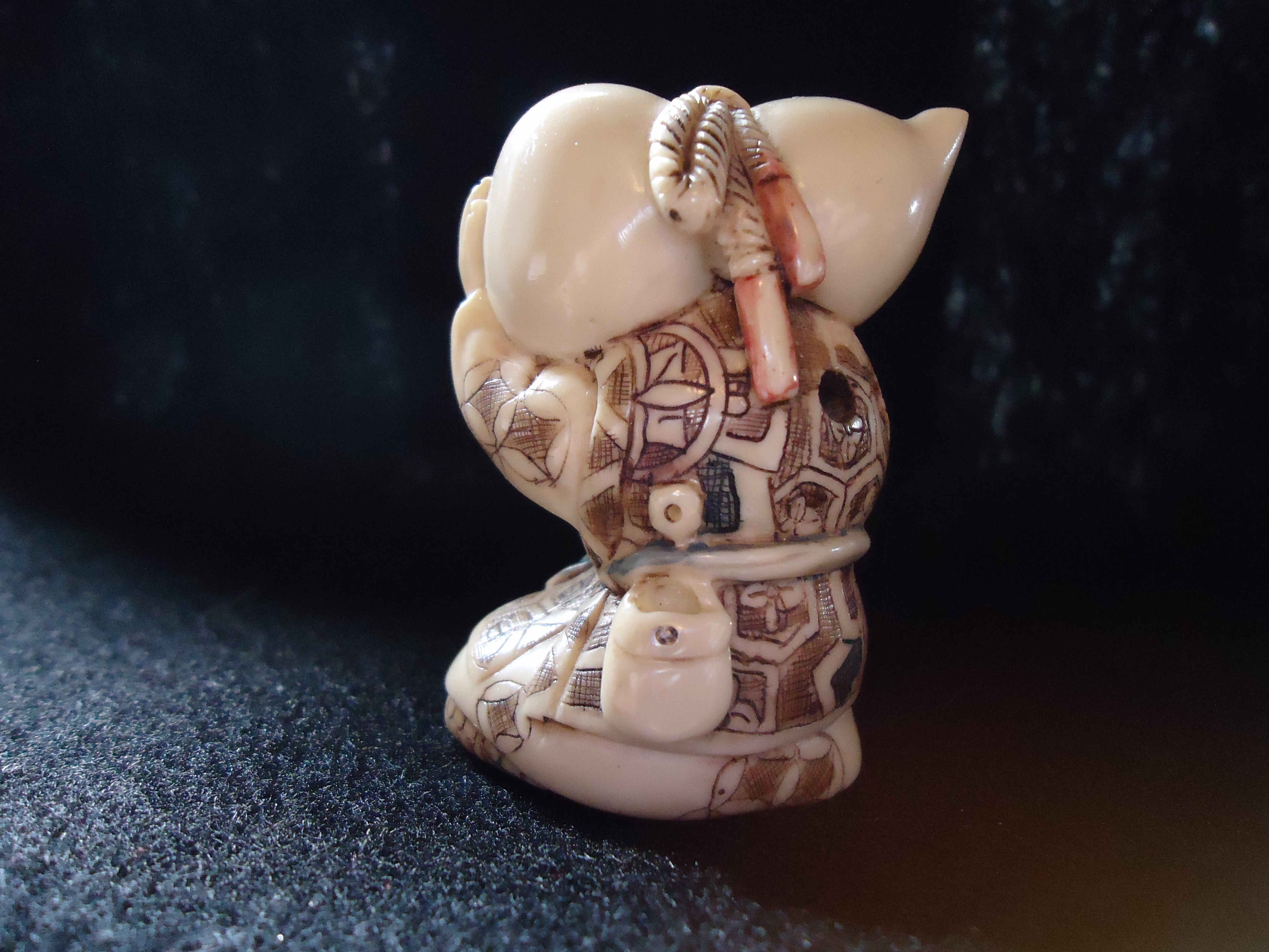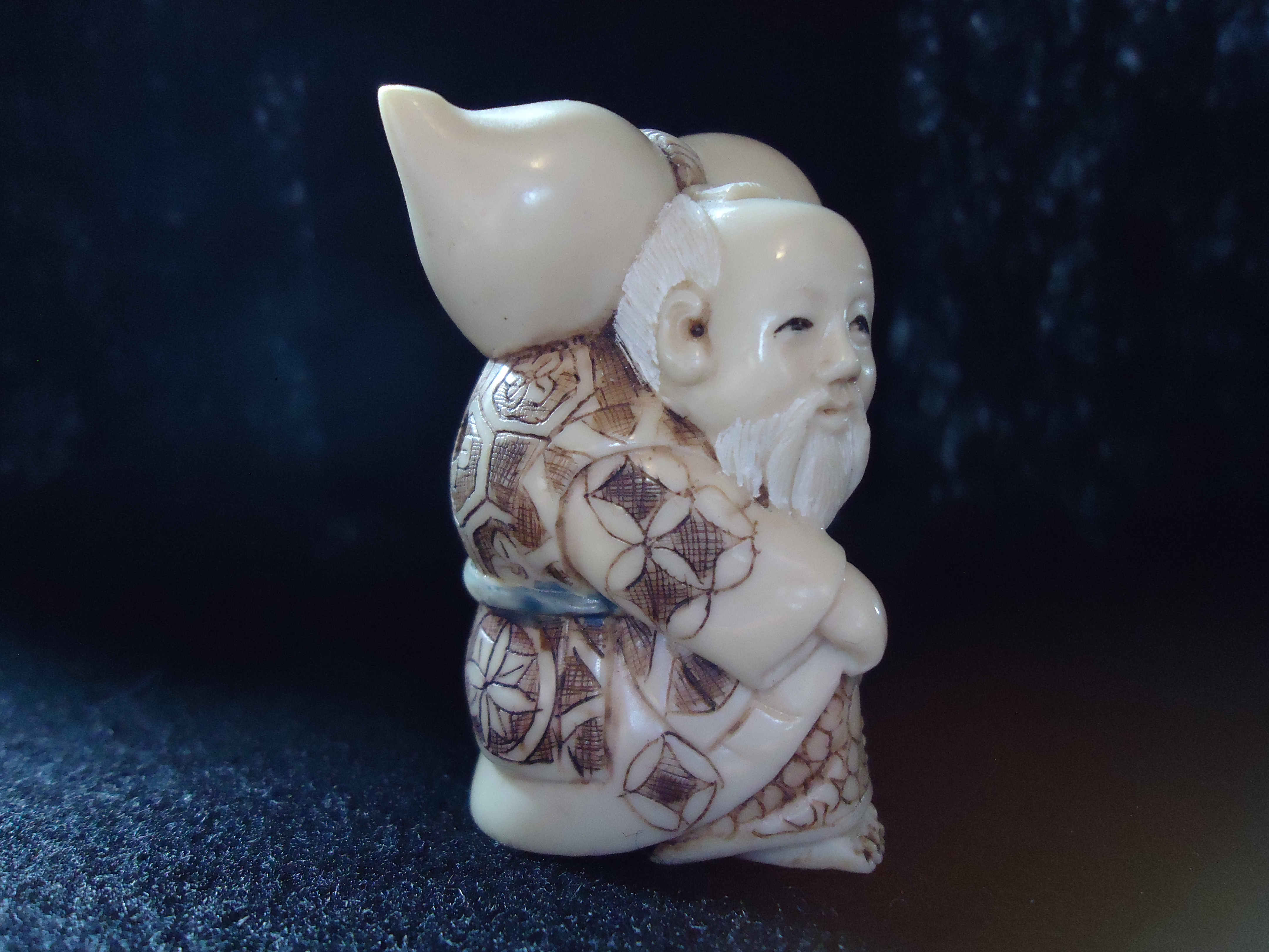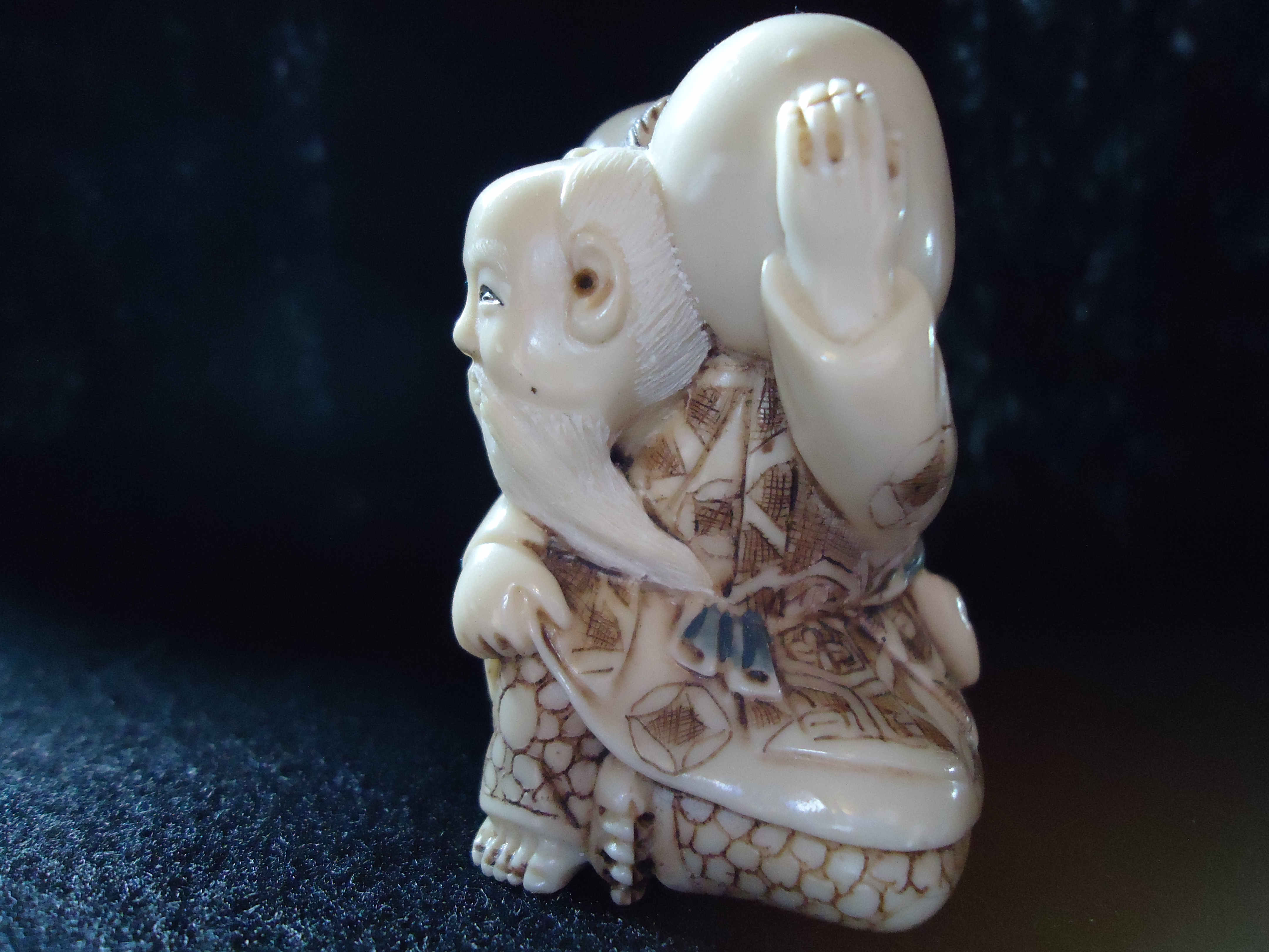 This is a signed Netsuke sitting man holding tied sack on his shoulder