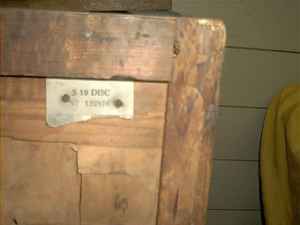 Edison S19 Disc Phonograph, serial #122876, that is still in its shipping crate. This mahogany finish upright disc phonograph has been in stock in a family music store (now inactive) that dates to 1886. The Diamond Disc models were manufactured from 1912 to 1927, and they play the thick, black Edison disc records with a permanent diamond stylus reproducer that does not need to be changed. This tall vertical wind-up machine has a lift up lid, an internal horn, gold plated arm, reproducer, etc., and disc storage at the bottom below decorative fretwork that covers the grill cloth. It is impossible to see what the condition of the phonograph is while it's still crated, but it obviously is all original. There is a heavy duty cage-like structure built around it from lumber under the thinner outside boards to protect it in shipping.