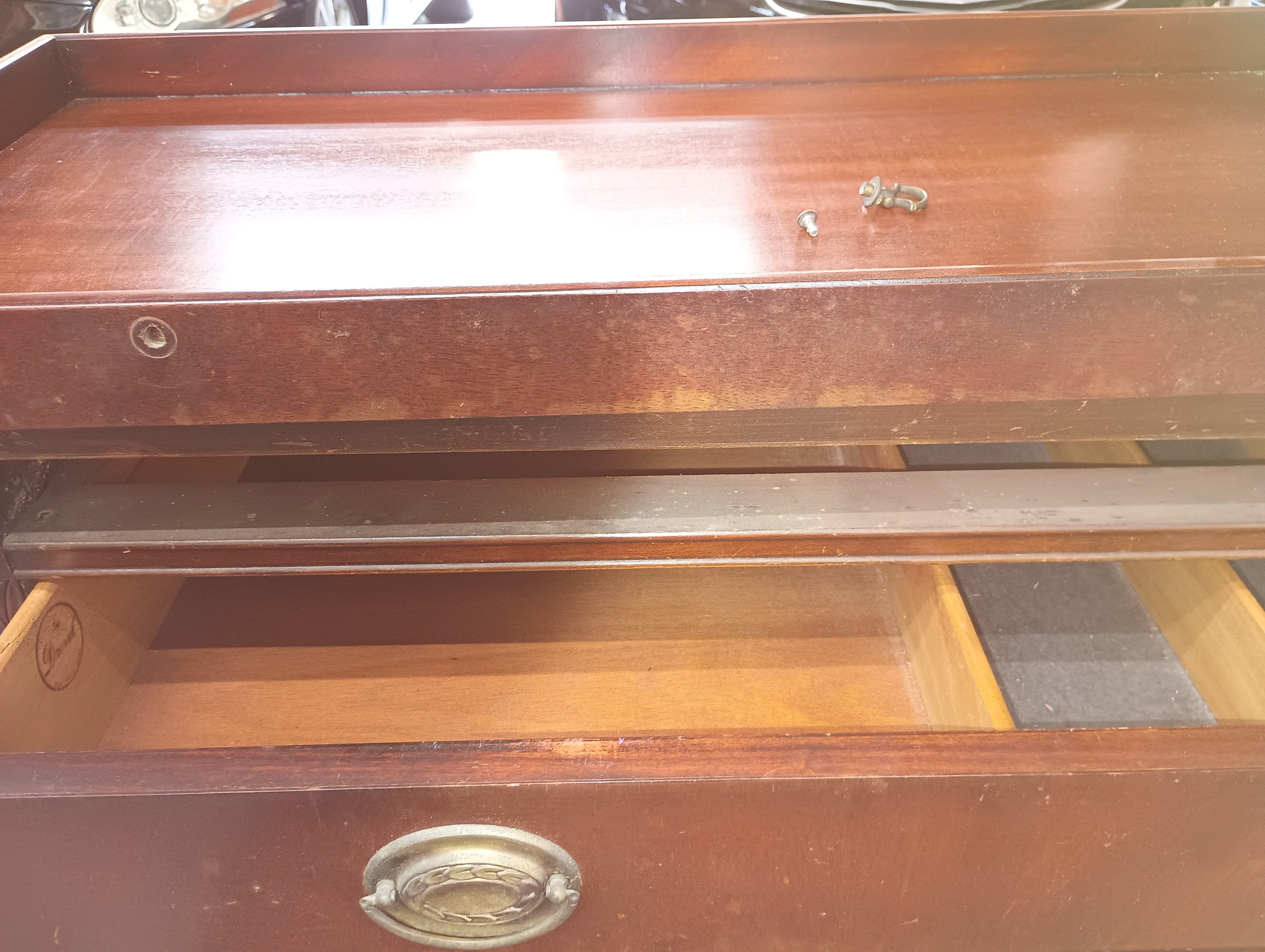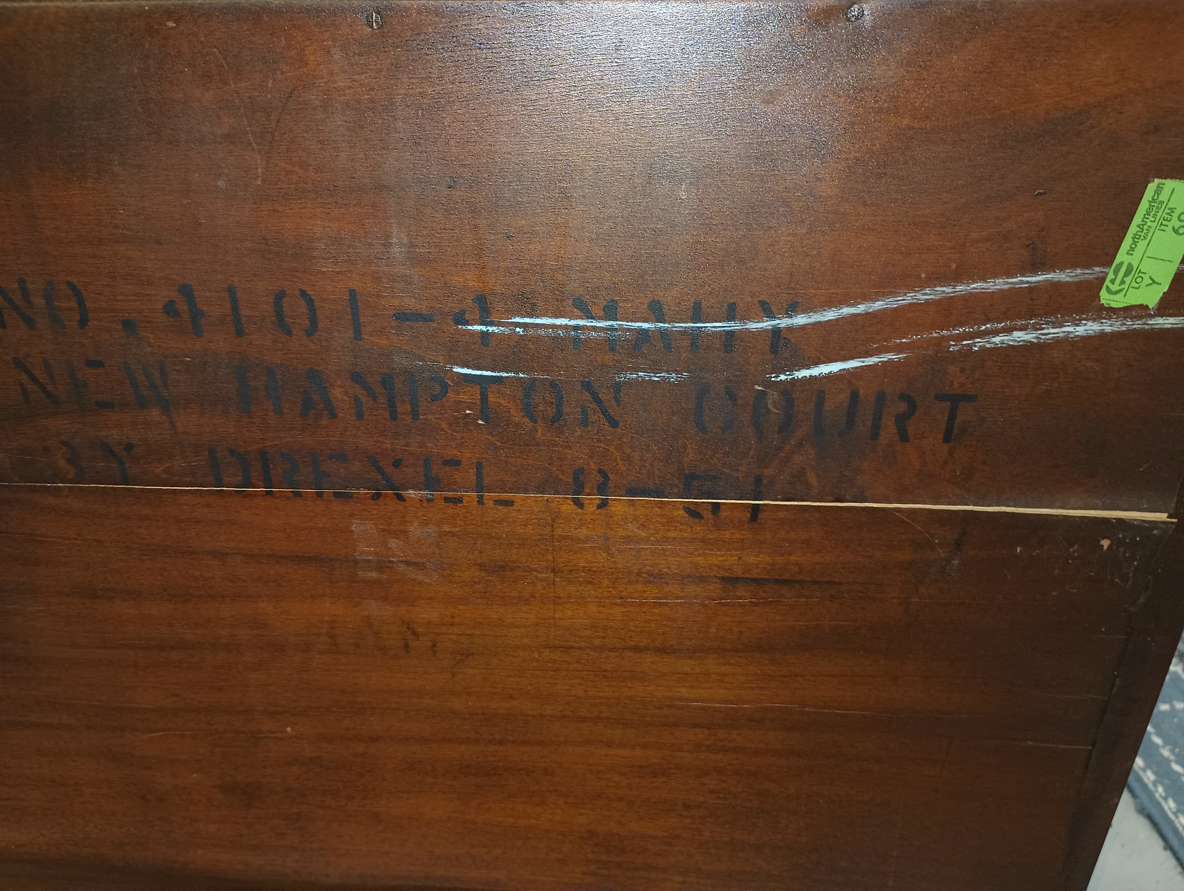 This Drexel sideboard, part of the New Hampton Court collection from the early 1950s, represents post-war American traditionalism. Key features:
