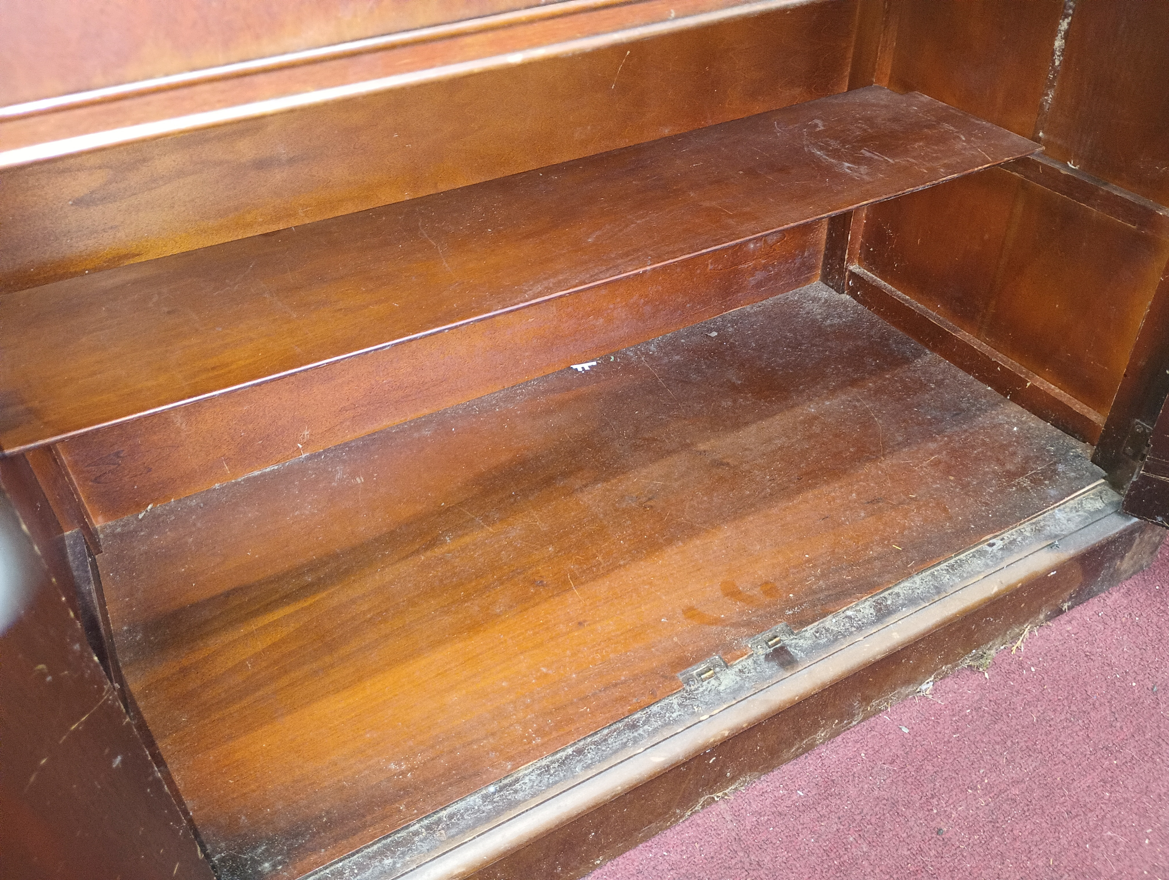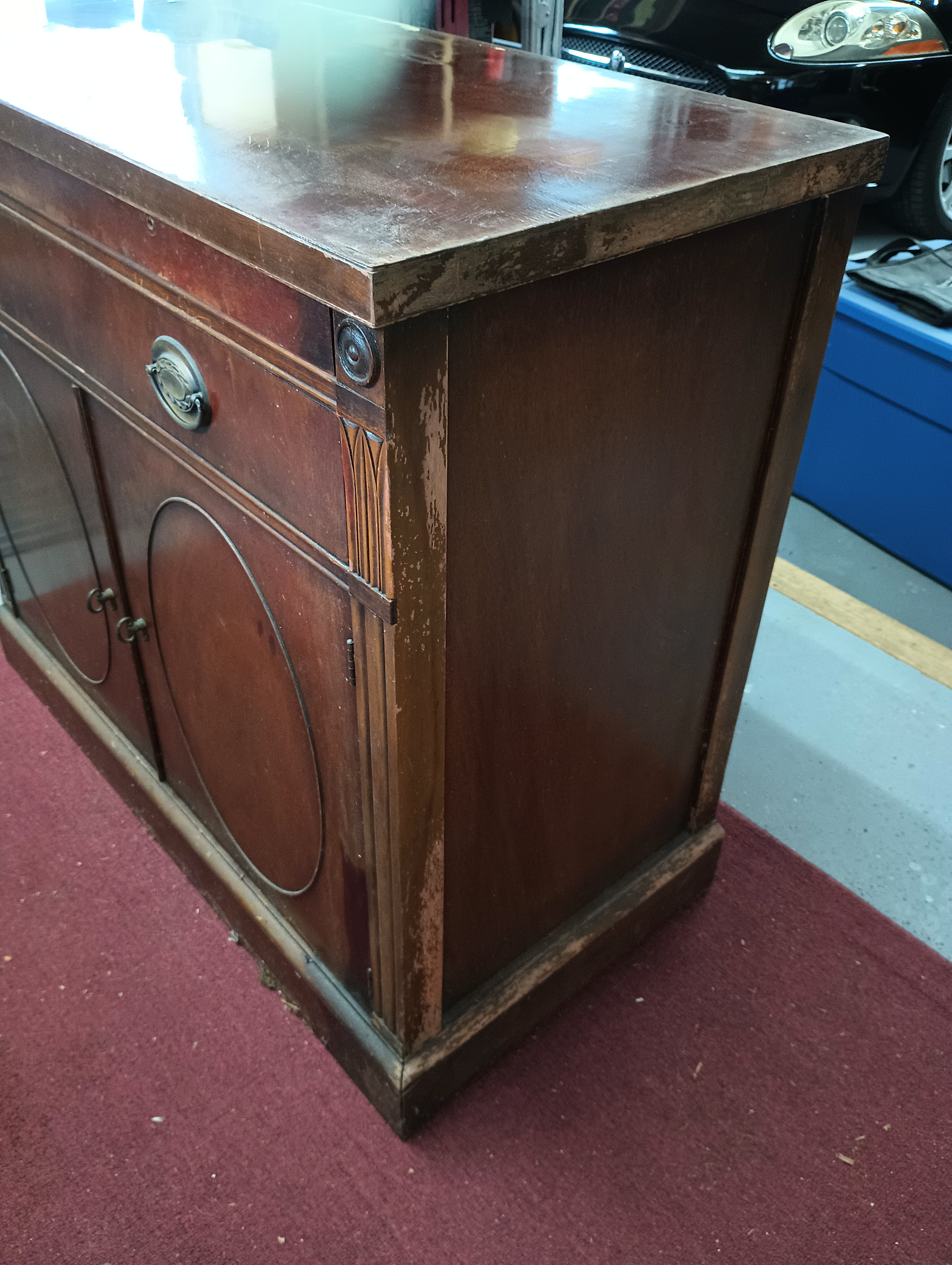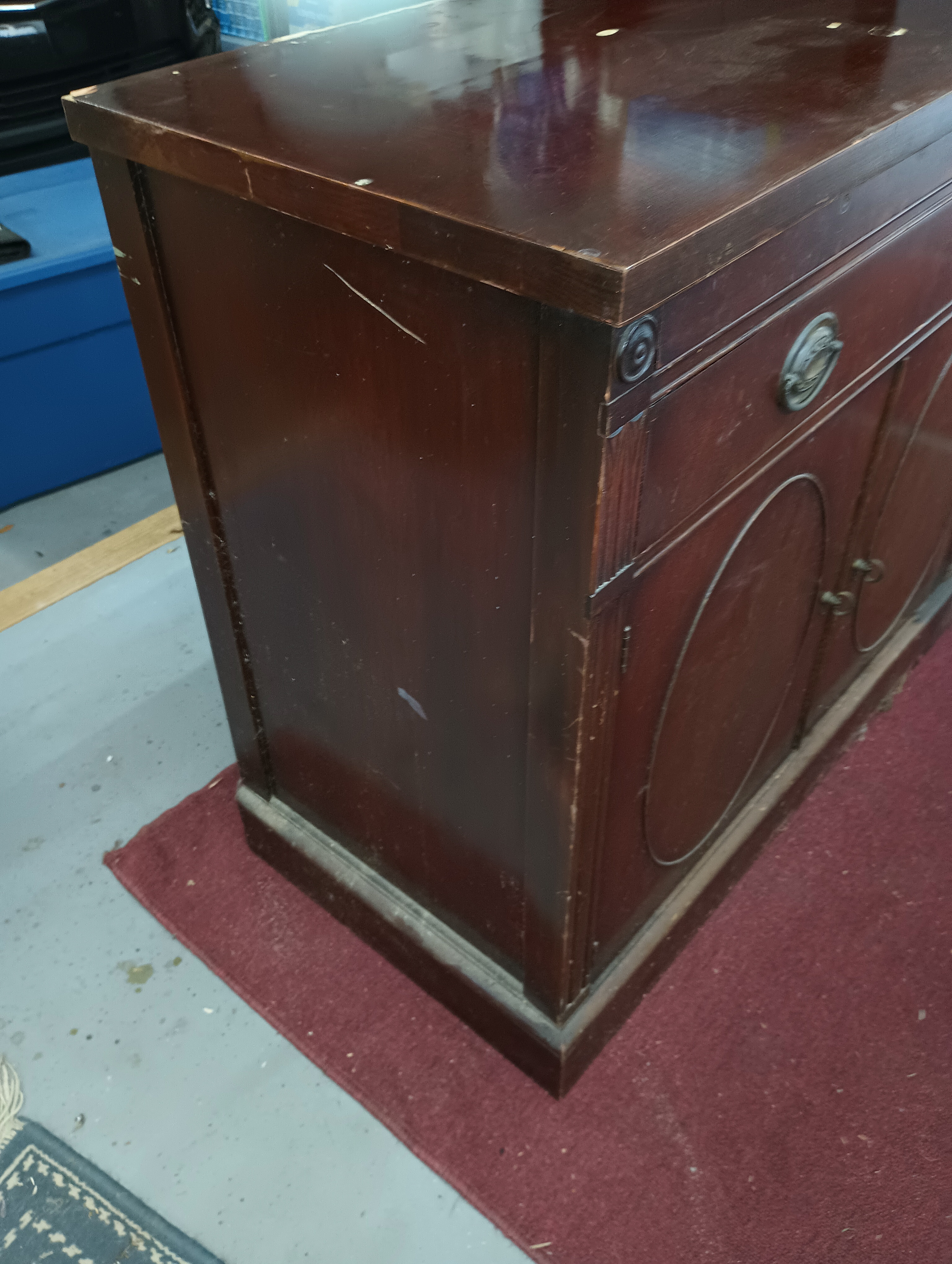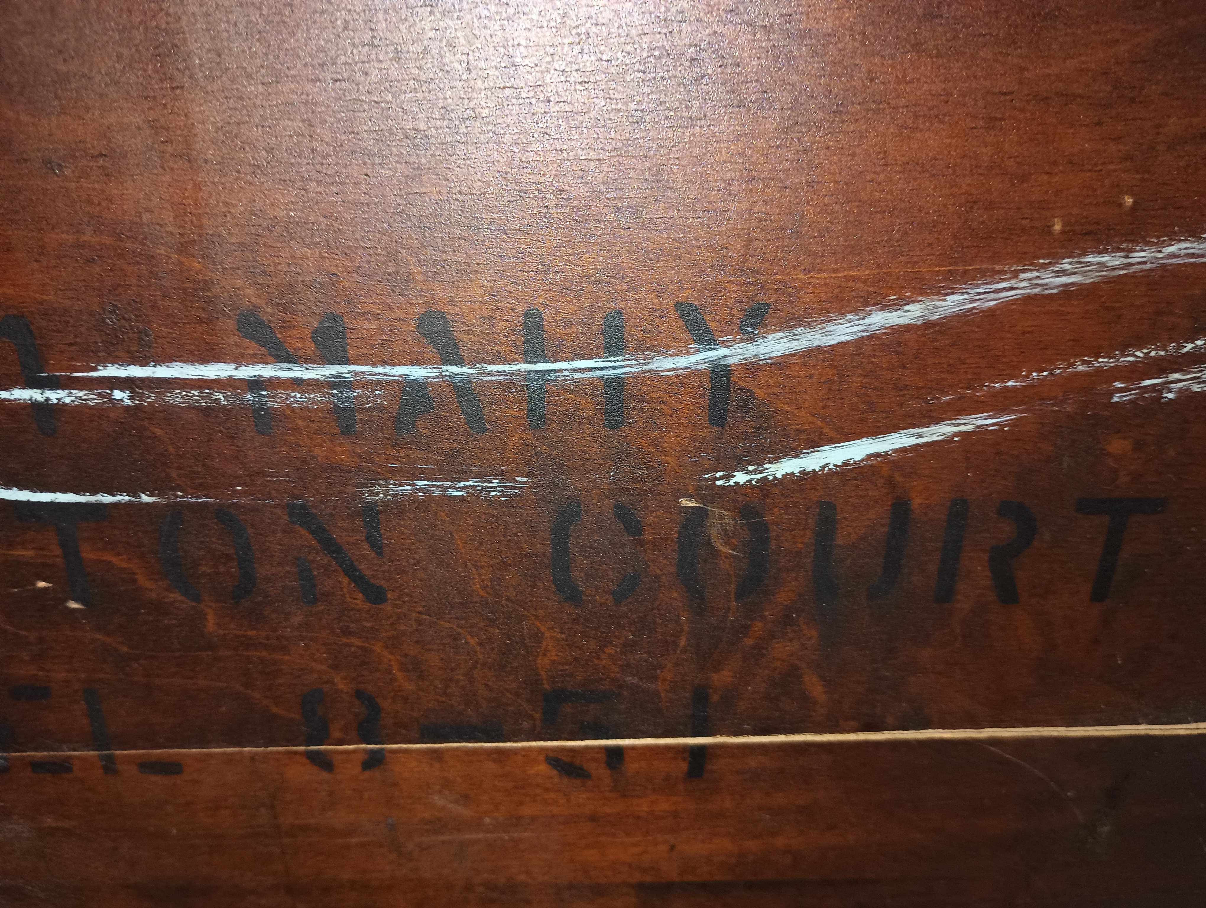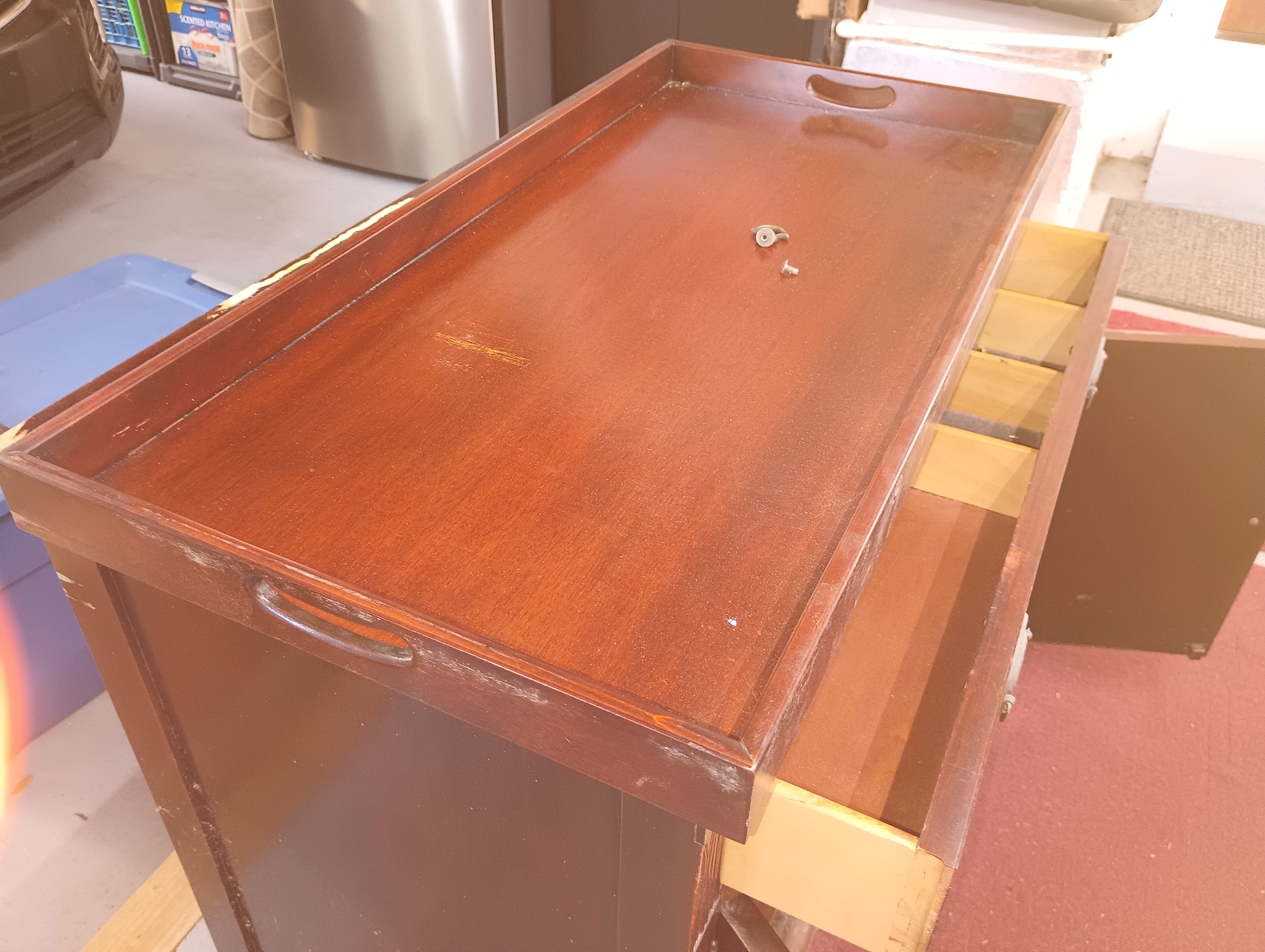 Despite cosmetic wear and some finish damage, the structural integrity appears sound. The piece shows signs of use and aging (scratches, finish loss, edge wear), but is well suited for restoration or refinishing