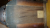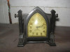 Shelf or mantel clock seems to be in good working condition, chimes and keeps good time. The back seems to have a lot of wear, but the front and side look in great shape. Estimated size 10"W x 5 1/4Dx 11"H, and the polished brass door with its original convex glass closes tightly.