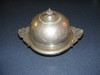 This piece has the anchor emblem known as the trademark of New Haven Silver Plating Co on the center bottom, with the words "New Haven Silver Plate Co. Triple" and the number "4" in a circle around the anchor trademark. According to various internet sources, New Haven Silver Plate Company was established in Lyons, NY and was purchased by Manhattan Silver Plate Company in 1891, which later became a part of International Silver in 1898. The piece is very ornate and the top part of the lid (the part you would use to lift the lid) is intricately carved (?) with flowers and perhaps scrolling ribbons. The handles are also ornately decorated with flowers and attach to the bottom piece at three points per handle. The four individual parts of this piece include the lid, an internal tray/plate with a center hole, the base, and a small silver butter knife that fits into holders on the base piece.