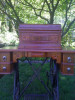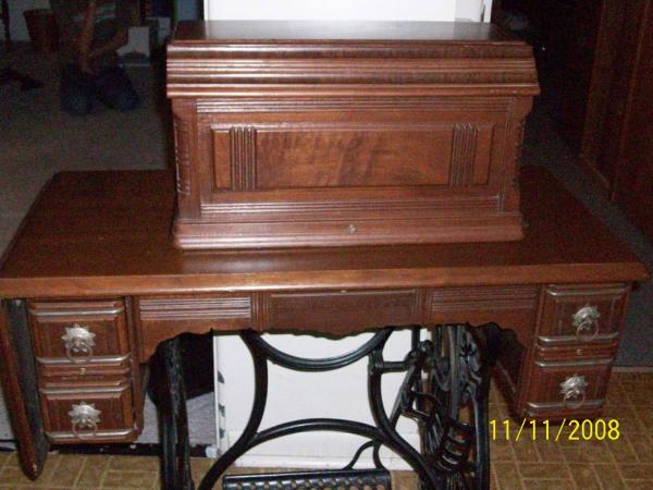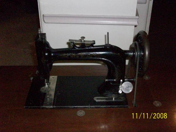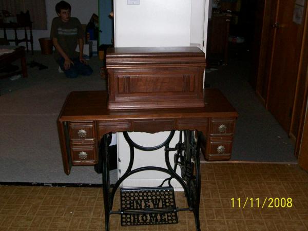 This is a treadle sewing machine with a coffin top cabinet. The sewing machine is a new home manufactured in 1890. The cabinet date we can't find but it looks 20th century. It is cherry in very good condition with just a few nicks. The metal (brass?) handles on the cabinet look art nouveau and and have a star pattern that spells out "New Home". There are two metal pegs to hold the machine to the cabinet, but one is bent and the other is missing its peg. The metal base and legs are in excellent condition and the 'New Home" logo on the legs still has its gold frosting.