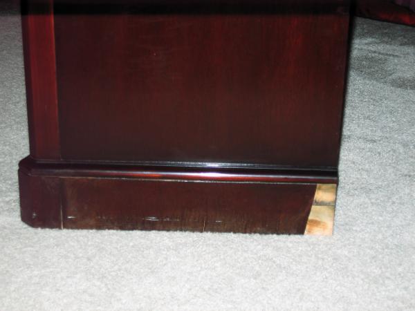 · Fair condition: some scratches on front and left side; scuffs at bottom; veneer chip from bottom on right side; glass top, specially cut to size, to protect wood on top