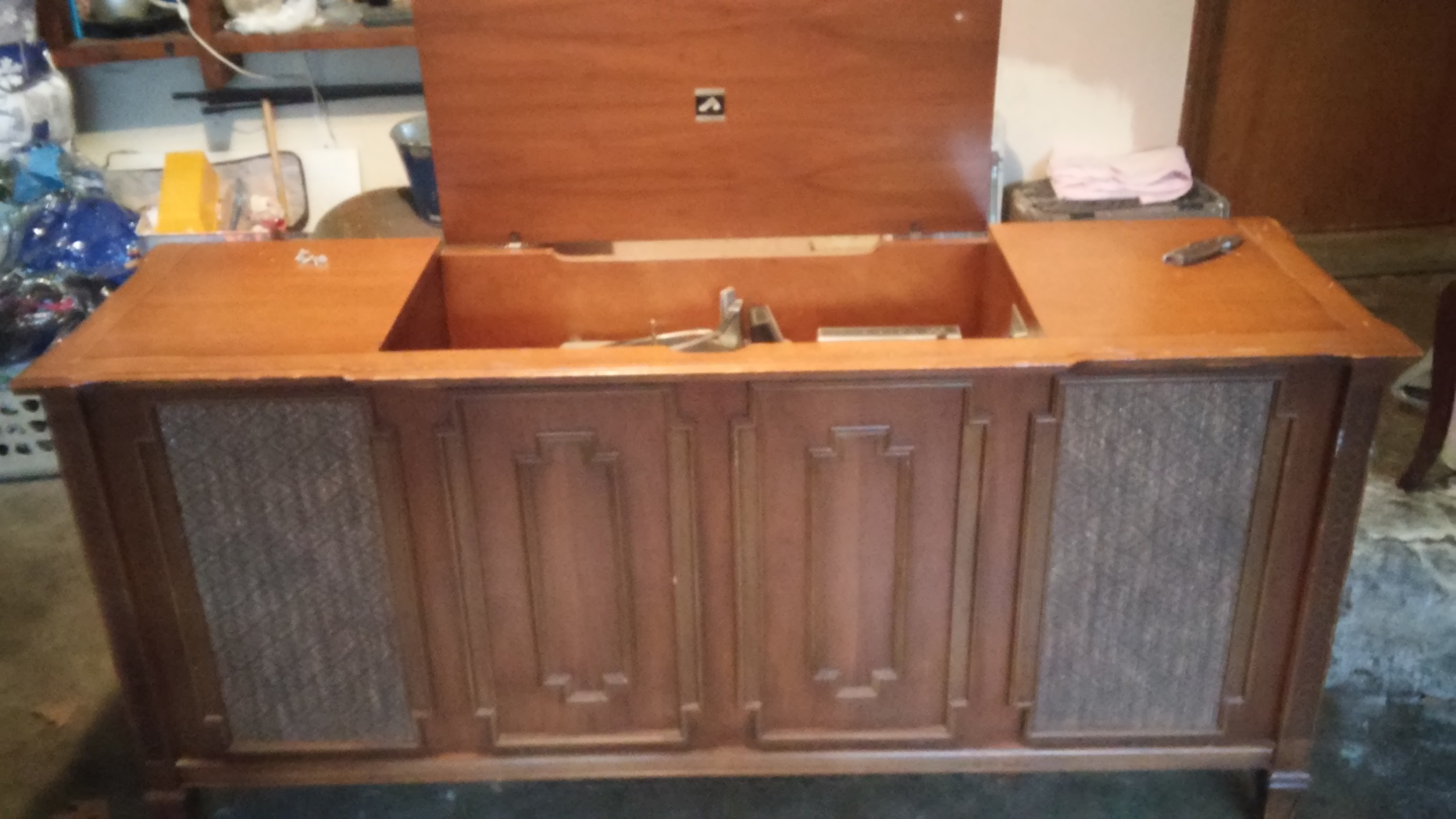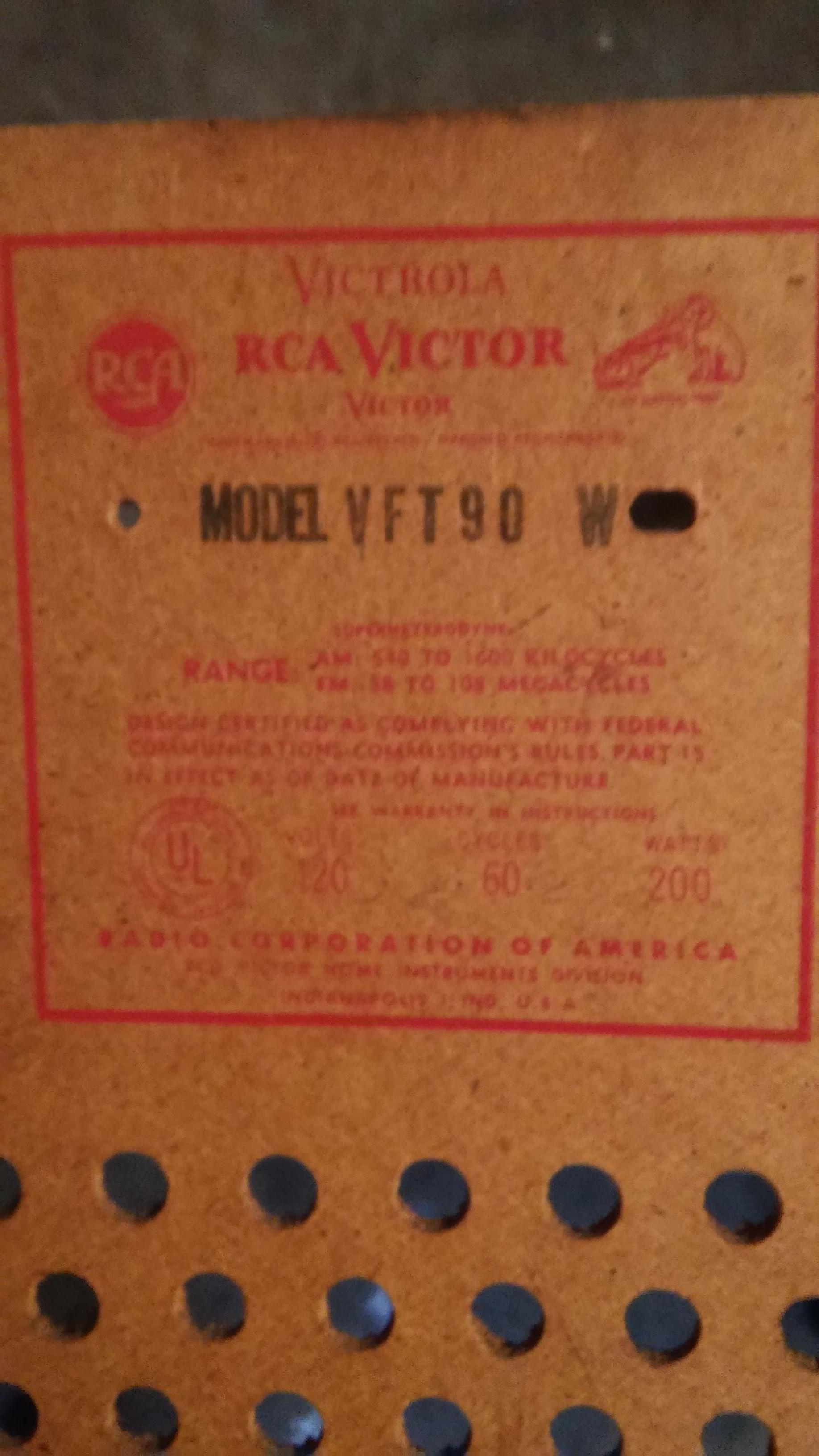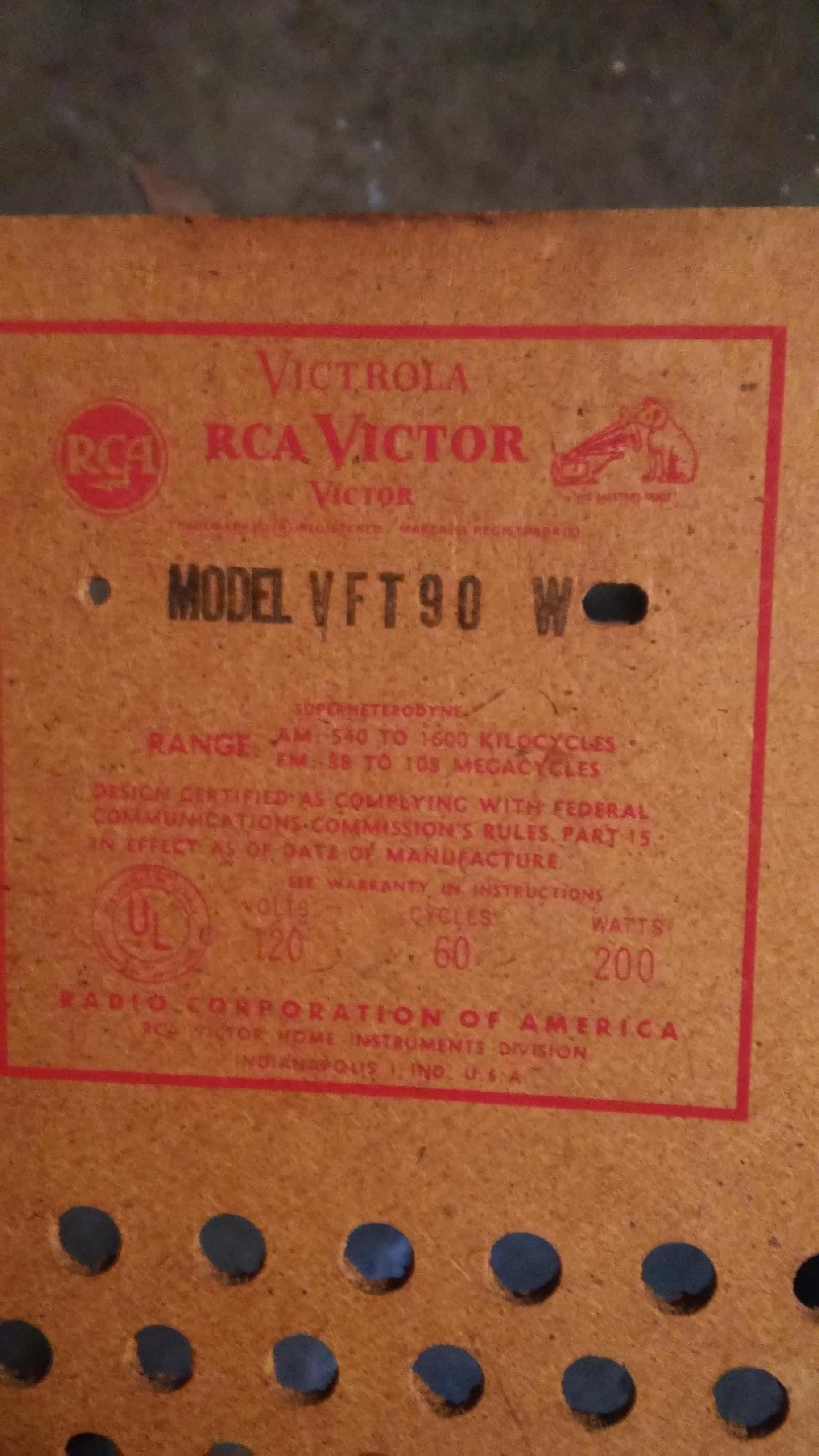 Victorola RCA Victor model VFT90 W serial # 19. 7465 model # 15 07 3 Radio works great. Needs some restoration. Could use new power cord. Turntable spins. Needs needle & balanced. Needs a good dust clean & TLC. Beautiful solid cherry wood can use some touch up. Size. 63"l × 18 1/2"w × 30"t