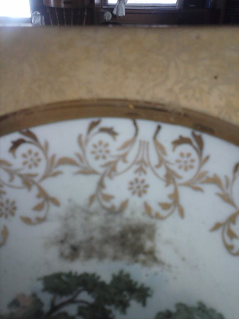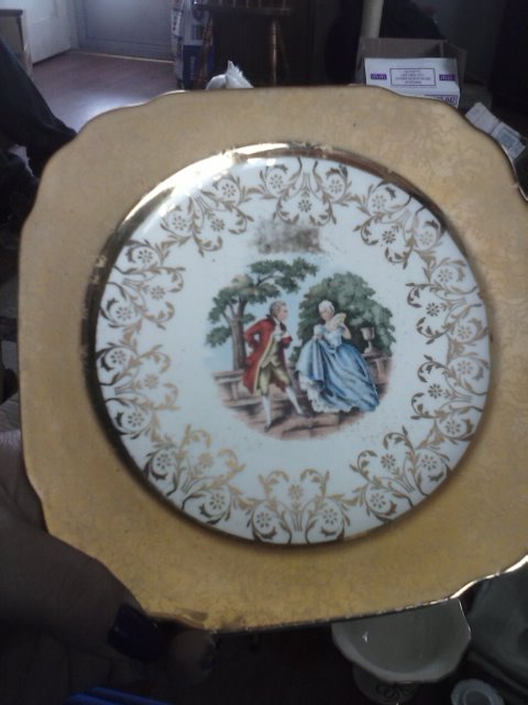 I have a plate that has a rounded square shape that has almost 2 inches of 22 karat gold around the outside its solid with floral etching. It also has another border under the first one with a kind of floral pattern that is also hold, and in the center there is a colonial style man and woman, his right hand is behind his back bowing and she is using her right hand to hold up part of her dress as she curtsies. There are 2 trees in the backgound, and some kind of bricked half wall and they are standing on a similar bricked path