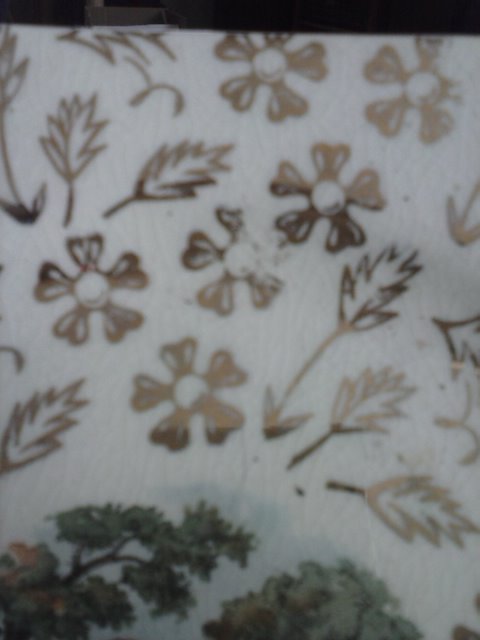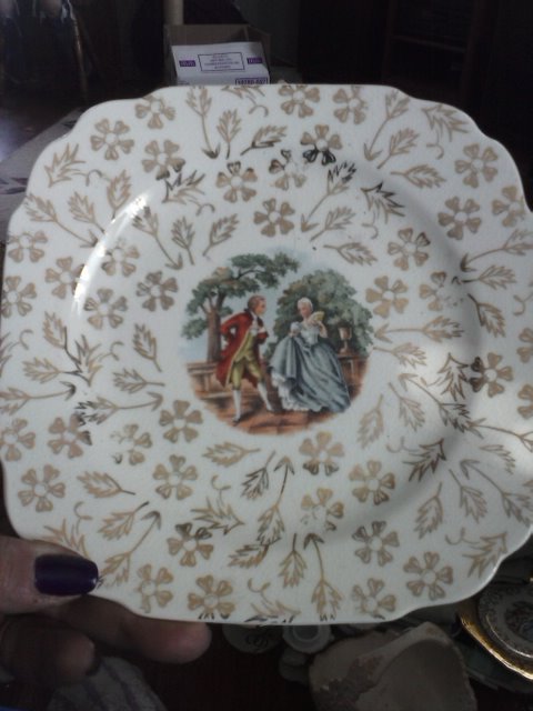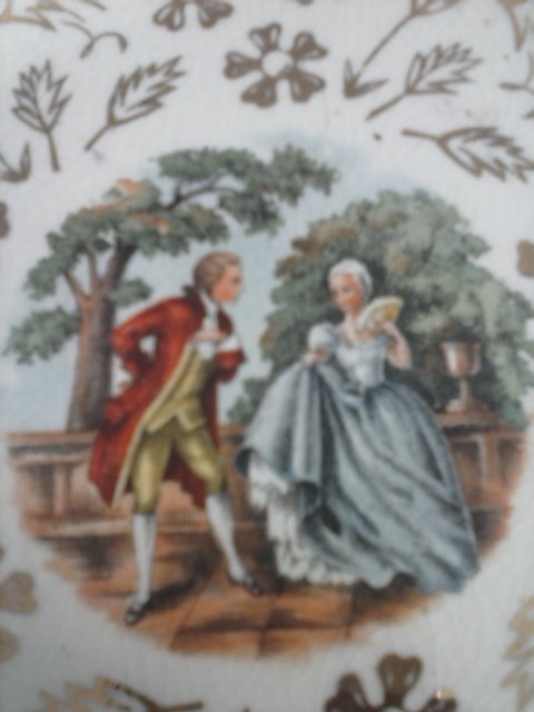This is another colonial style plate with 22 karat gold floral pattern trim. It also has the same colonial style man and woman in the same pose as my other plate in the center. it is also in excellent condtion.