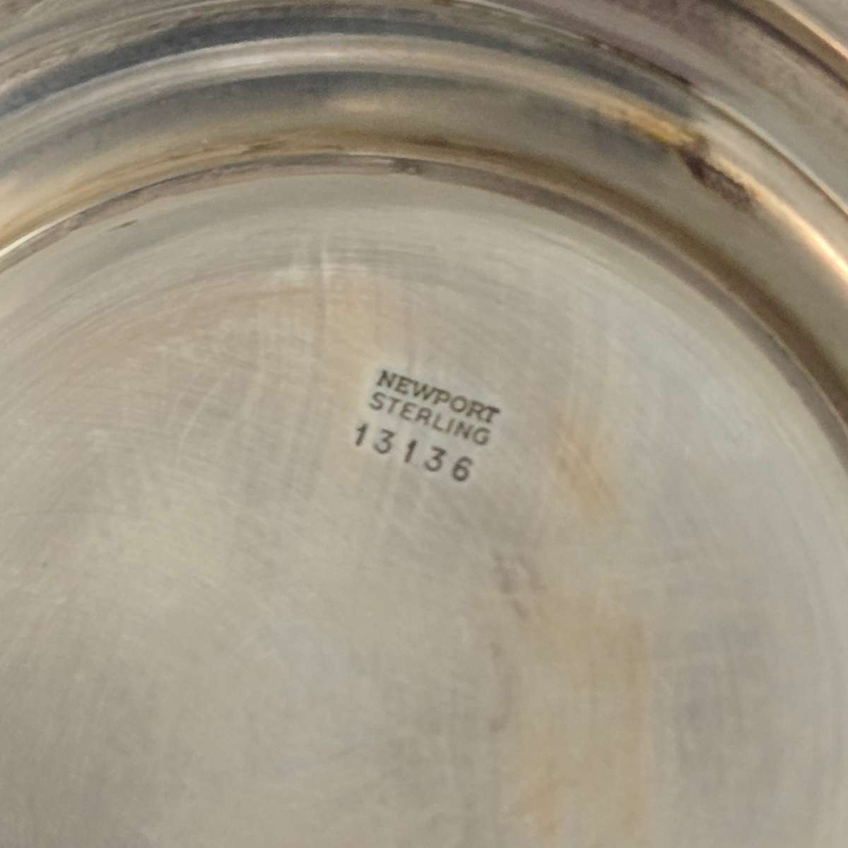 The bowl is marked "NEWPORT STERLING" along with the number "13136" on the base. Newport Silver Company, founded in 1940, is known for producing high-quality sterling silverware and decorative items. Their pieces are collectible due to their craftsmanship and the company's historical significance in American silver production.