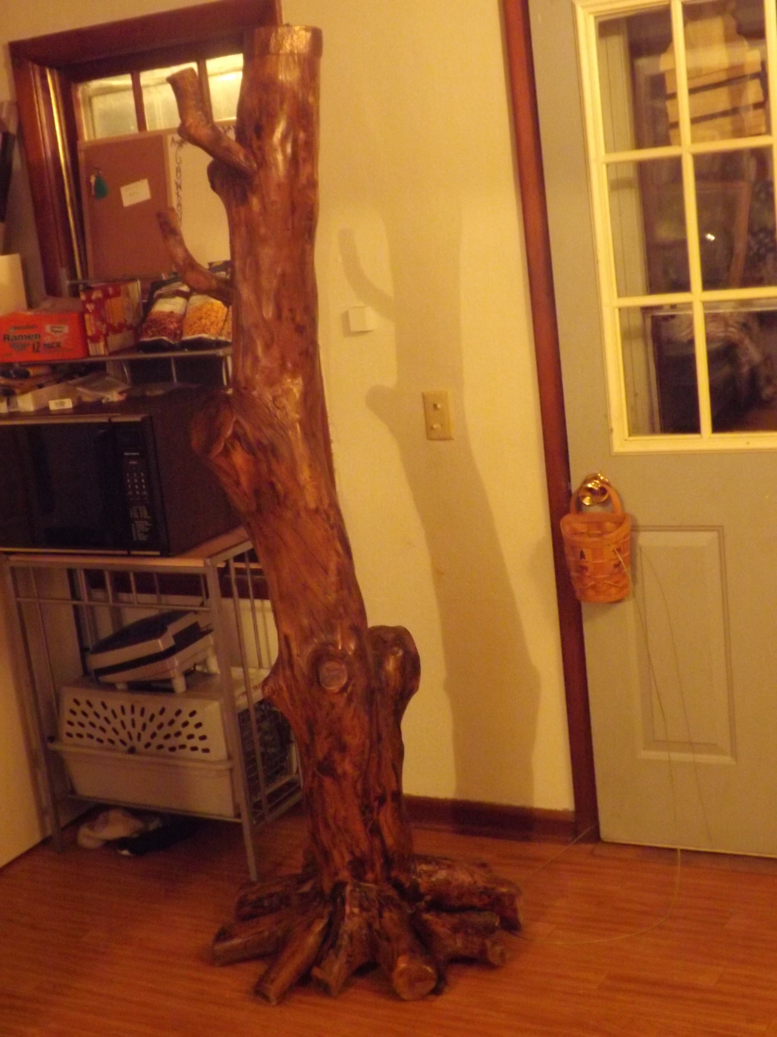 Nicaragua Mahogany Bar. Hand made one of a kind. All of the logs are solid mahogany. The tall free standing log is 6ft tall the shorter is about 4.5. The bar its self is approx. 4 feet wide and 4 feet tall. and a foot deep. There is a glass shelf underneath which is about 3/8th thick glass. as well as shelfs for the back drop. With same thickness. There is a lot of random copper accents. And an egget in the middle of the bar. It was hand made by the gentleman that owns( or owned ) the "Y bar" in Millacs Mn.(HENCE THE ALMOST HIDDEN "Y' ON THE BAR TOP!) I have tried contacting him with no luck. The gentleman i purchased it from bought it about 15 years ago. and he had it at his lake house since. He is now in a retirement home and i bought the set at a garage sale. It took 4 grown men to move the back peice. Extremely heavy. I can't find anything wrong with this whole set except the back drop left log connecting to the veneer board is slightly cracked along the seam. I can send more pictures of that if necessary. The makers mark is on the back drop- i can't make it out at all which leads me to believe iit maybe nicaraguan lettering? The gentleman i bought it from purchased it for $2,000.00 about 15 years ago. The "roots" look like real roots very well crafted.. the branches- some are real and some are placed. those that are placed all seem to have copper underlayment. One of the copper rins ( right side of back drop) at the top of the log has fallen off. and im not sure how to fix it so i will let it be until told differently. over all very beautifull near flawless piece.I dont know anything about eggets. so i'd like incite on that aswell please. The back drop is 6ft tall by 7ft wide the veneer is seperated twoards the bottom middle. anything else please email [email protected] THANK YOU!