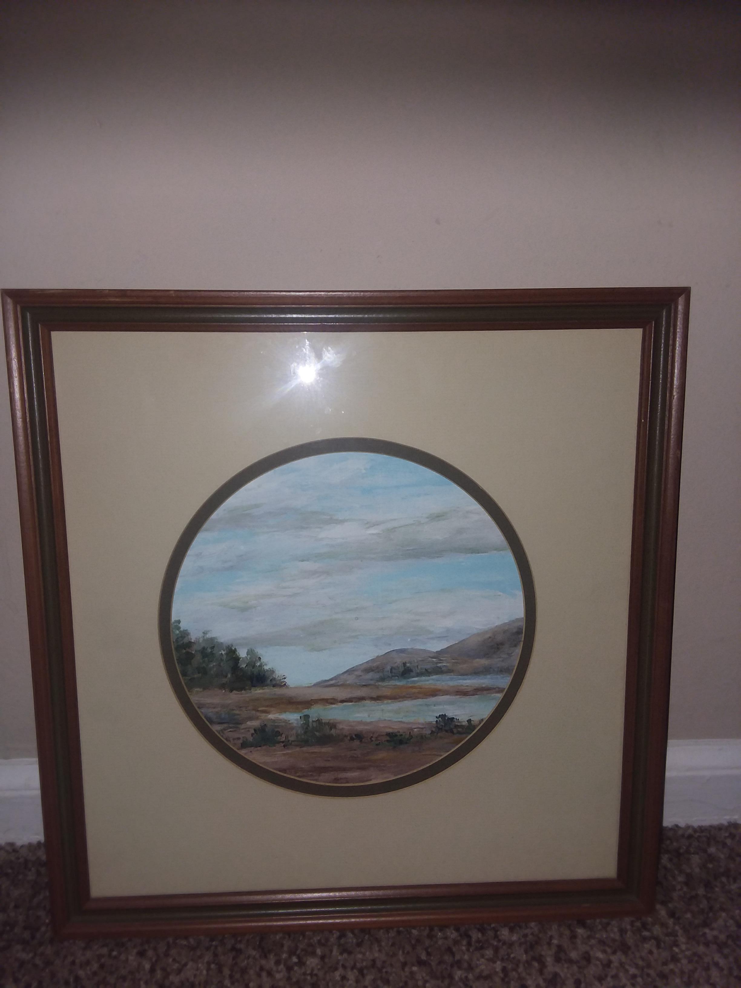 This is a lanscape picture with a signature sort of hard to make out. I've tried different variations to what I think it might say but find nothing on it. Its in a round frame and is larger in size than the circle frame depicts.