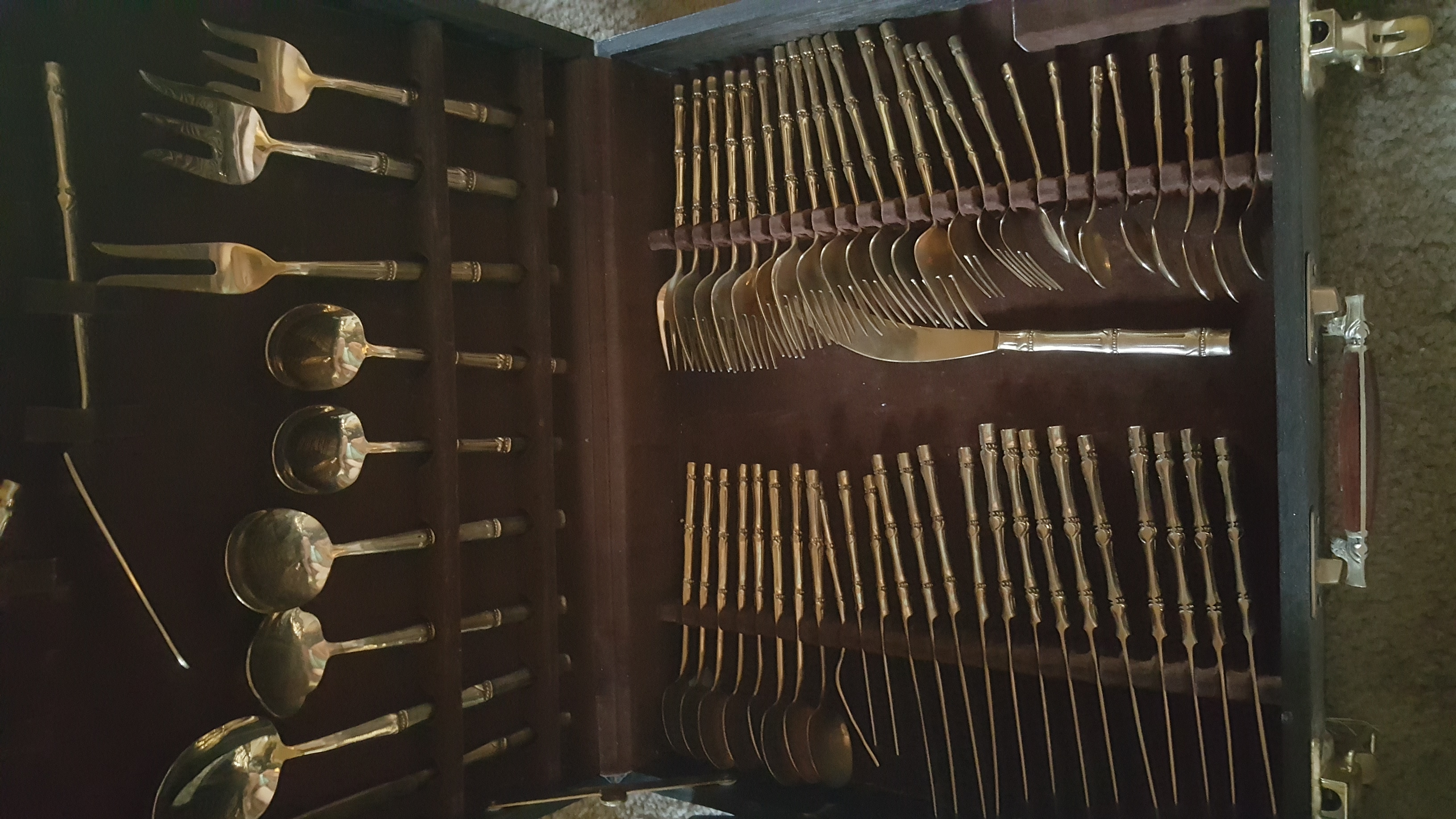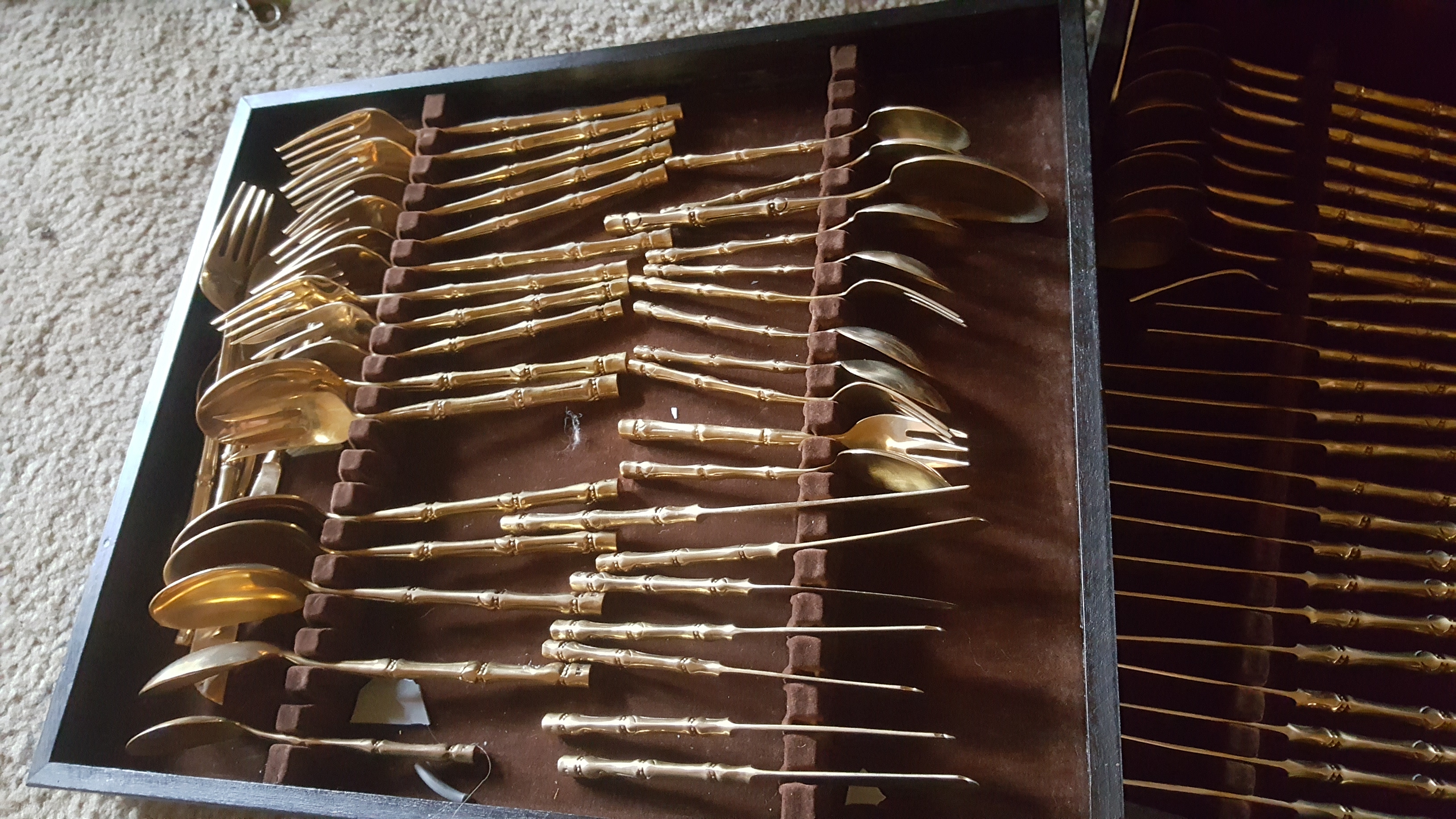 Hundred piece nickel bronze dinner flatware in box.