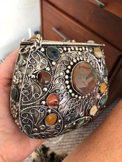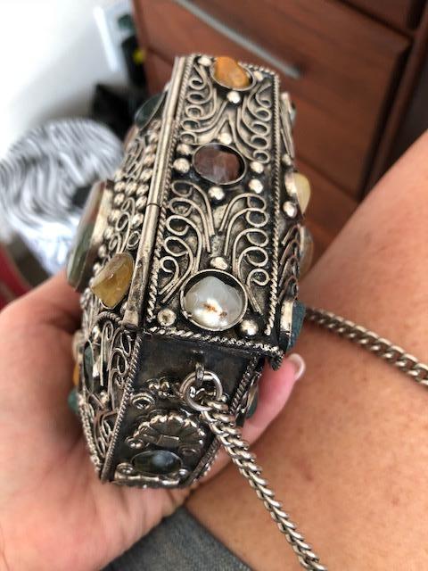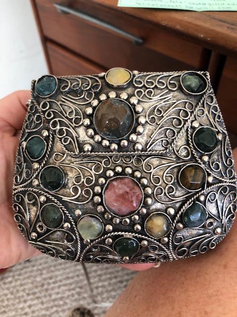 I have a nickel and sterling silver small purse. Measures 5"x4"x2" with a long chain 22" if hanging down. It has a handmade black velvet lining. As shown it has gemstones of all different shapes, sizes and kind. Front flap folds up to expose the silver clasp. Does anyone have information on such an item please? Thank you in advance.