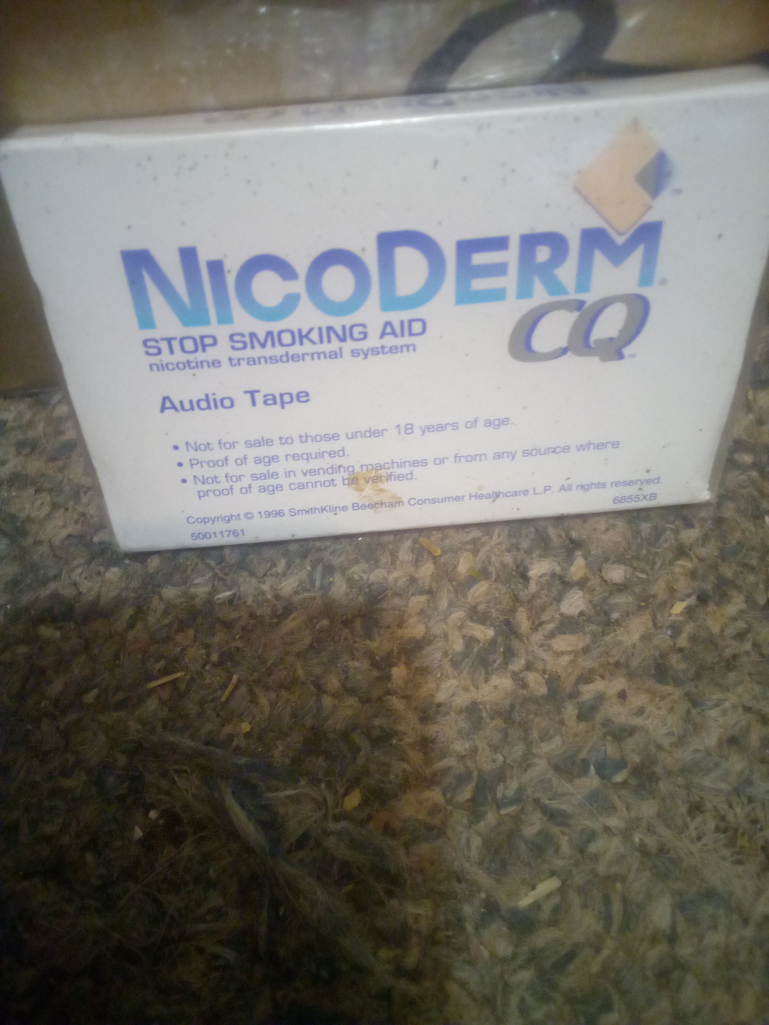 The NicoDerm cassette tape is a stop smoking aid, specifically a nicotine transdermal system. It is made of plastic and measures approximately 1 inch tall and 3 inches wide. The distinguishing mark on the item is "NicoDerm CQ," which is prominently displayed on the front of the packaging.