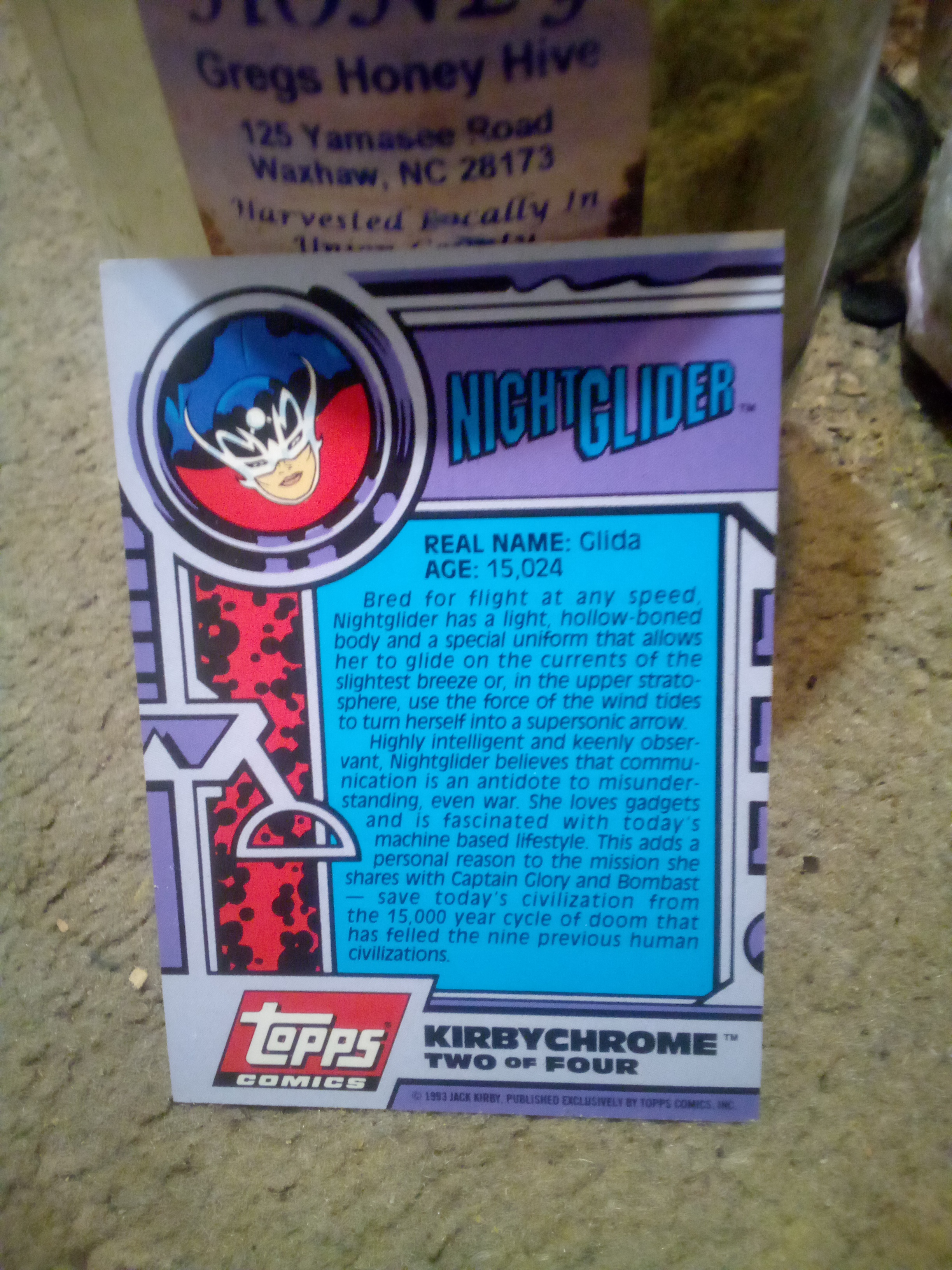 Produced by Topps Comics in 1993, the "KirbyChrome" series showcases the work of legendary comic book artist Jack Kirby. This particular card features Night Glider, a character designed with a unique aesthetic that reflects the comic book style of the early 1990s.