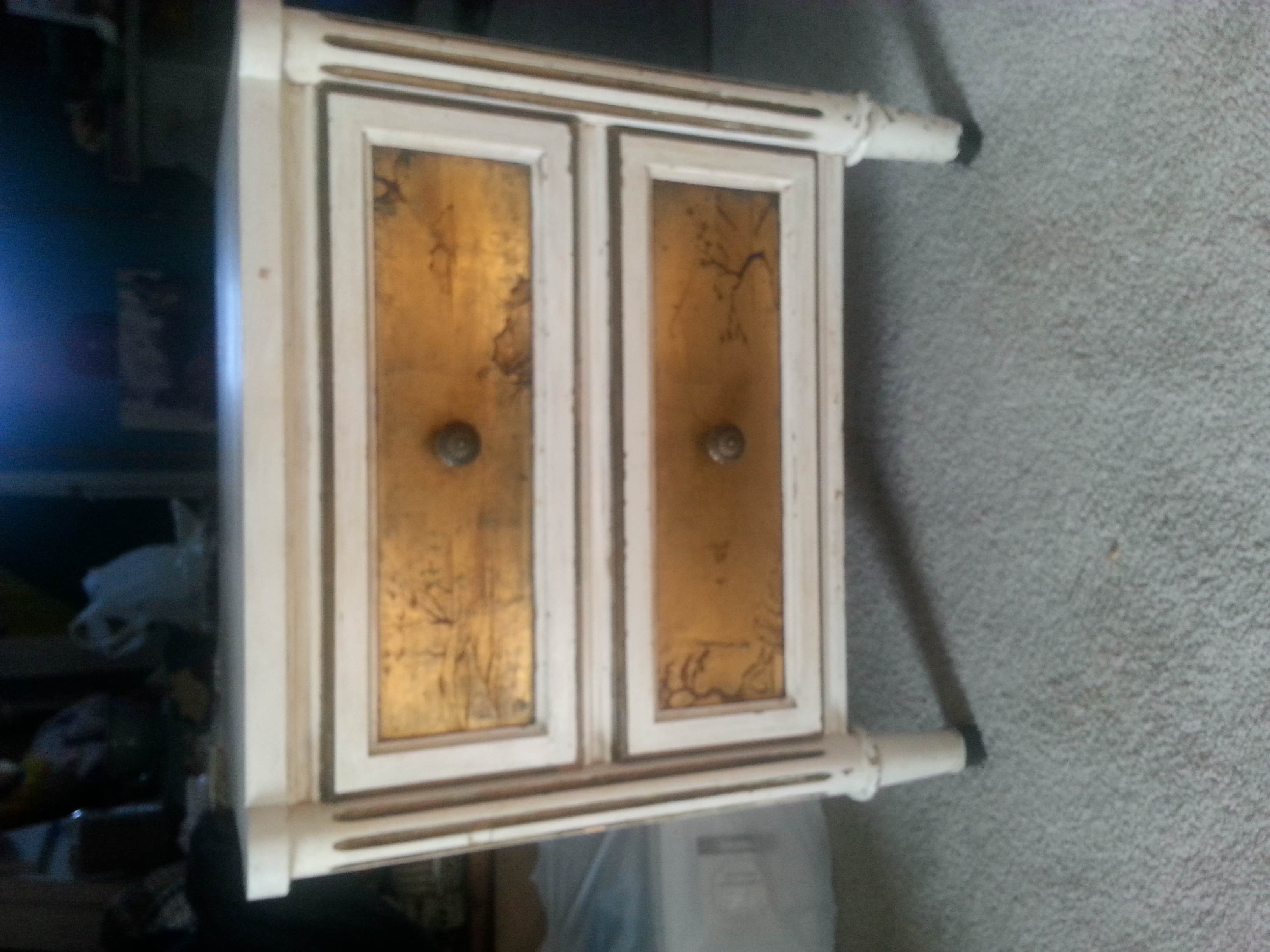 Johnson furniture company of Grand Rapids, Michigan. Antique white nightstand with Calligraphy style paining on drawer fronts. Is in good condition and solid wood. About 2 feet tall 2 feet wide 18 inches deep