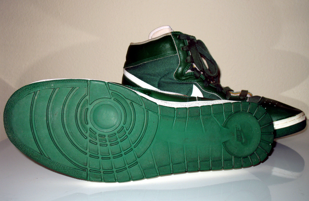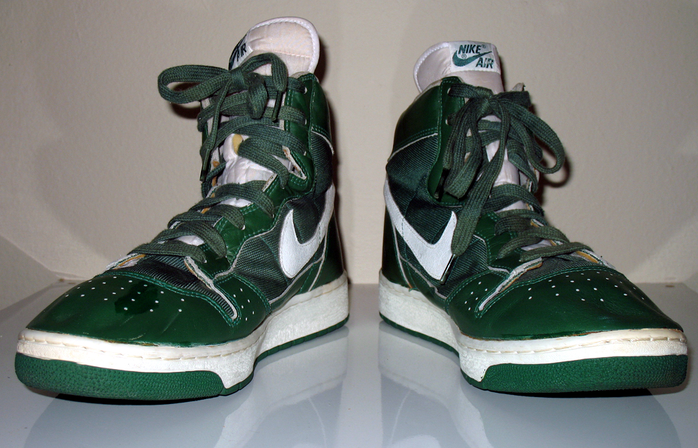 Pair of Nike Air High Top Tennis Shoes. Colors Green and White with green laces and green soles. This particular shoe was procurred from a Nike Sales Rep in the mid 1980's. The rep had said he had just returned from Boston and had this particular pair of shoes. It is possible that this shoe in these colors were never produced for the general public sale. The only markings on the shoe are the size 14 1/2 and the numbers (840304-TYPS1. They have been worn only once but do show some slight deteriation