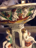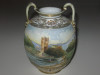 Nippon 12" three handled vase with raised gold dots, handpainted roses with green swirls painted on the vase. Brushed gold around mouth of vase and bottom has gold swirls.