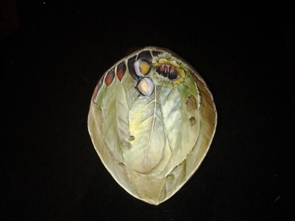 it is a nippon acorn candy dish with raised leaves and is in mint condition it has the light green makers mark its about 7inches long by6inches wide