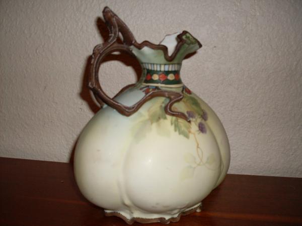 pastel colored pitcher with wooden branch like handle with raised white dots along its length. an indian style motif neck band and an autumn season floral pattern with brown leaves white painted flowers off white/light purple raised flower .green and brown painted leaves with some light purple hues and purple blackberrys.lots of detail .very hard to describe it all