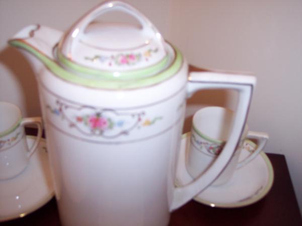 Nippon Chocolate set. Set includes one pot and four cups and saucers. All are in excellent condition with the exception of a small hairline fracture near the top of the spout.