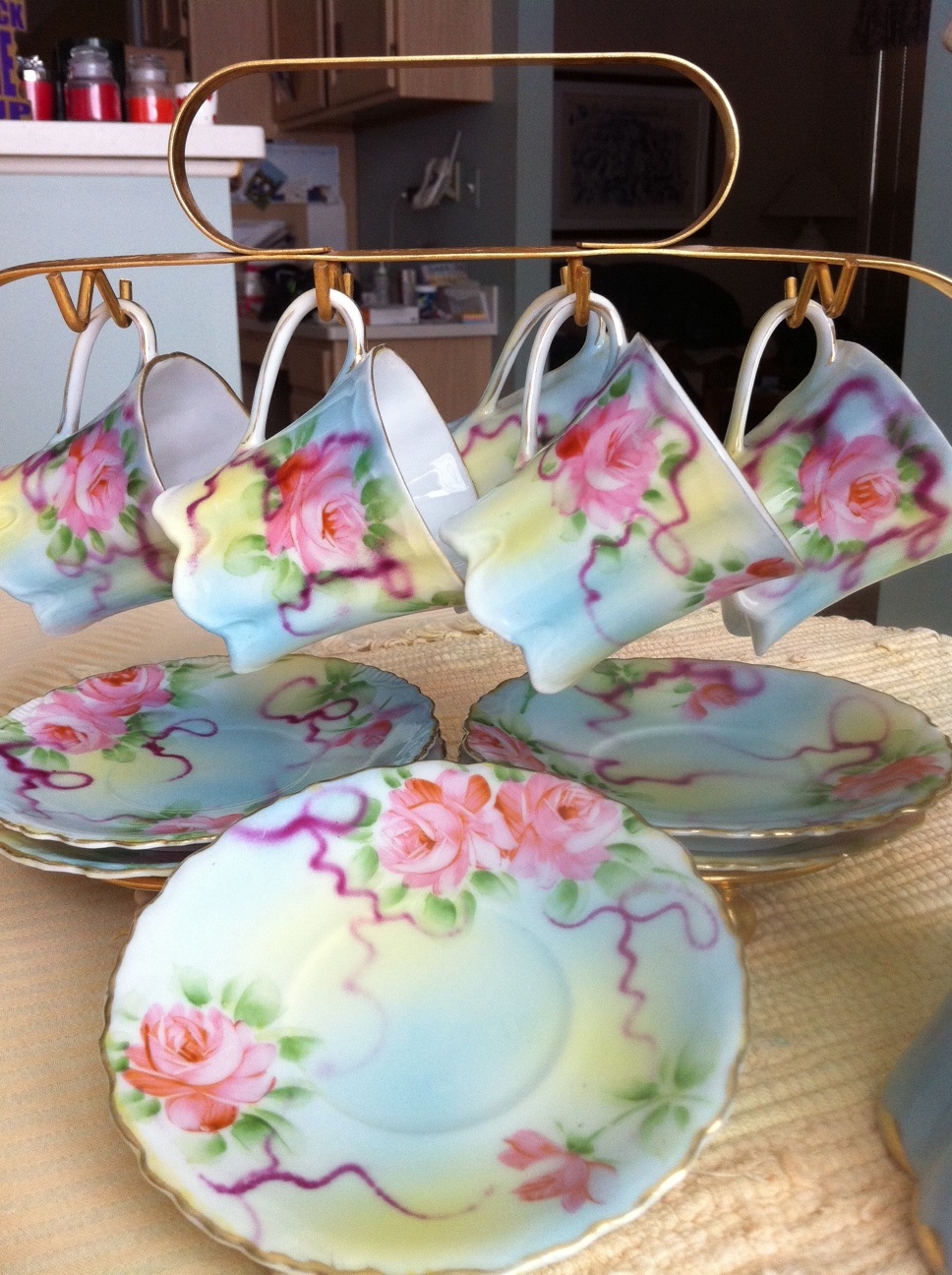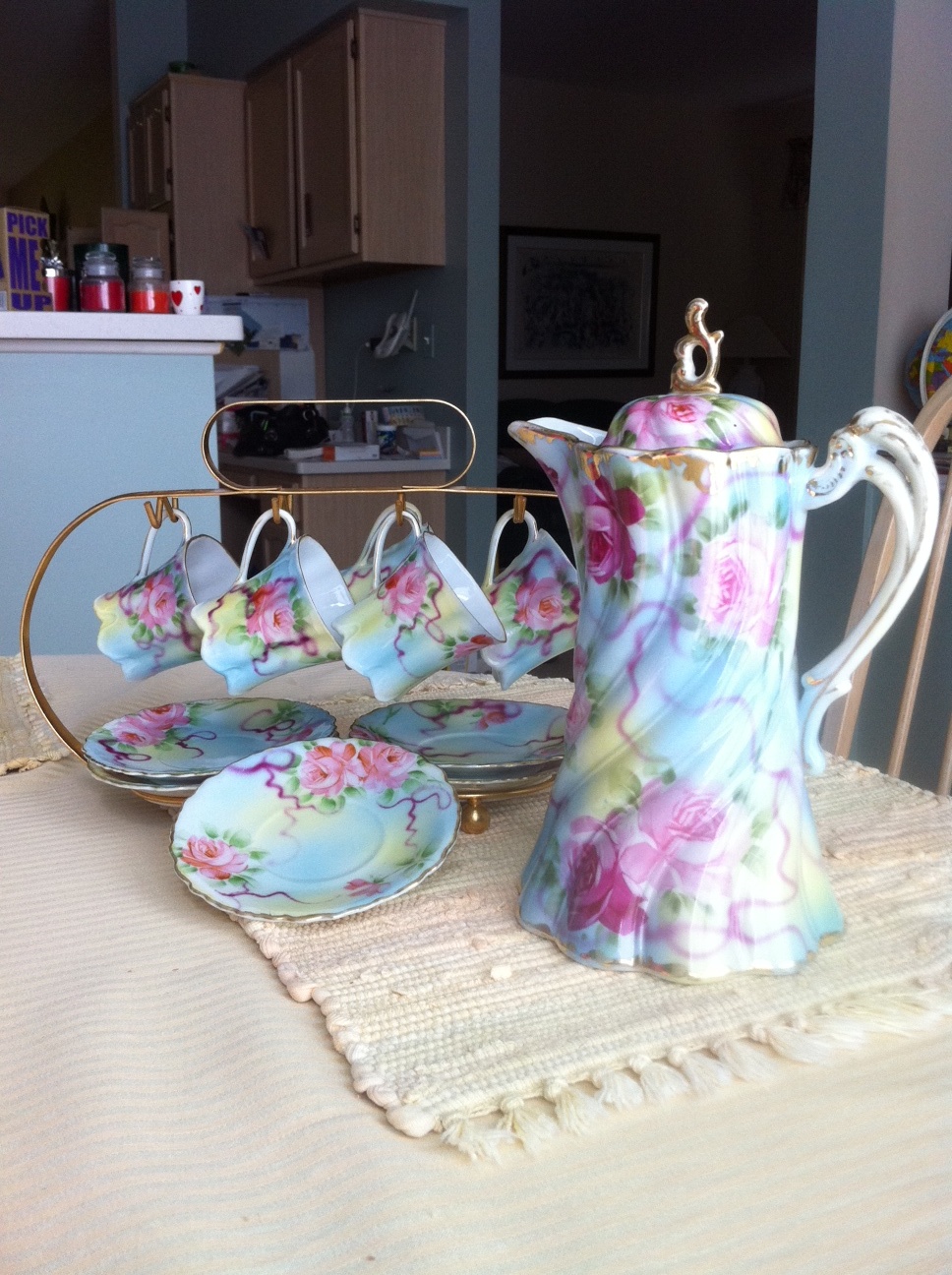 Family owned Coffee service for 5 - gold plated cups, tea pot, plates and service stand