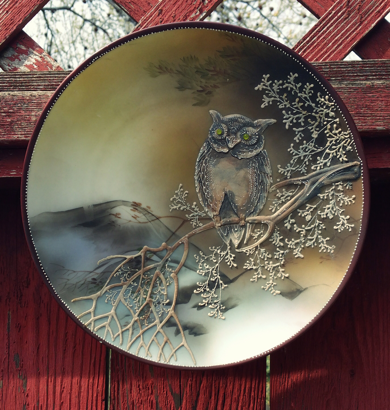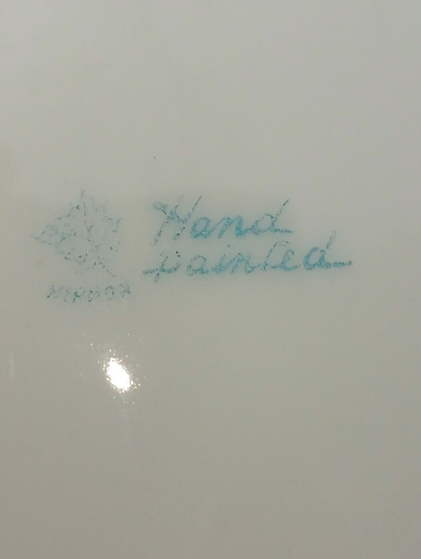 I bought a Nippon Hand Painted plate at an estate sale. It is of an owl on a tree branch with mountains behind it. The owls eyes are raised (beaded) and green. On the back of the plate there is a leaf with the word NIPPON on the left side. And the words "Hand Painted" on right side.