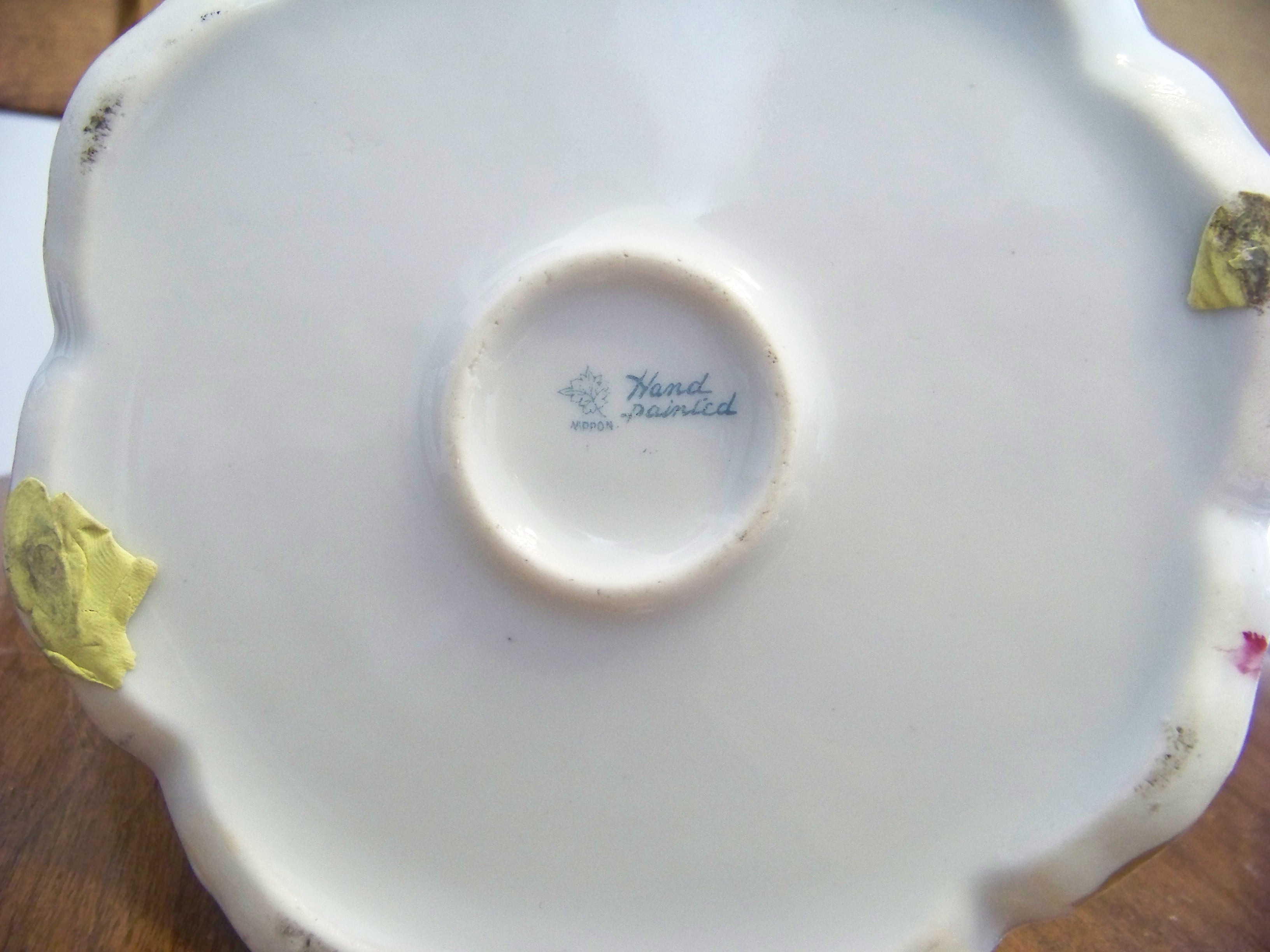 Nippon hand painted pitcher, 7.75" tall, 6.75" dia. bottom, 4.75" dia. top. Has 2 hairline cracks along on side.