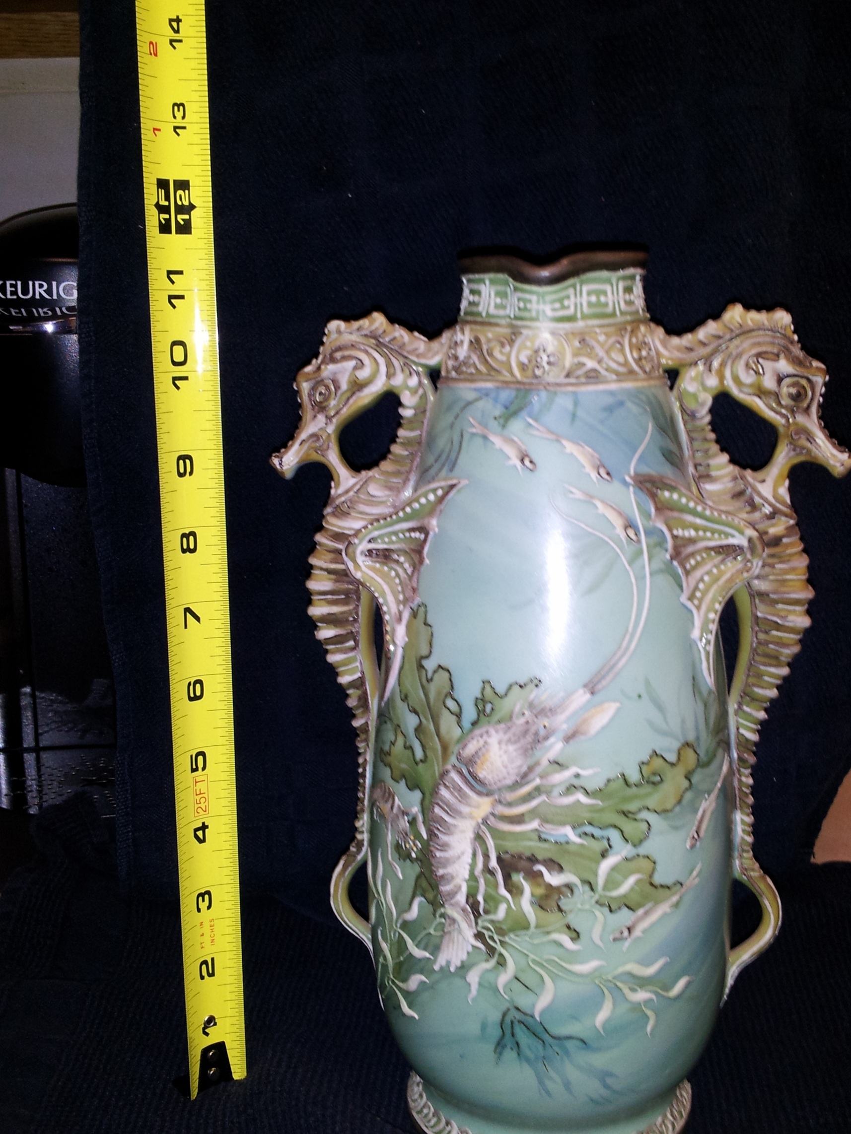 This vase/urn belonged to my grandmother for as long as I can remember. I recieved it when she passed away (basically because the consensus was that it was ugly and no one wanted it) I do not know when she got it or where. The little bit of information Ive come up with makes me believe its a Moriage. It's a blueish grey under the sea scene. The handles are seahorses and on the front is a shrimp or lobster, and a few other assorted fish. On the bottom it has the blue maple leaf marking that seems to be the right size and the words "NIPPON Hand Painted" as well. Any ideas what I have here?