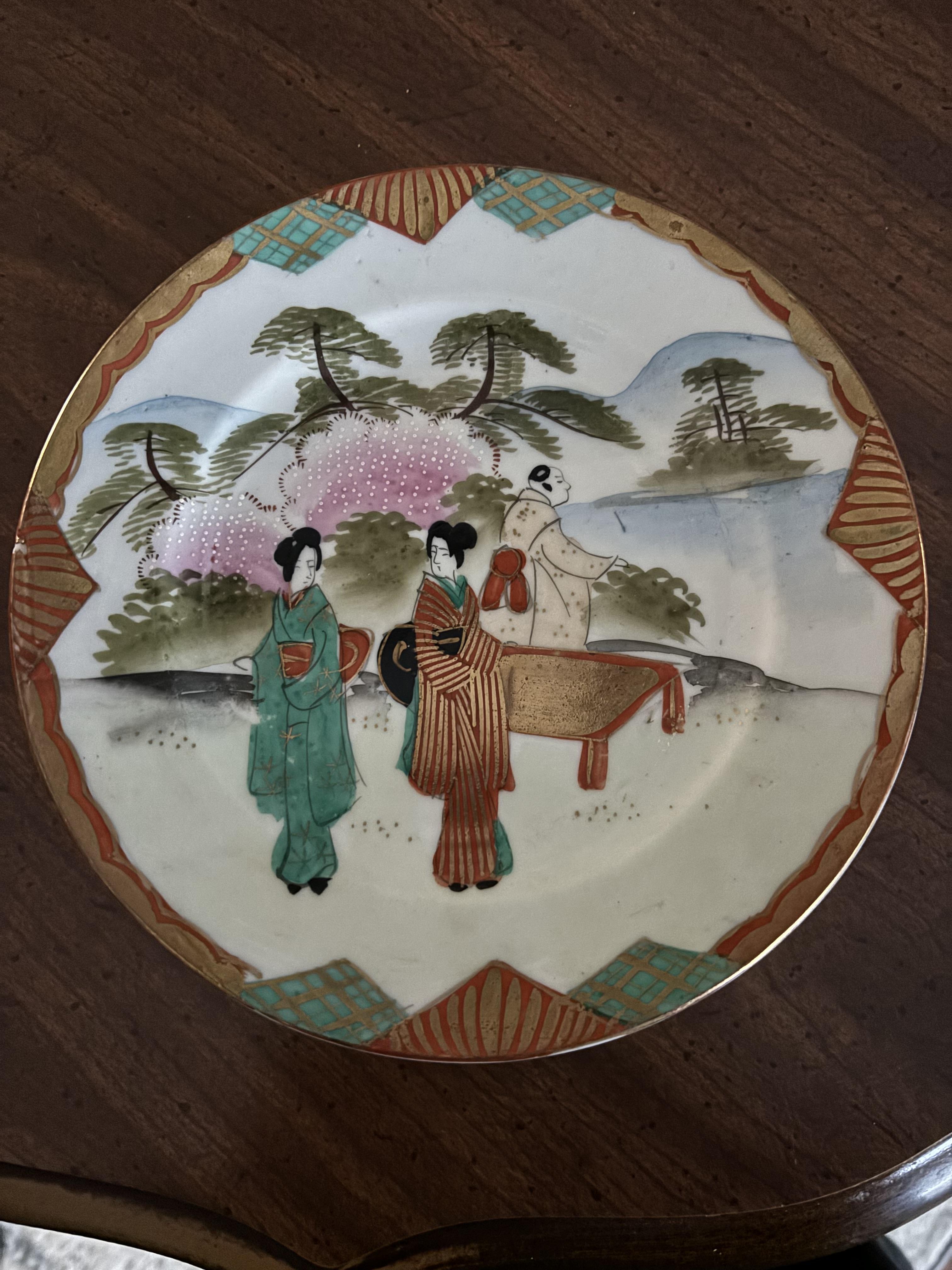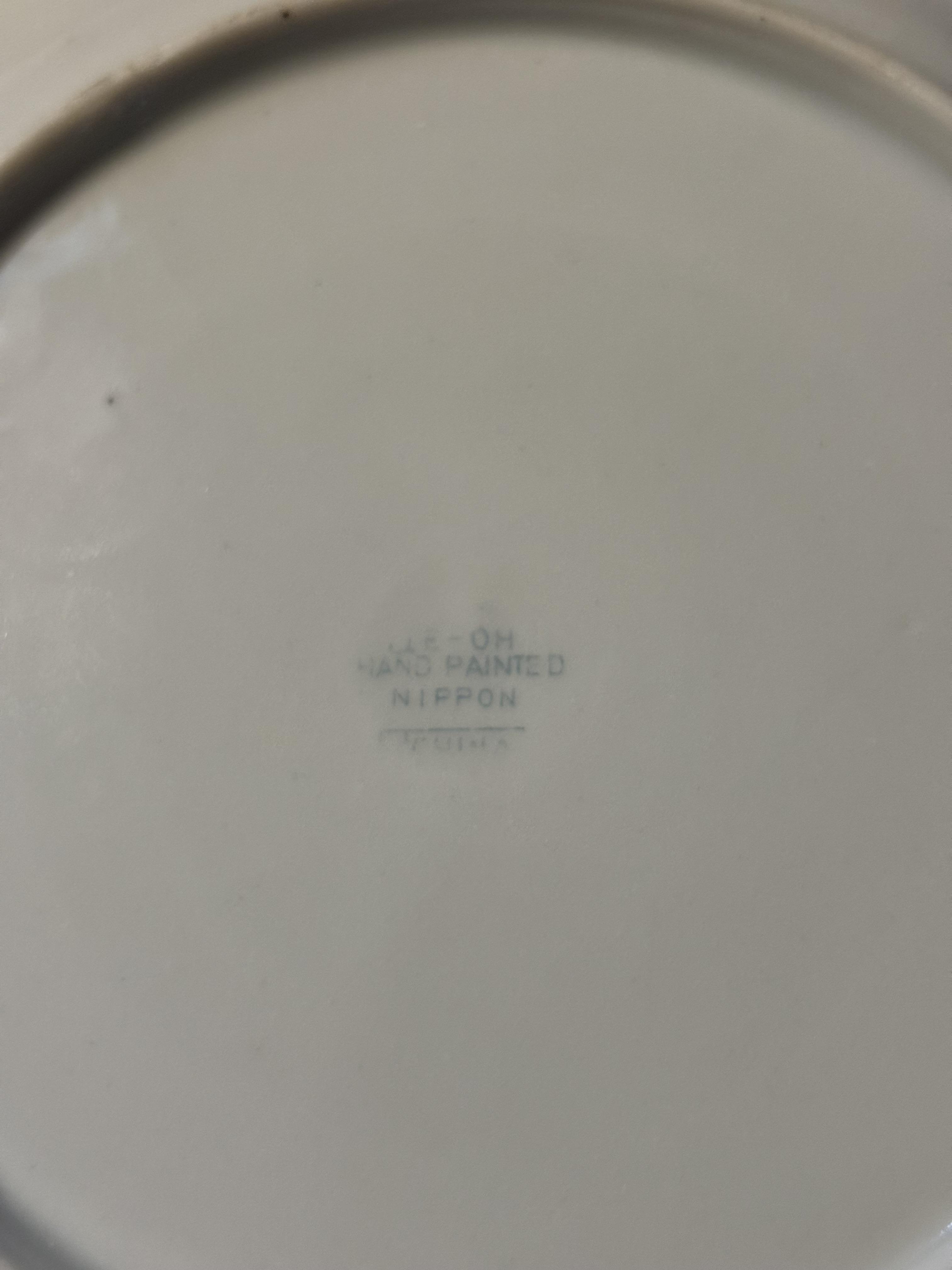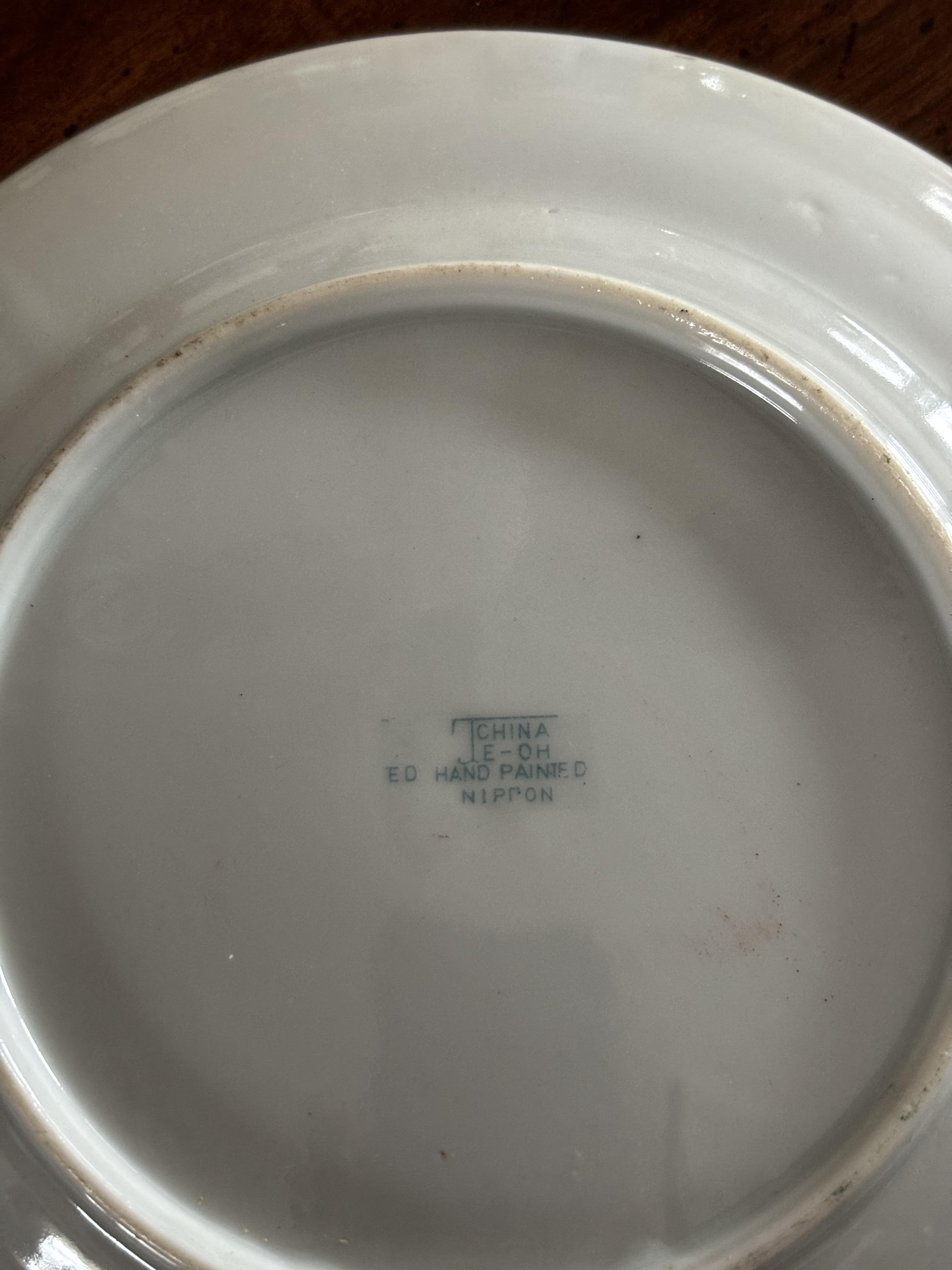 Two hand painted plates from Nippon. They are both the same scene. I couldn’t locate any marks that looked like this. Pictures are of one front and both backs.