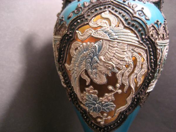 Though I have found 2 vases with similar molds to this vase, I have not found another listing with a phoenix and peony on a gold medallion with the primary turquoise blue enamel.