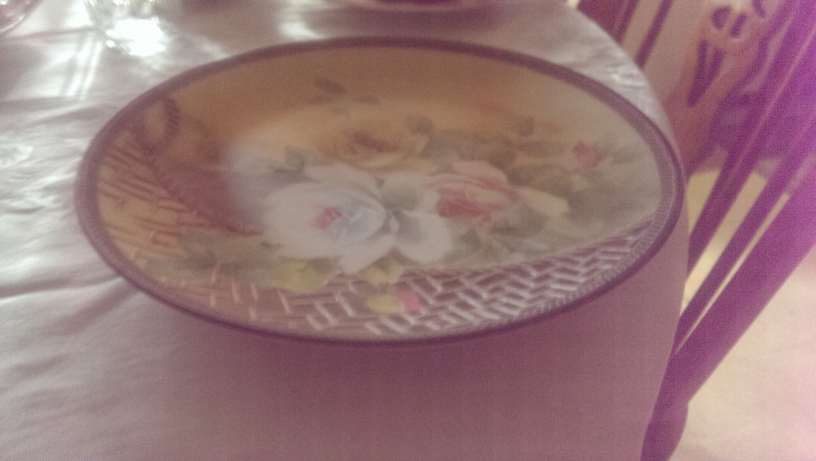 It has yellow, white and pink roses that appear to be in a basket. The basket weave is raised, as well as the trim of the plaque. It is pierced on the back, with a wire attached for wall display. The background colors are yellows, with some browns near the basket area. It is round, and the size of a large dinner plate.