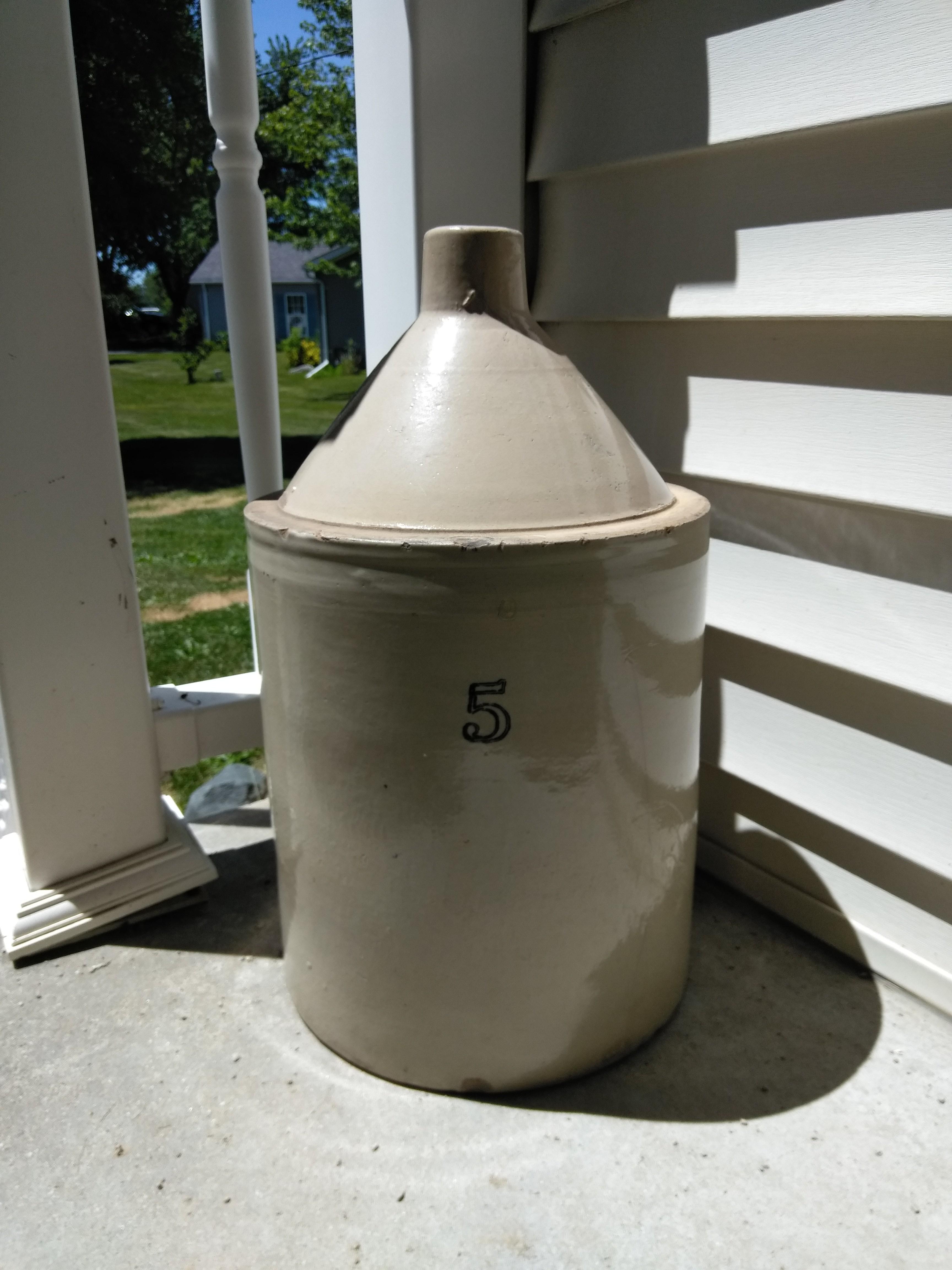 5 gallon stoneware jug. It has a few dings and scratches but otherwise in great shape. There are no other distinguishing marks.