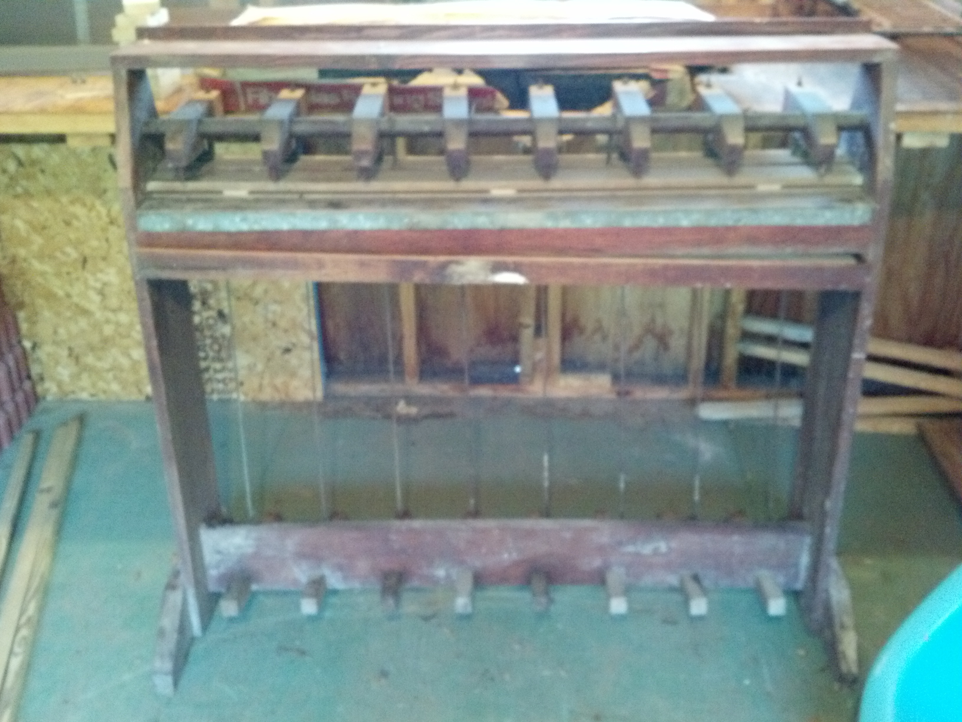 Found this in my shed when we bought a house. No clue what it is. Any input would be helpful. It has 8 pedals on bottom and when pressed the corresponding spool thing above it moves up.