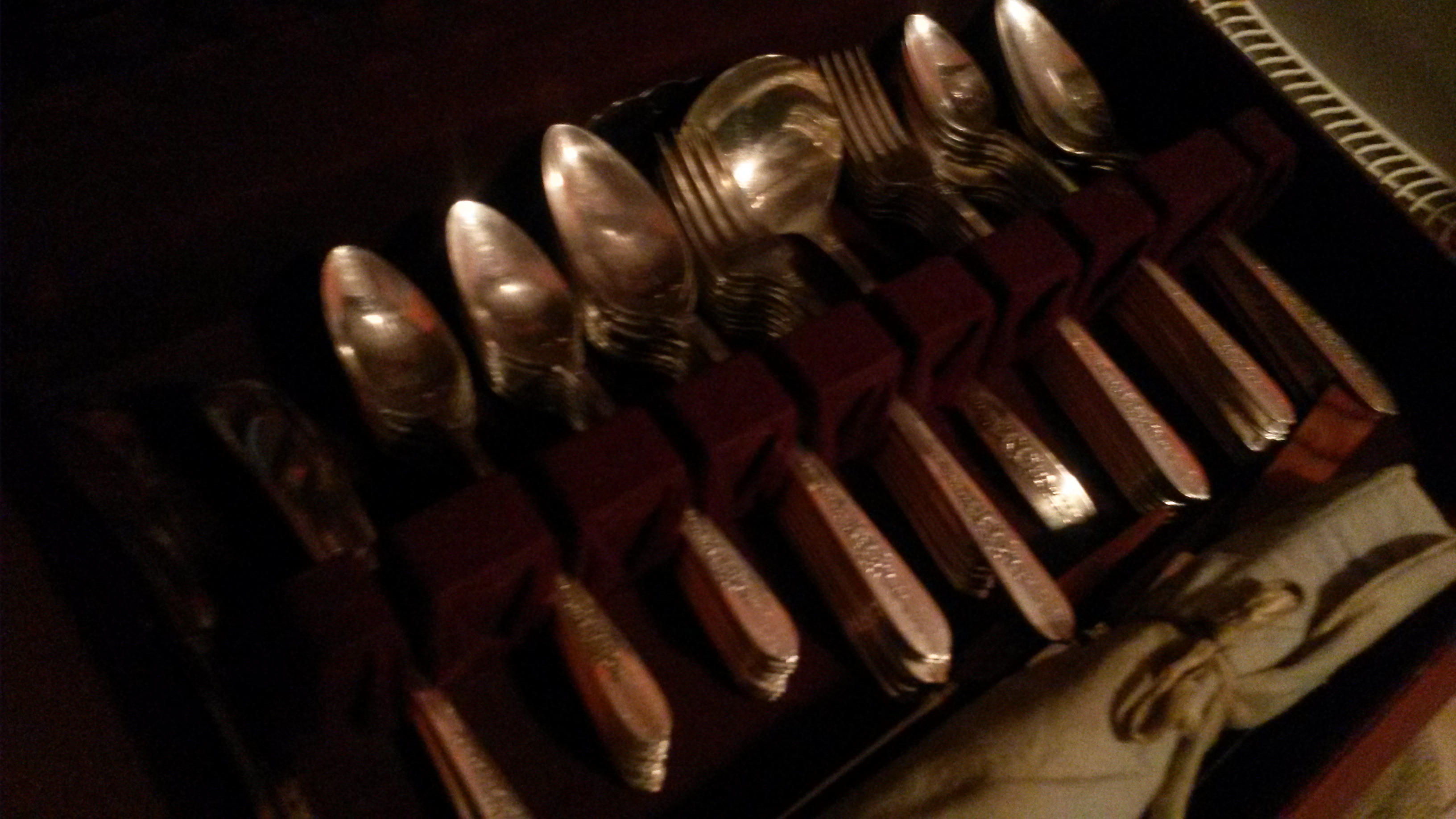 Full service for 8 of Nobility Plate silverware, including serving utensils. Still in its original wooden box and in excellent condition. Circa 1950.