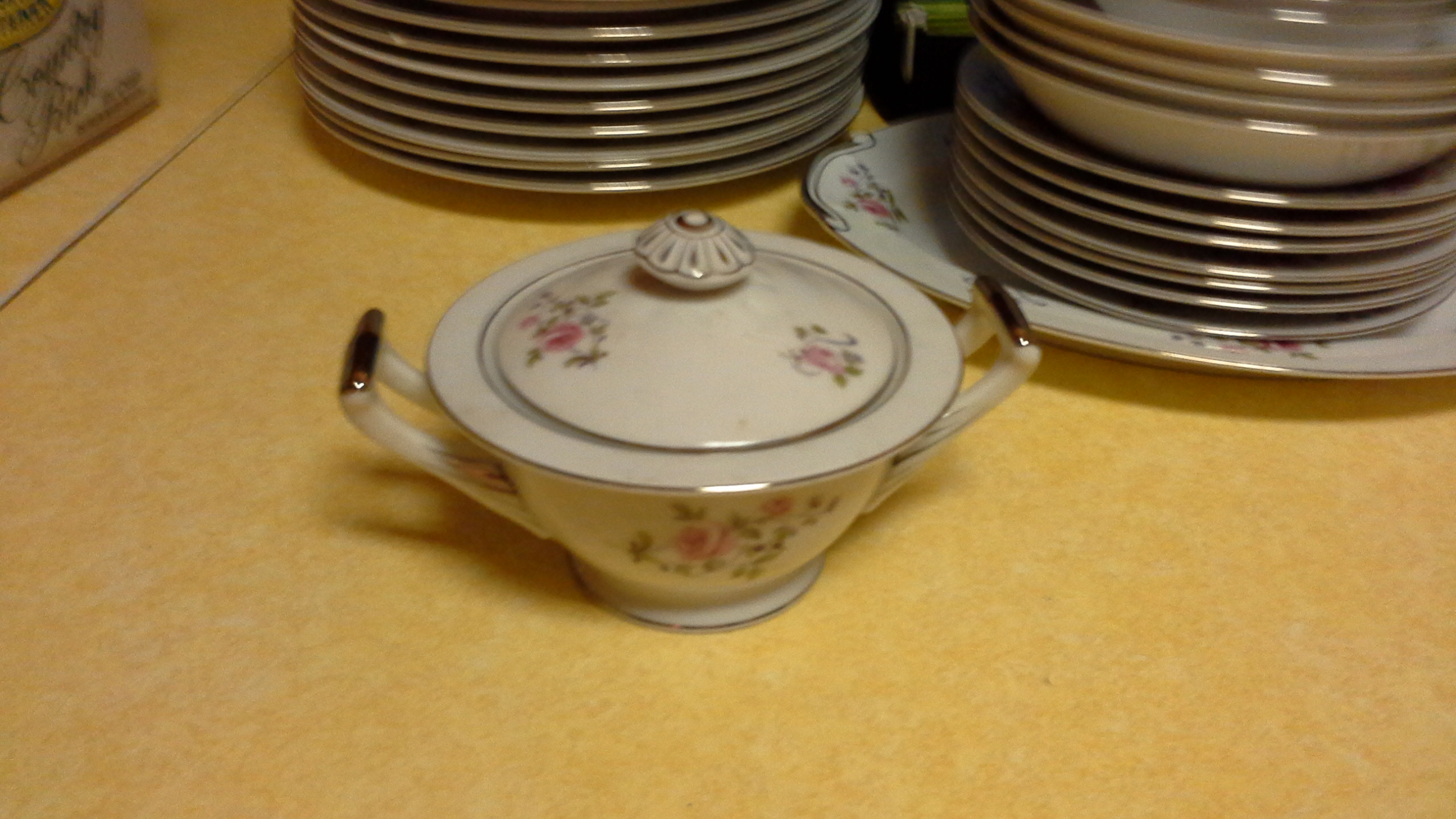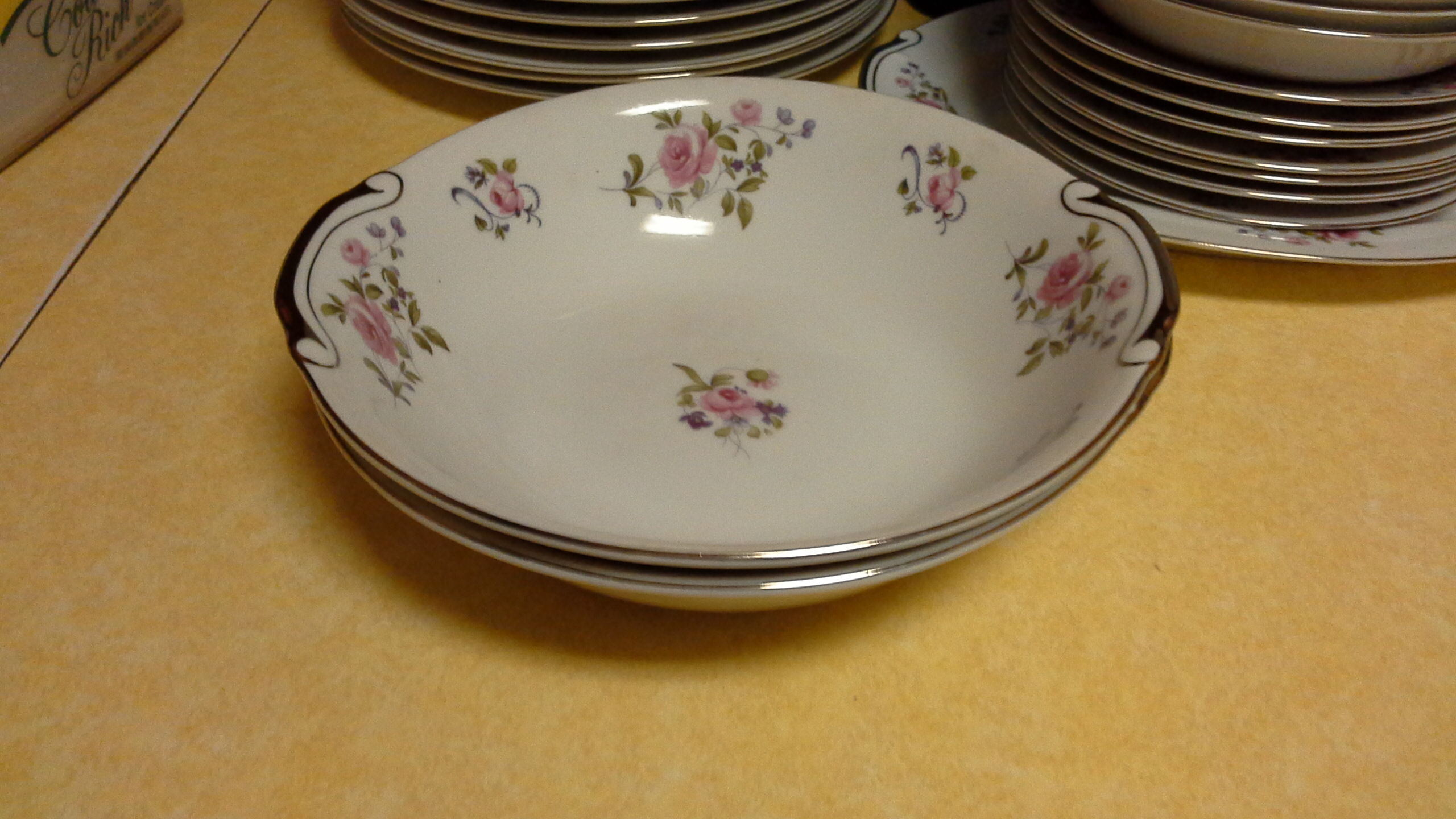 2 huge bowls 10 dinner plates 8 saucers 2 bigger saucers 1 tea pot and lid 8 mini bowls 6 big bowls 7 bigger saucers 1 huge gravy plate thing and 1 gravy pot 3 tea cups