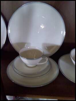 My collection includes 8 Dinner plates 8 salad plates 8 bread and butter plates 8 cups and saucers. A vegetable bowl, serving platter and creamer and sugar bowl with lid. All pieces are in excellent condition with no chips crackling or wear to the blue tone or the platinum edges. Also there is next to no signs of useage on the main part of the plate.