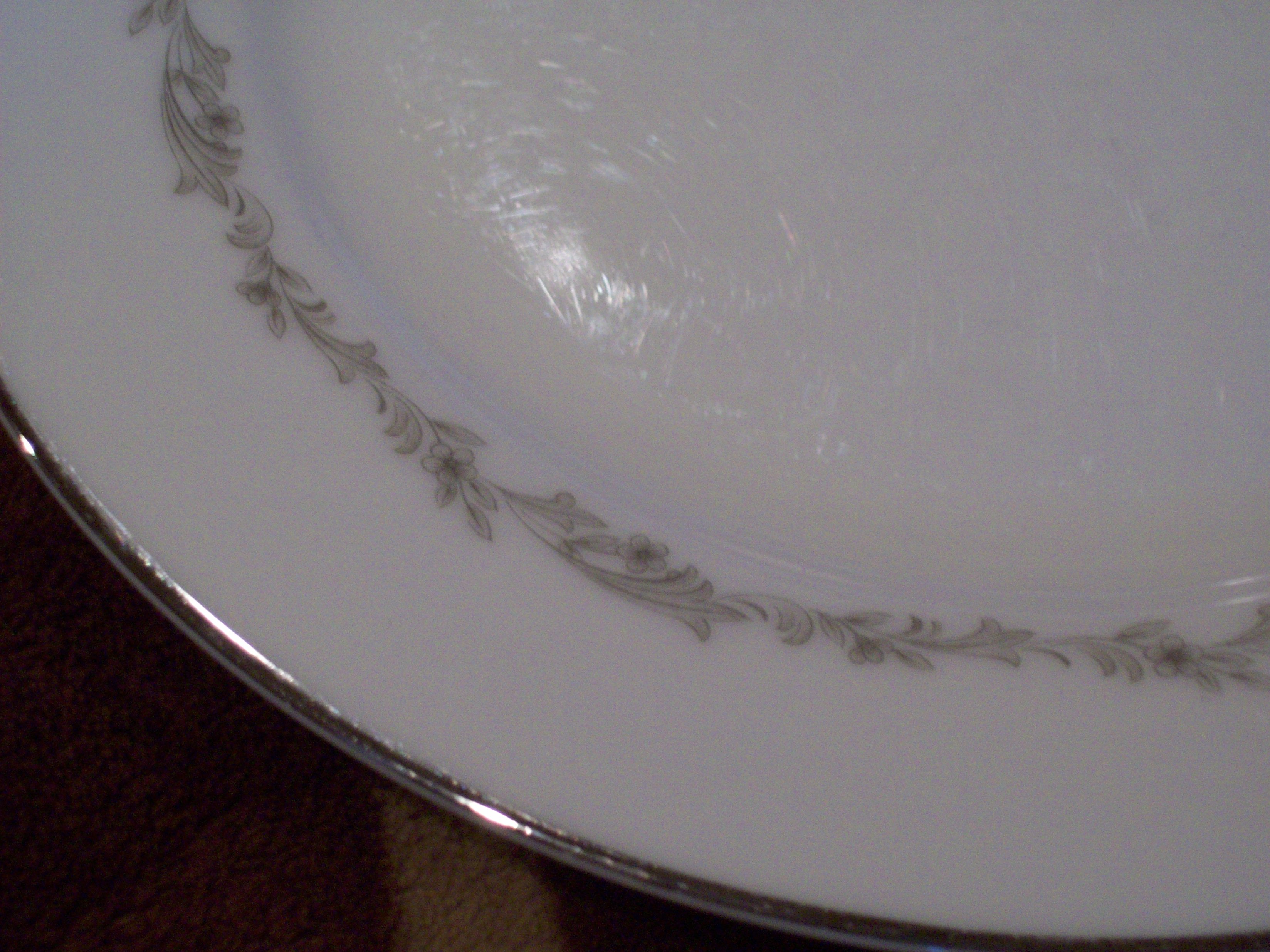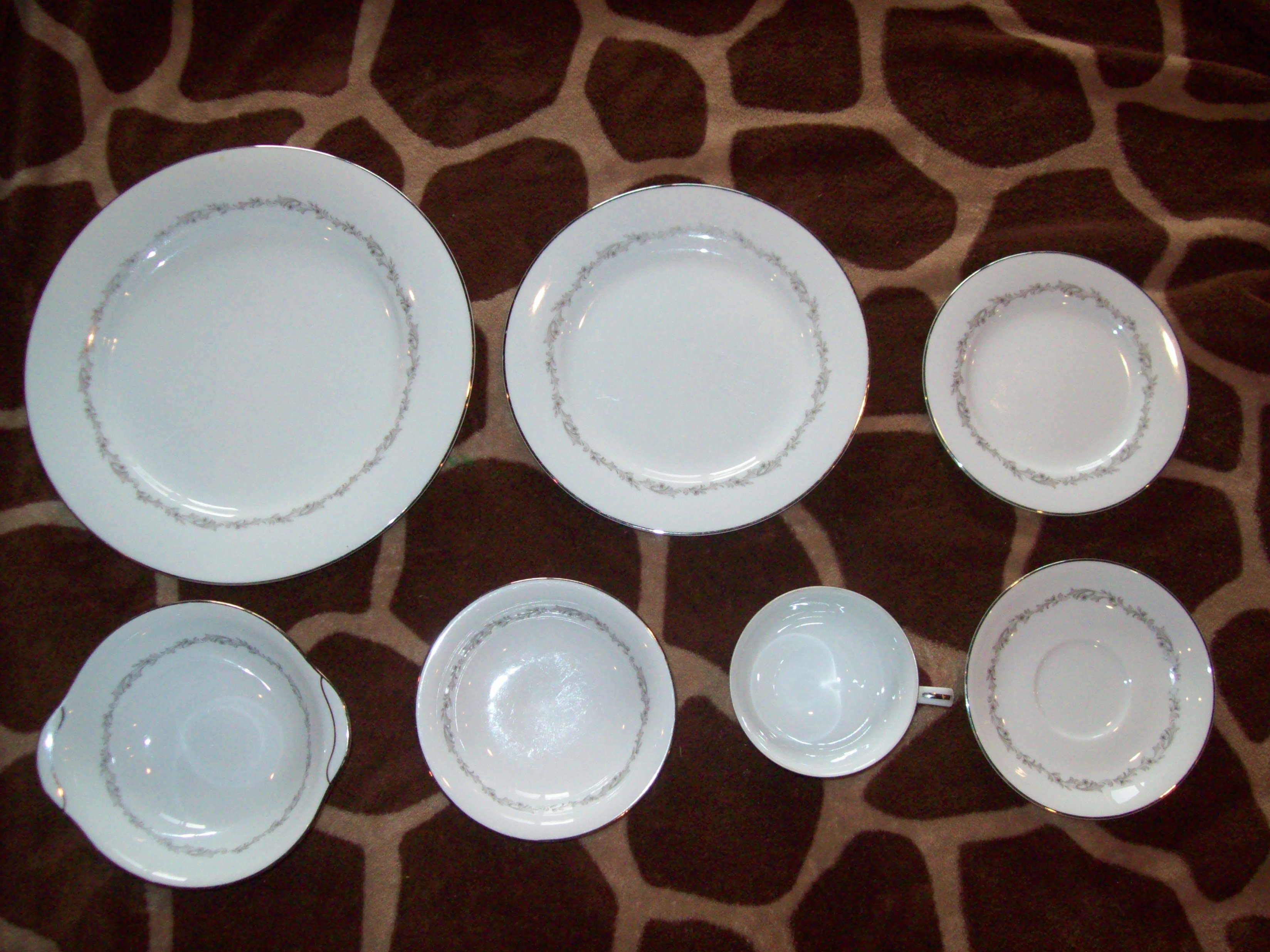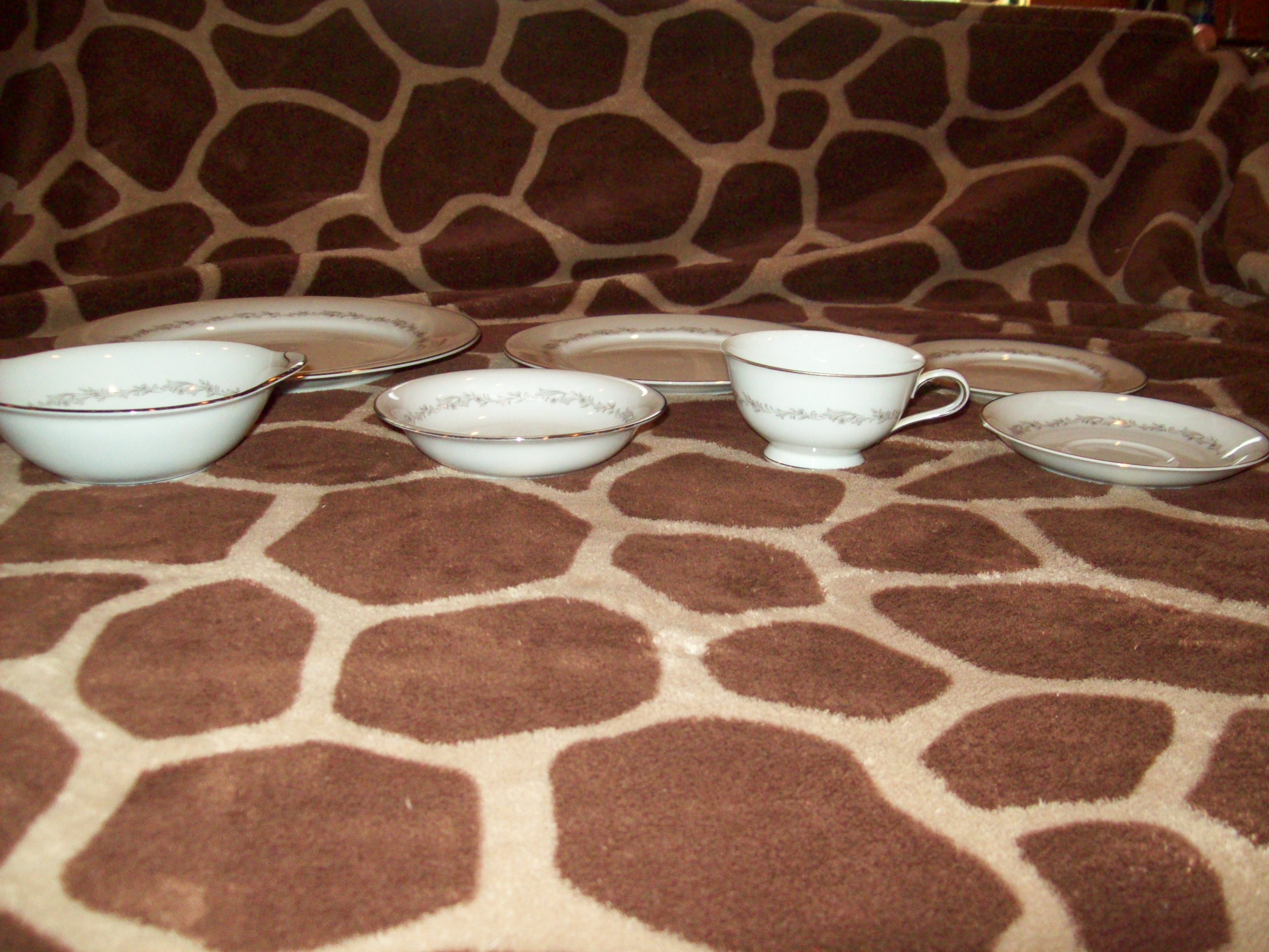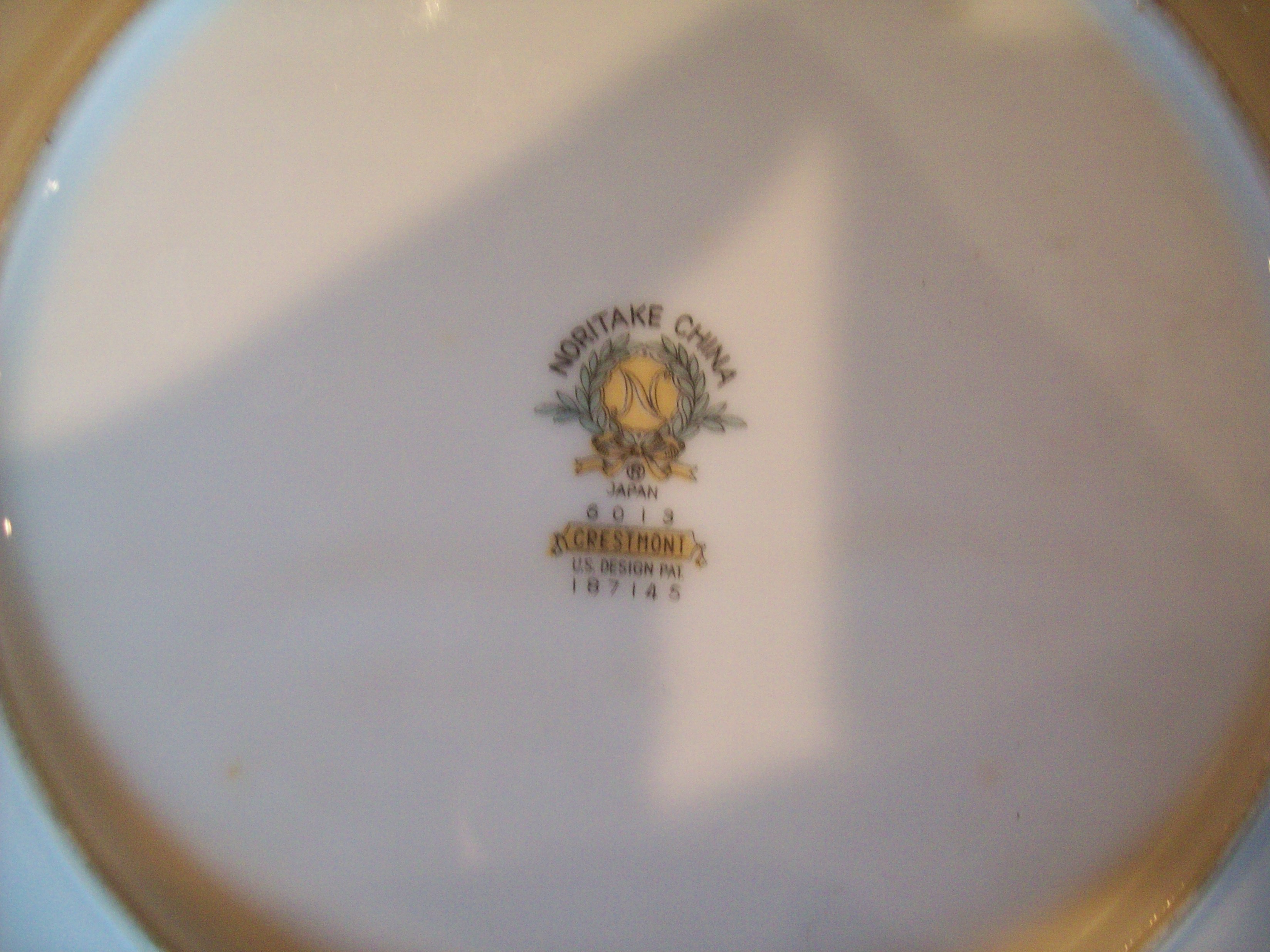 Noritake China dinnerware set that includes 13 large dinner plates, 14 salad plates, 13 pie plates, 13 saucers, 9 small bowls, 7 larger soup bowls, 12 cups, 3 plain white rice bowls(they may not be part of the set),about 4 pieces of the set have very small chips in them. The stamp on the bottom of the dinnerware says "Noritake China, Japan, 6013 Crestmont US Design Pat. 187145"