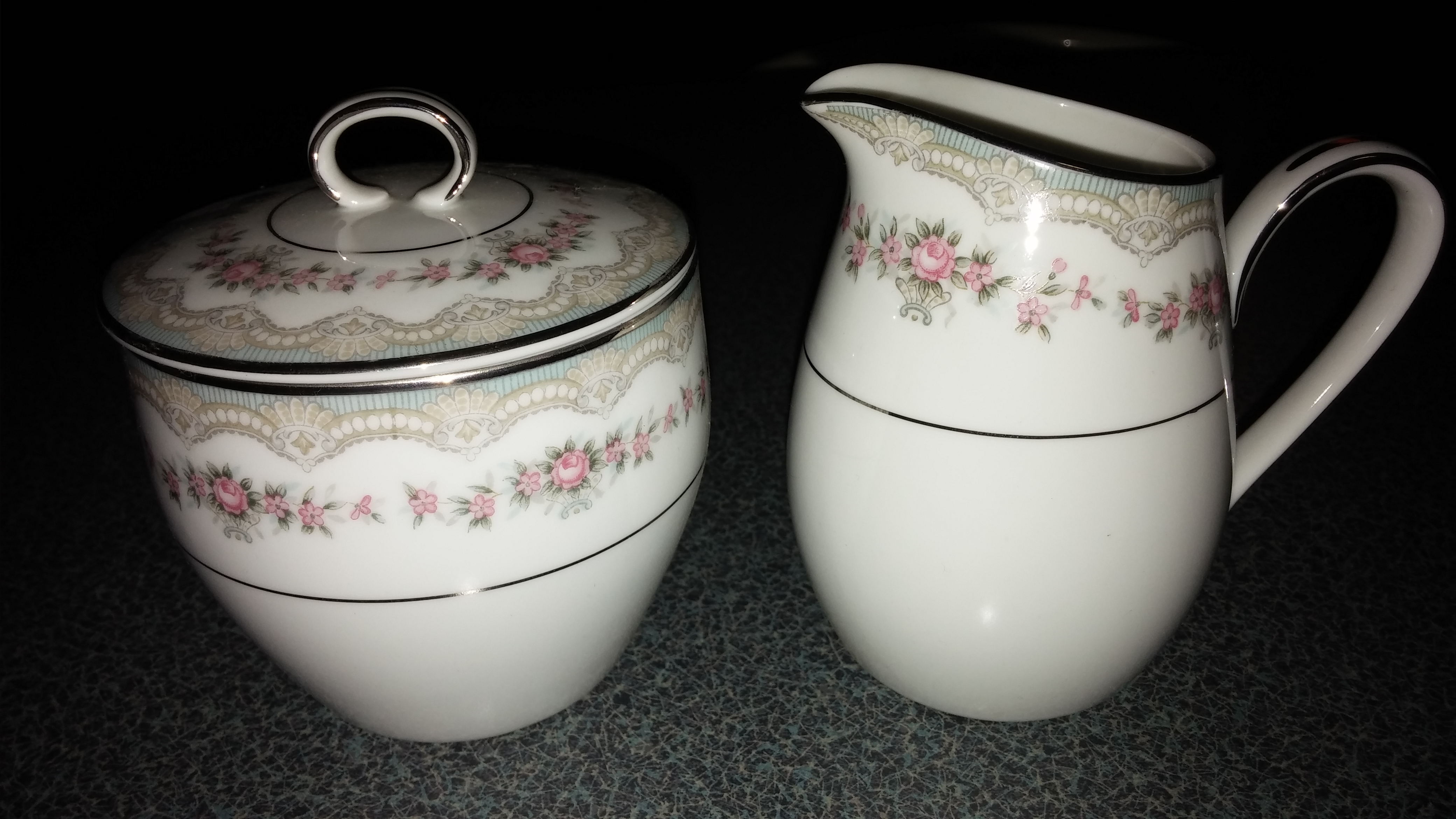 Noritake China - coffee/ tea set. Includes coffee/ tea pot with lid, creamer pitcher, sugar bowl with lid, 6 cups and 6 saucers. Delicate pink flower pattern with silver trim. Excellent condition. No chips, scuffs, worn paint or marks. Underside of each piece is stamped "Noritake China". Pictures included. Any information and appraisal would be much appreciated.