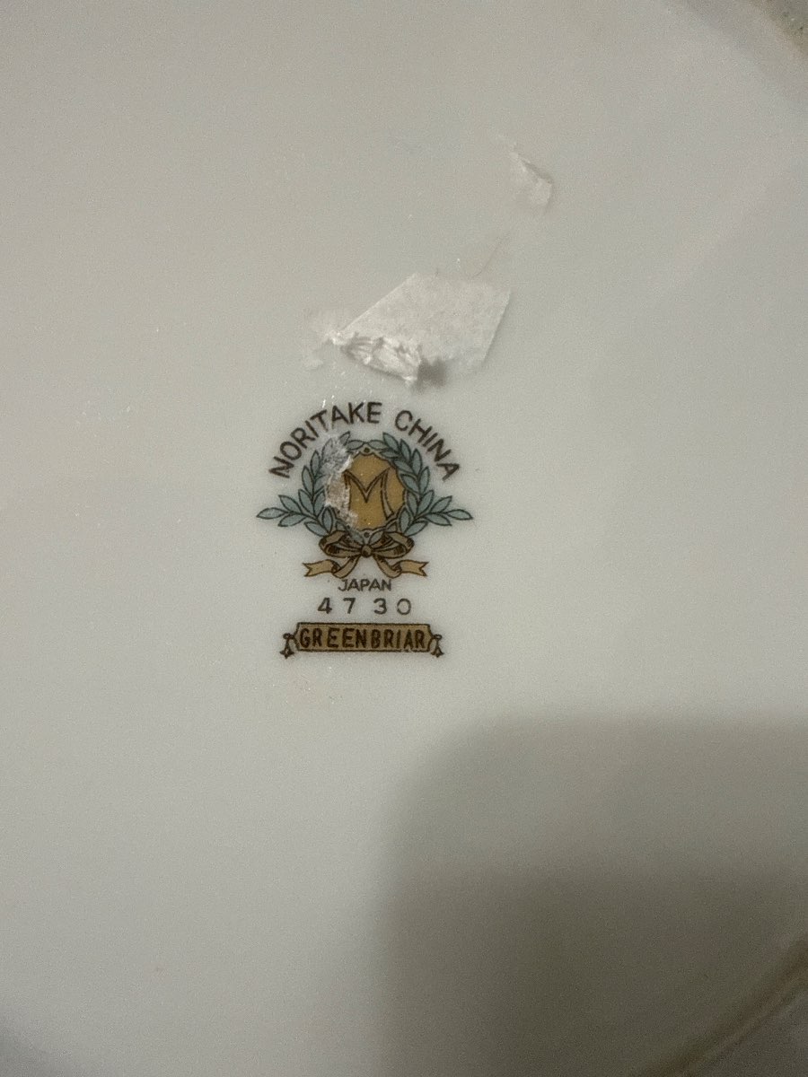 Physical Description: This is a porcelain plate from the Noritake China collection, specifically the Greenbriar pattern, marked with the number 4730. The plate features a delicate floral design with gold accents around the rim.