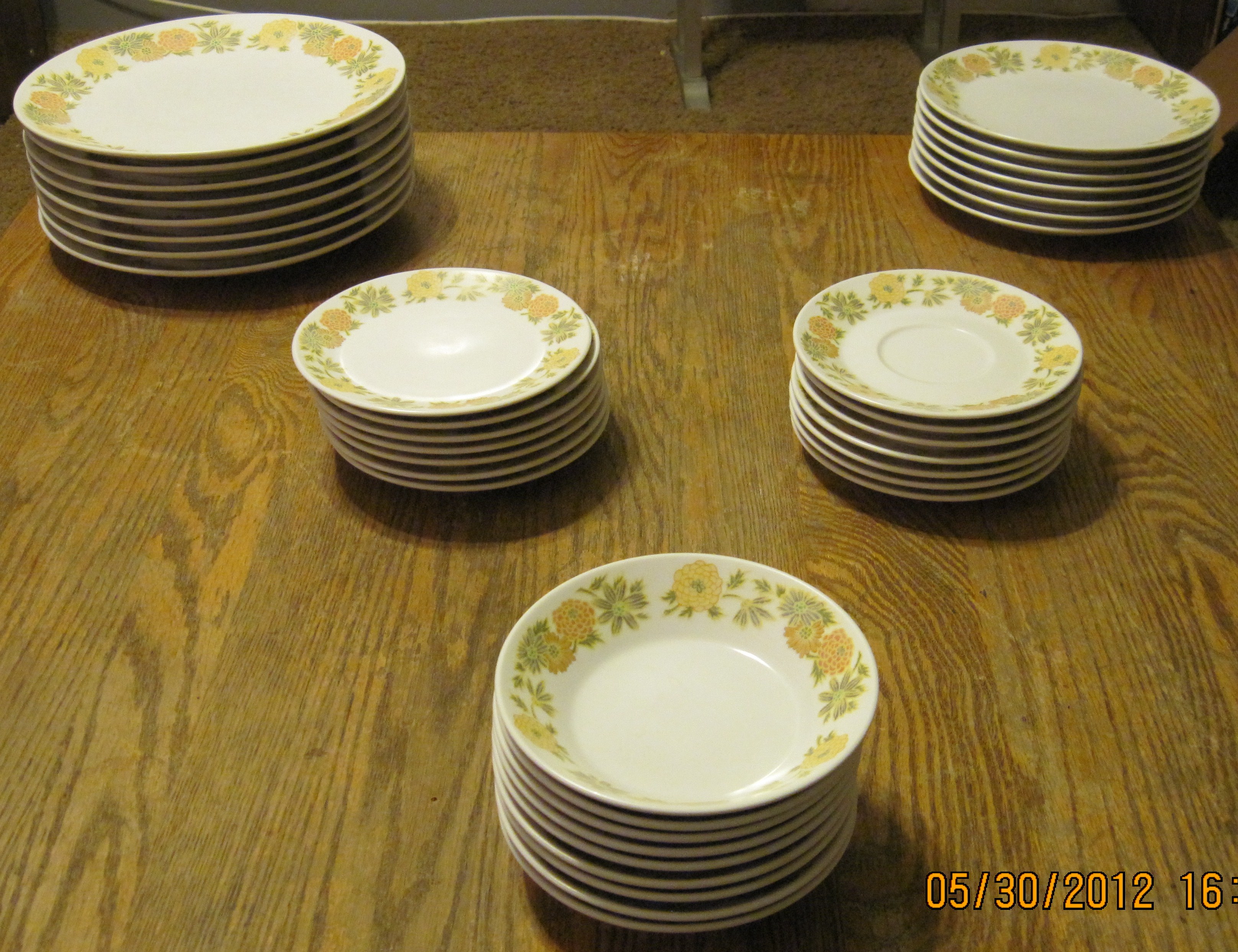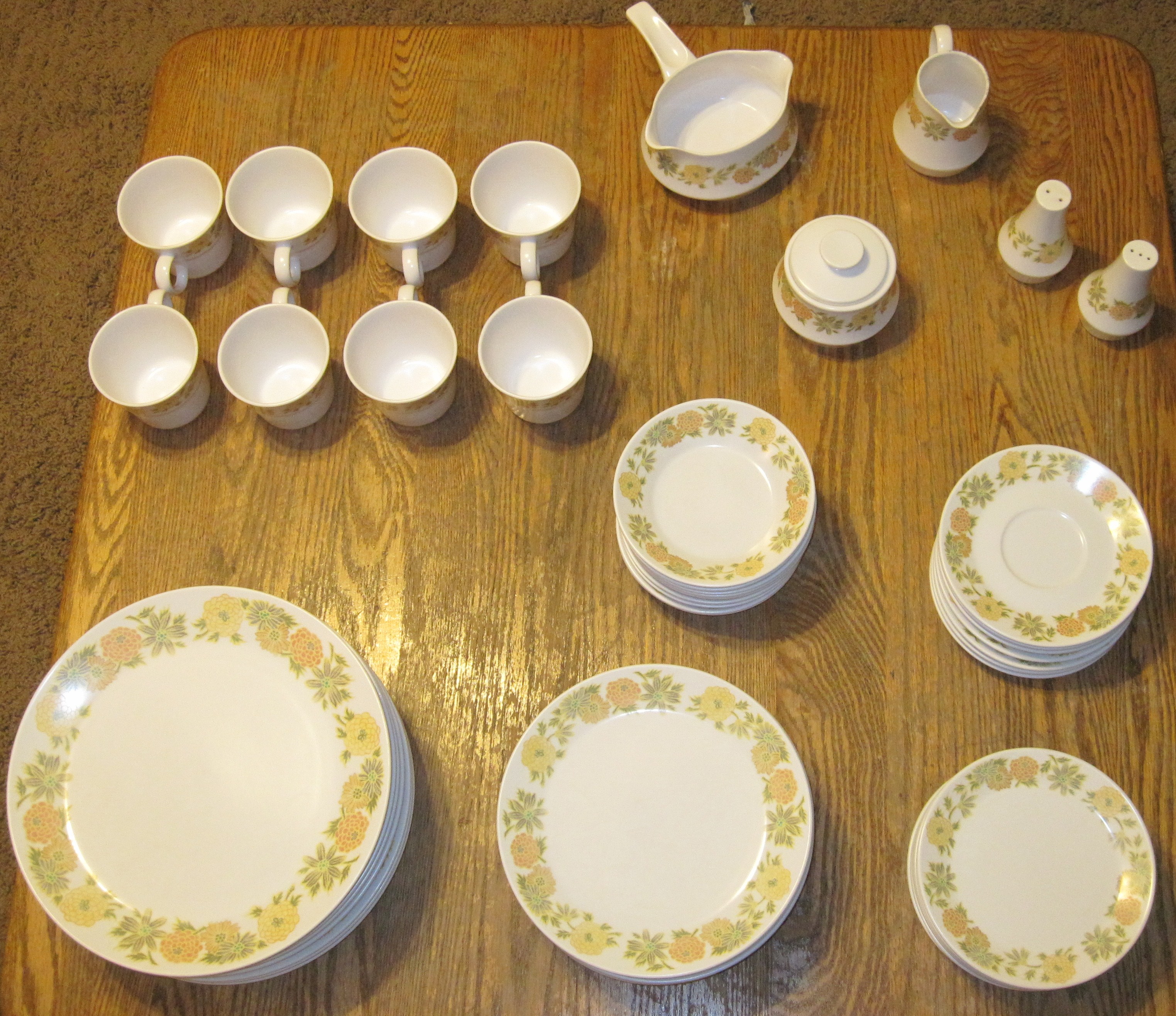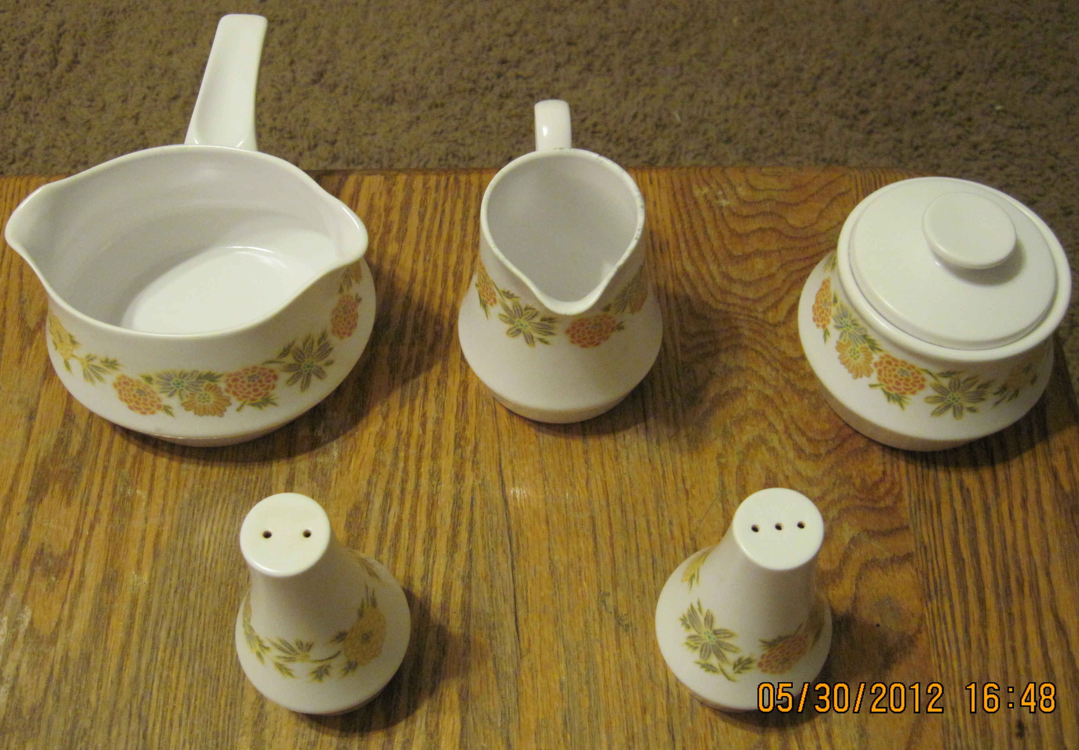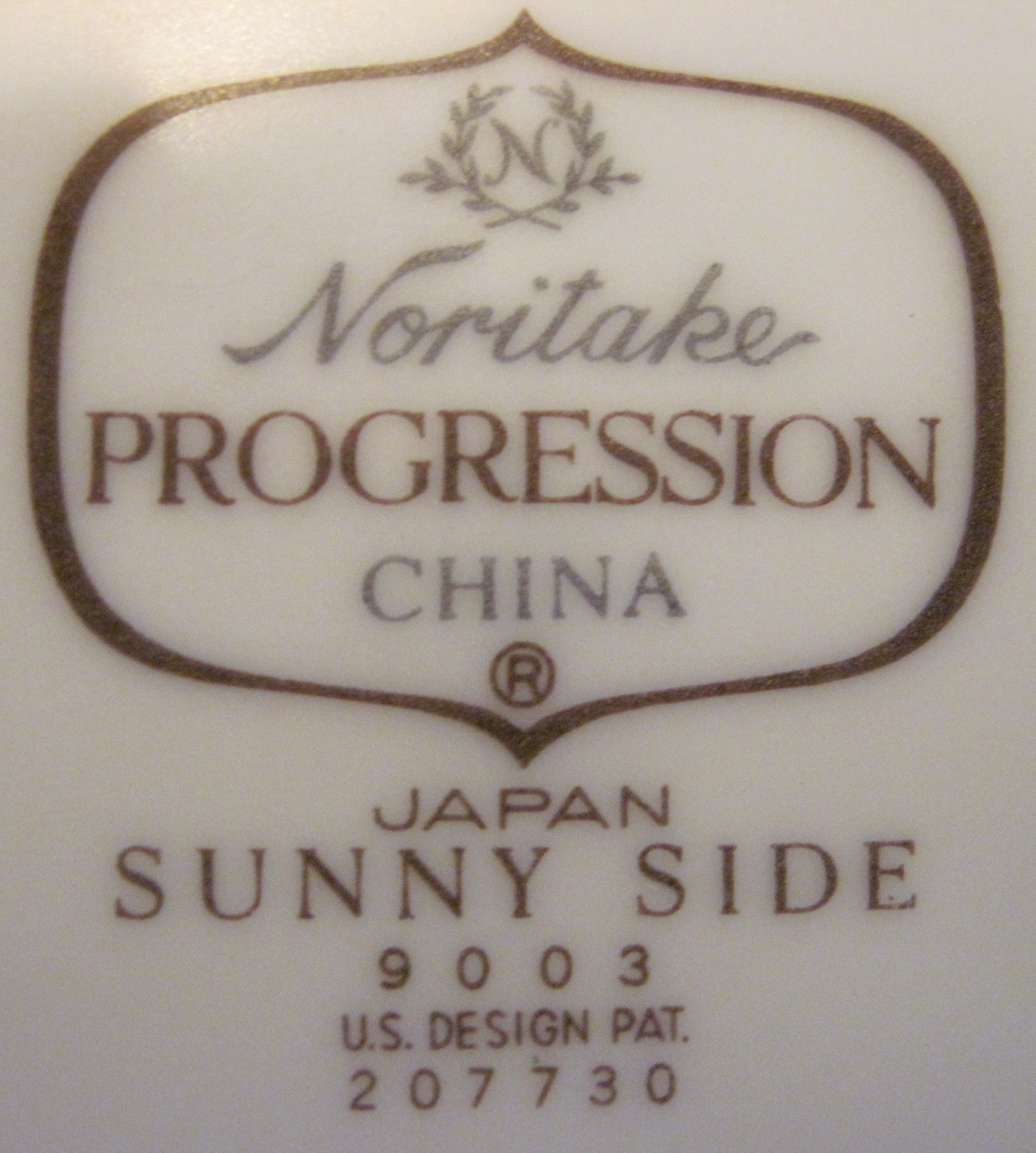 Noritake Progression China- Japan sunny side 9003 U.S. Design Pat. 207730 7- complete Flat cup/saucer set 1 extra cup 8- Dinner Plates 7- Salad Plates 7- Bread & butter plates 9- Fruit/dessert bowls 1 Creamer Container 1 Salt & Pepper set 1 Sugar canister with lid 1 Gravy BoaT