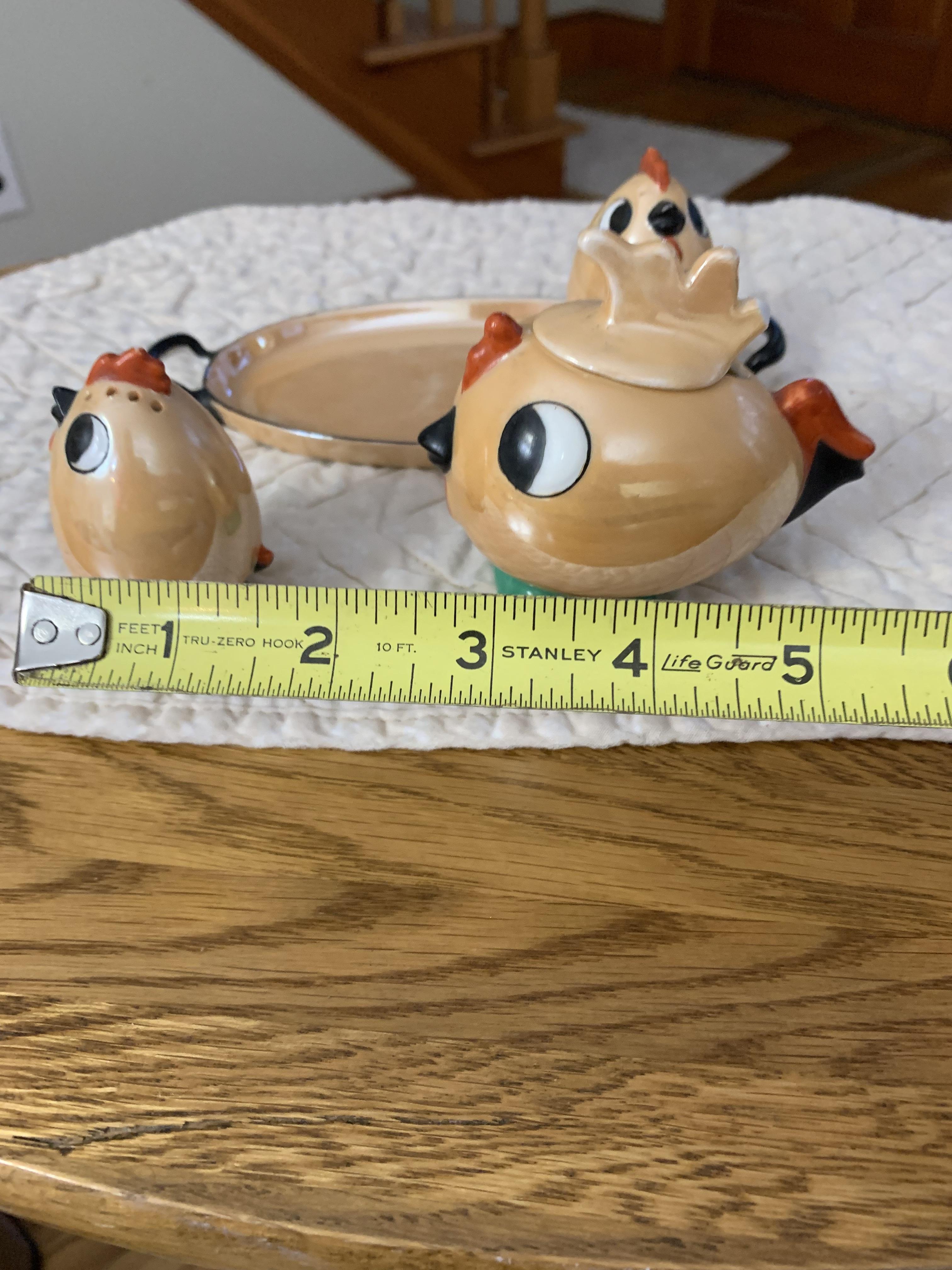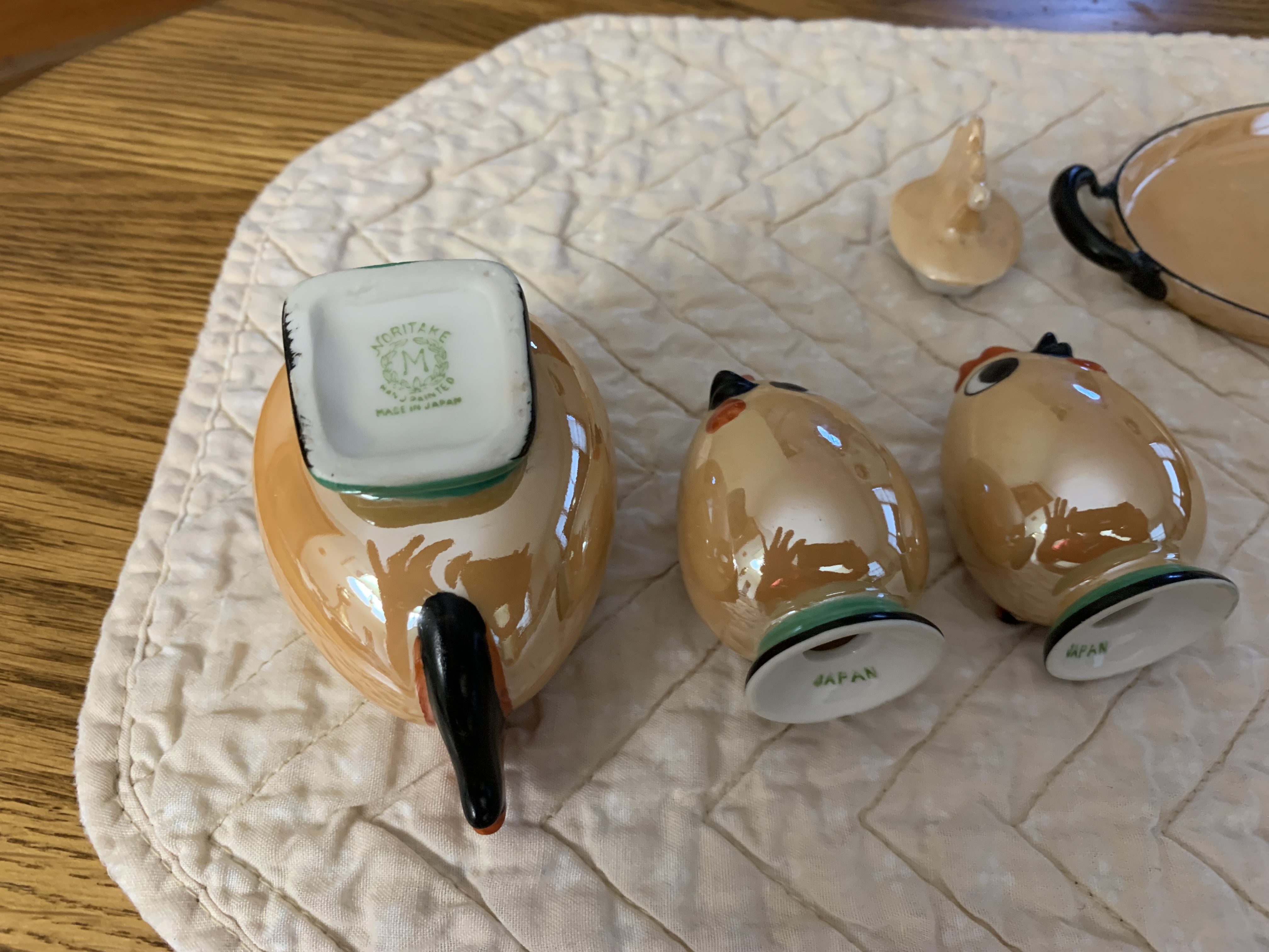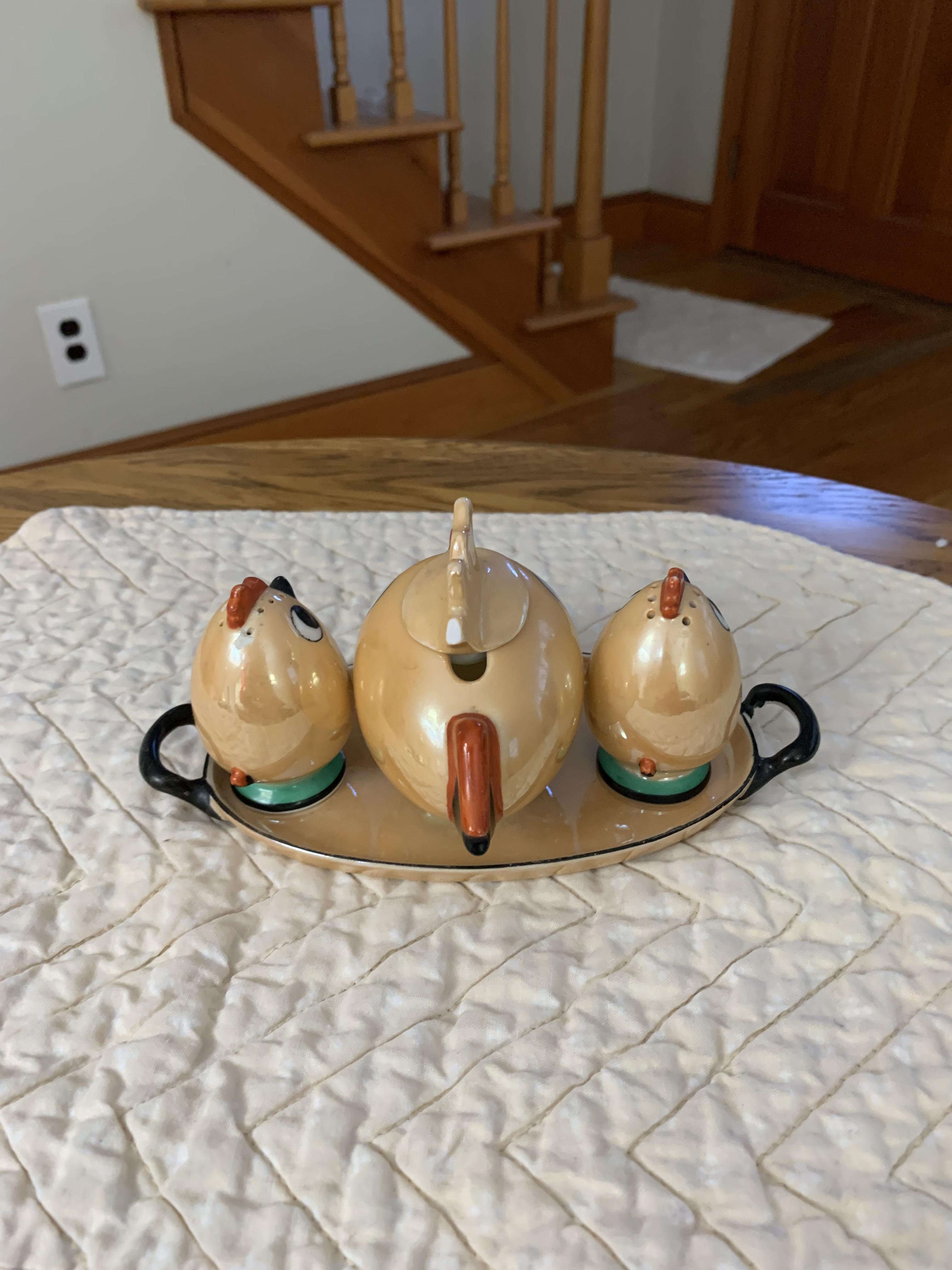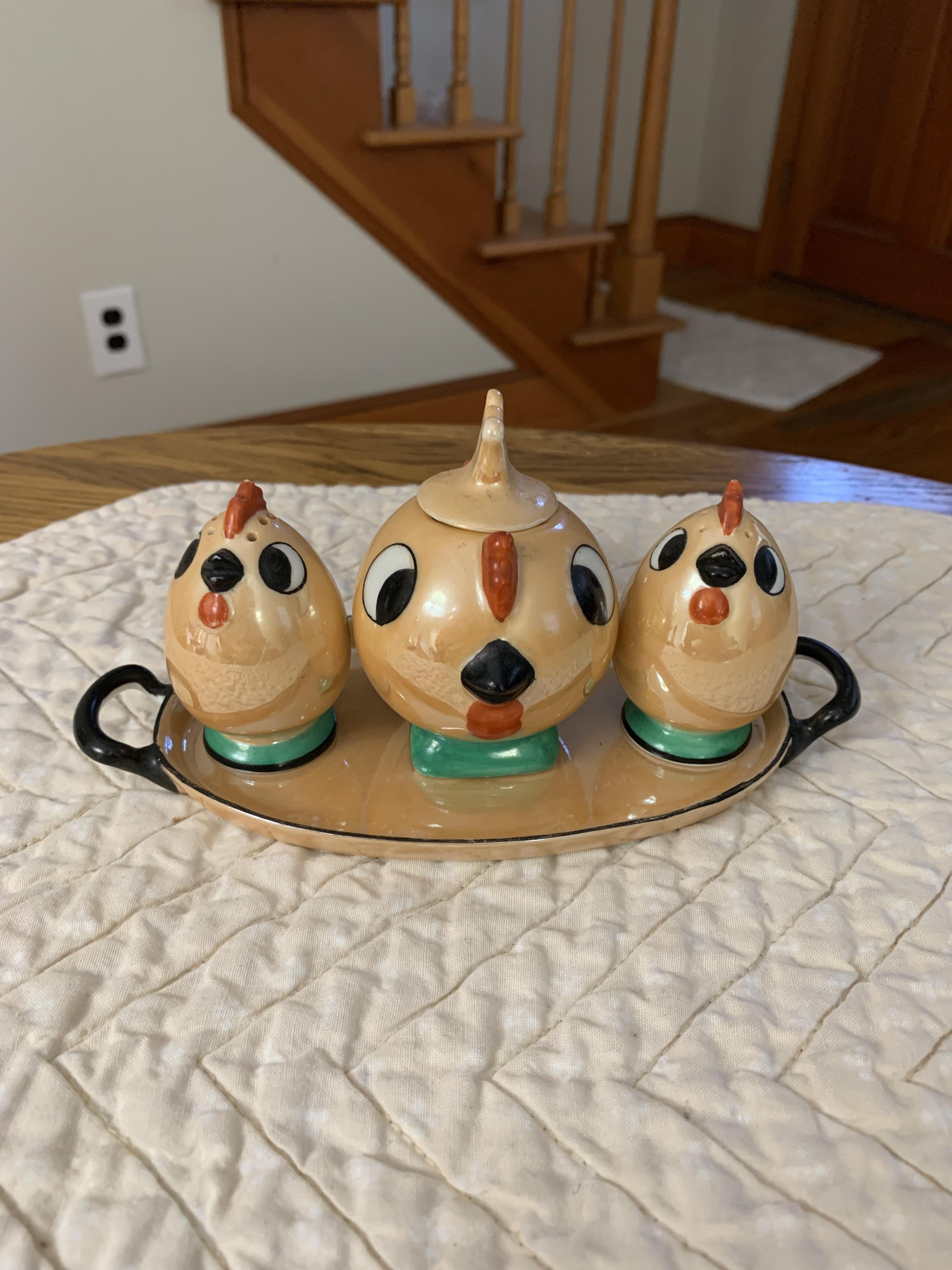 Noritake salt pepper shaker, sugar bowl with tray. Made in Japan. My online research shows that the makers mark is from the 1920’s. I found nothing that looks like this set. Eggs that look like a chicken and her chicks in an Art Deco style.