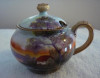 This stackable sugar and creamer has never been used. Both are hand painted in greys and green. There is rural scene with a farm house and haystack. There is delicate details on each of the handles. Underneath the markings include a M surrounded by branches. I am not sure how long this has been in the family or how we acquired it.