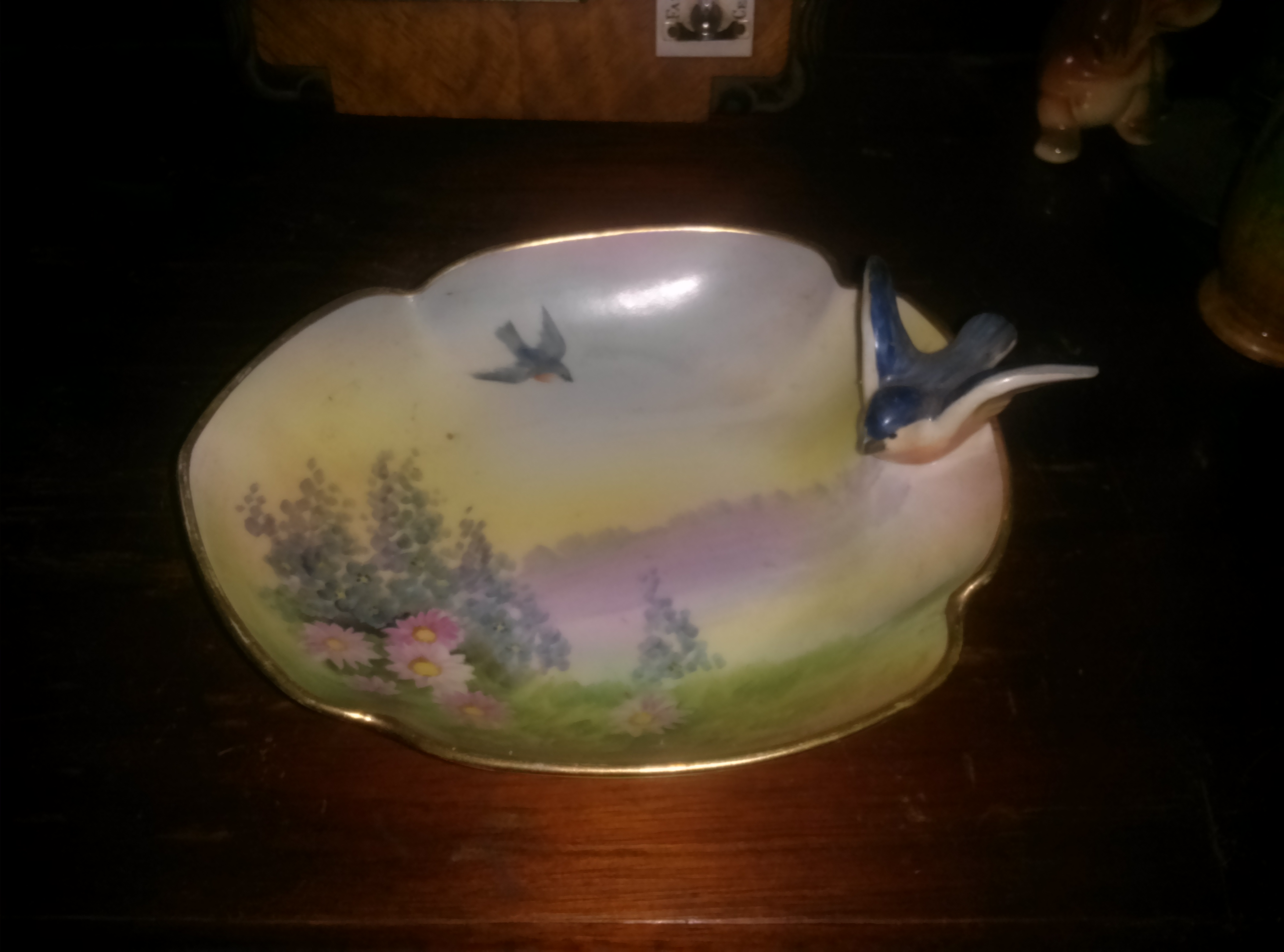 It was my Grandmother's and I know it is very old but not sure of much more. In really nice condition, not a chip or scratch on it. It has a 3D effect (?) as the painting of a swallow on the dish itself is mirrored by an actual figurine on the rim of the dish.